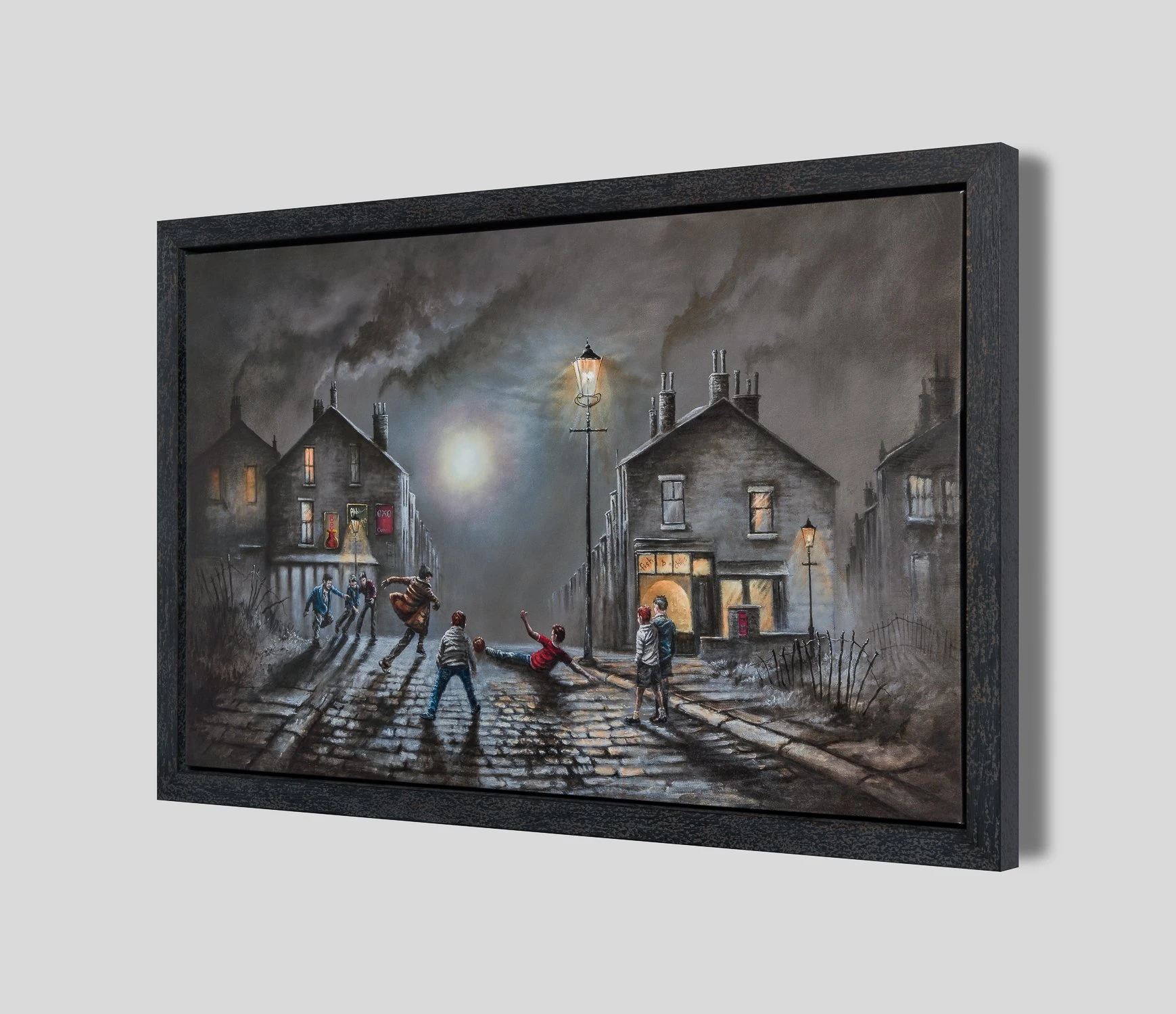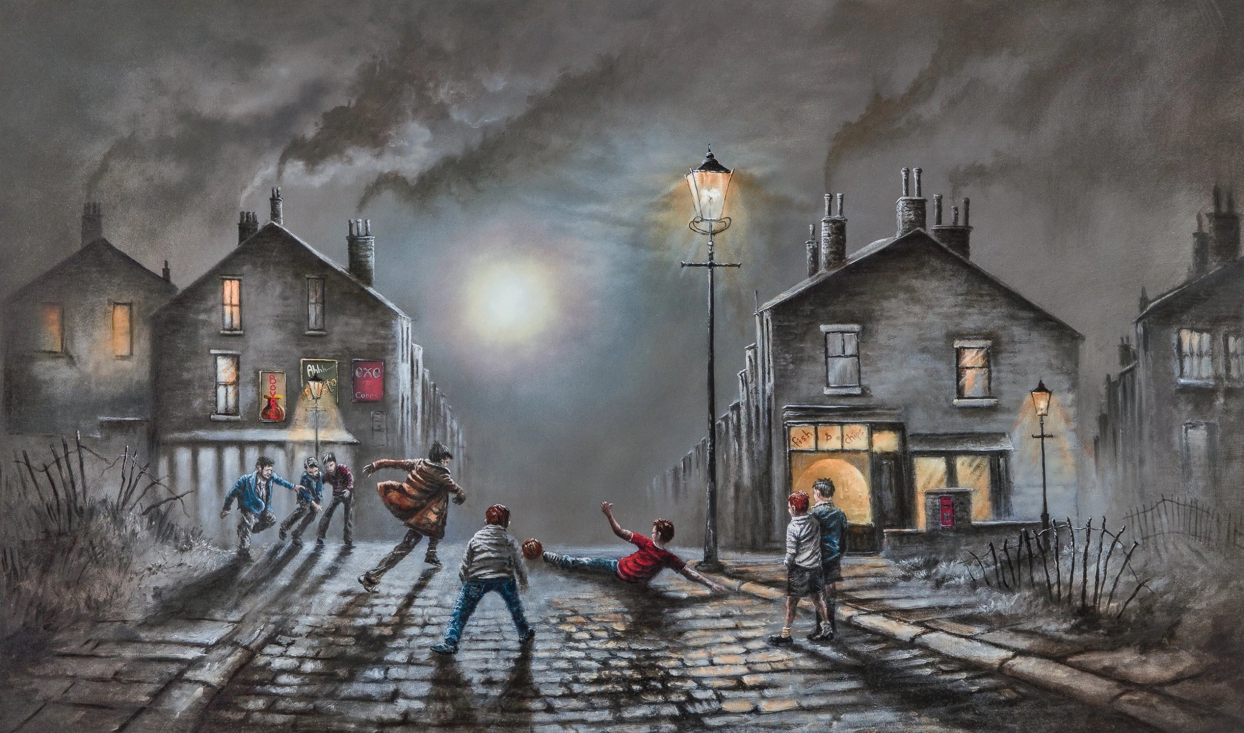 An exciting, extraordinary, and emotional artwork for Bob Barker, this piece pays tribute to a collector of the artist who sadly passed away in 2022 at the age of 40. It continues the narrative seen in the artworks ‘ and ” but, this time, it captures the much-loved British sport of football. Available as a more exclusive edition of 195, this boxed canvas artwork is also a unique and exciting opportunity to acquire a larger artwork from Bob with a bolder framing presentation. Damp cobbles and the subtle light of street lamps, windows and the moon evoke the simple nostalgic memory of playing in the streets with friends. Can you spot the oxo and two other gravy signs in this piece?