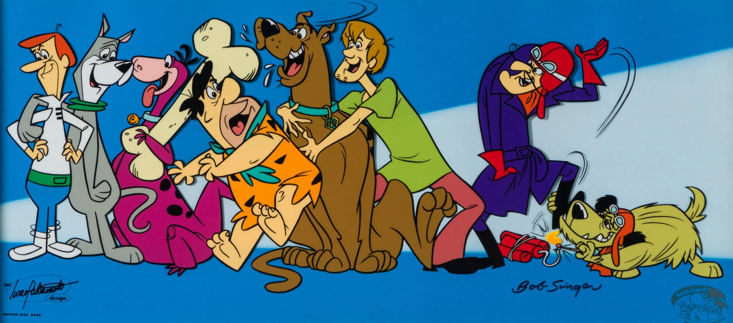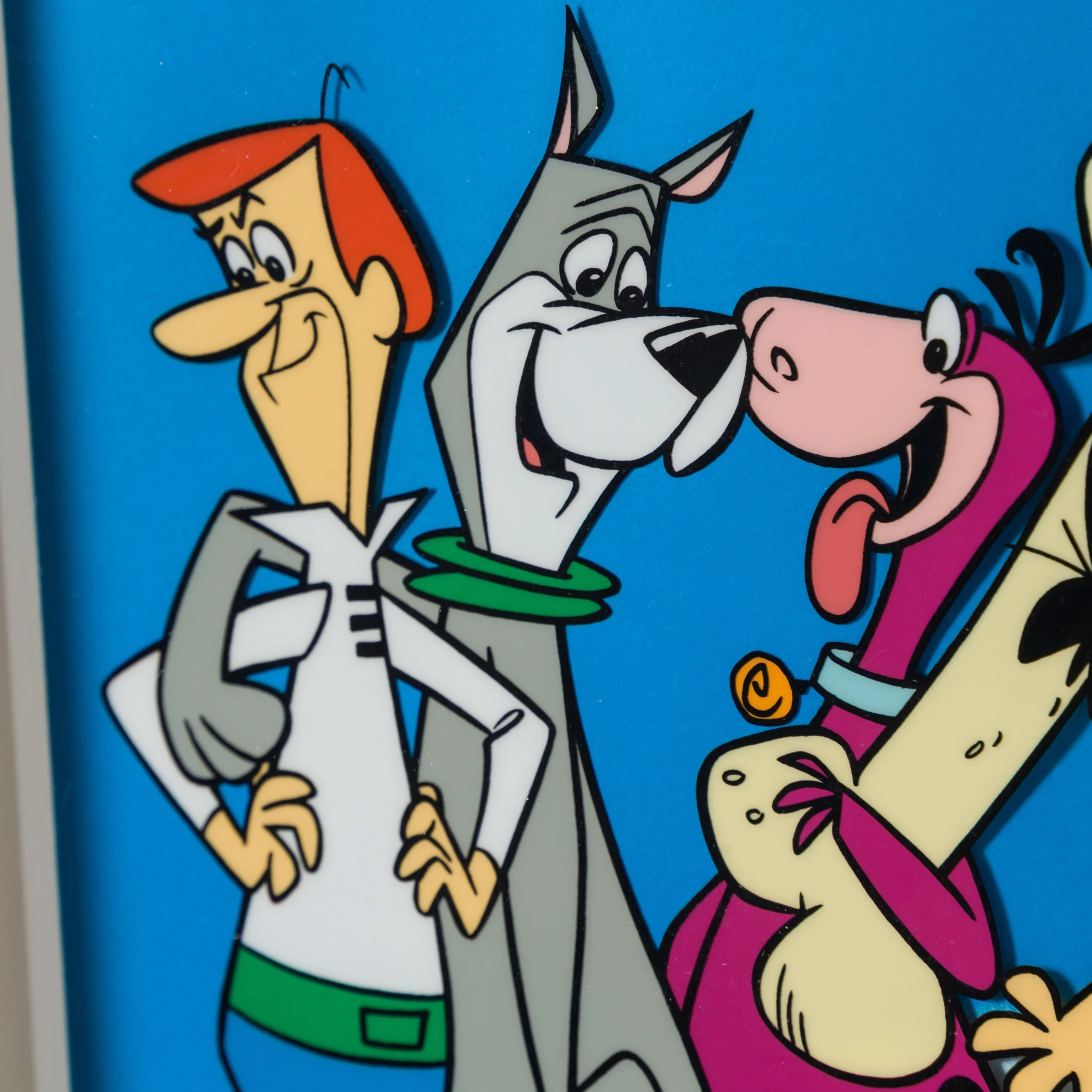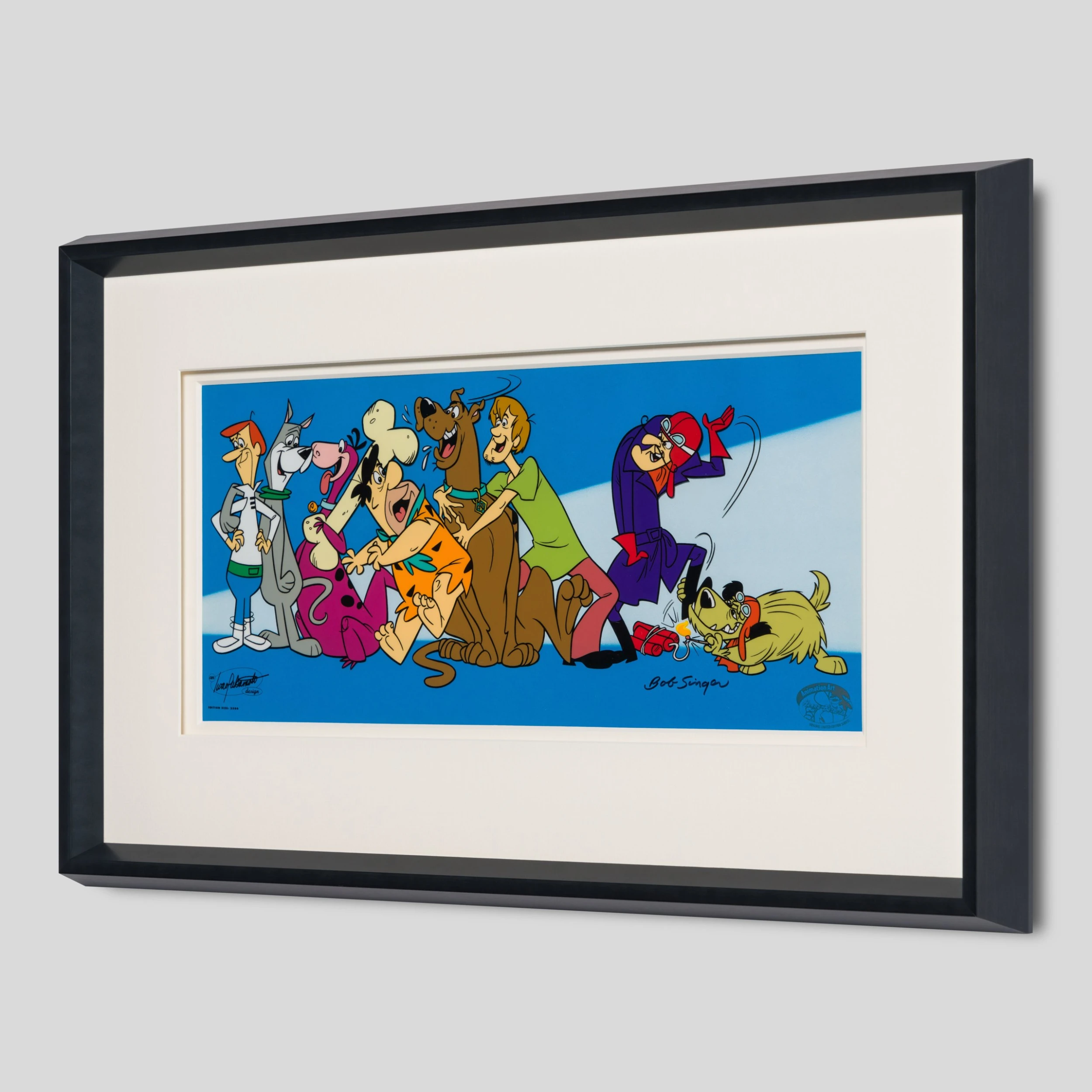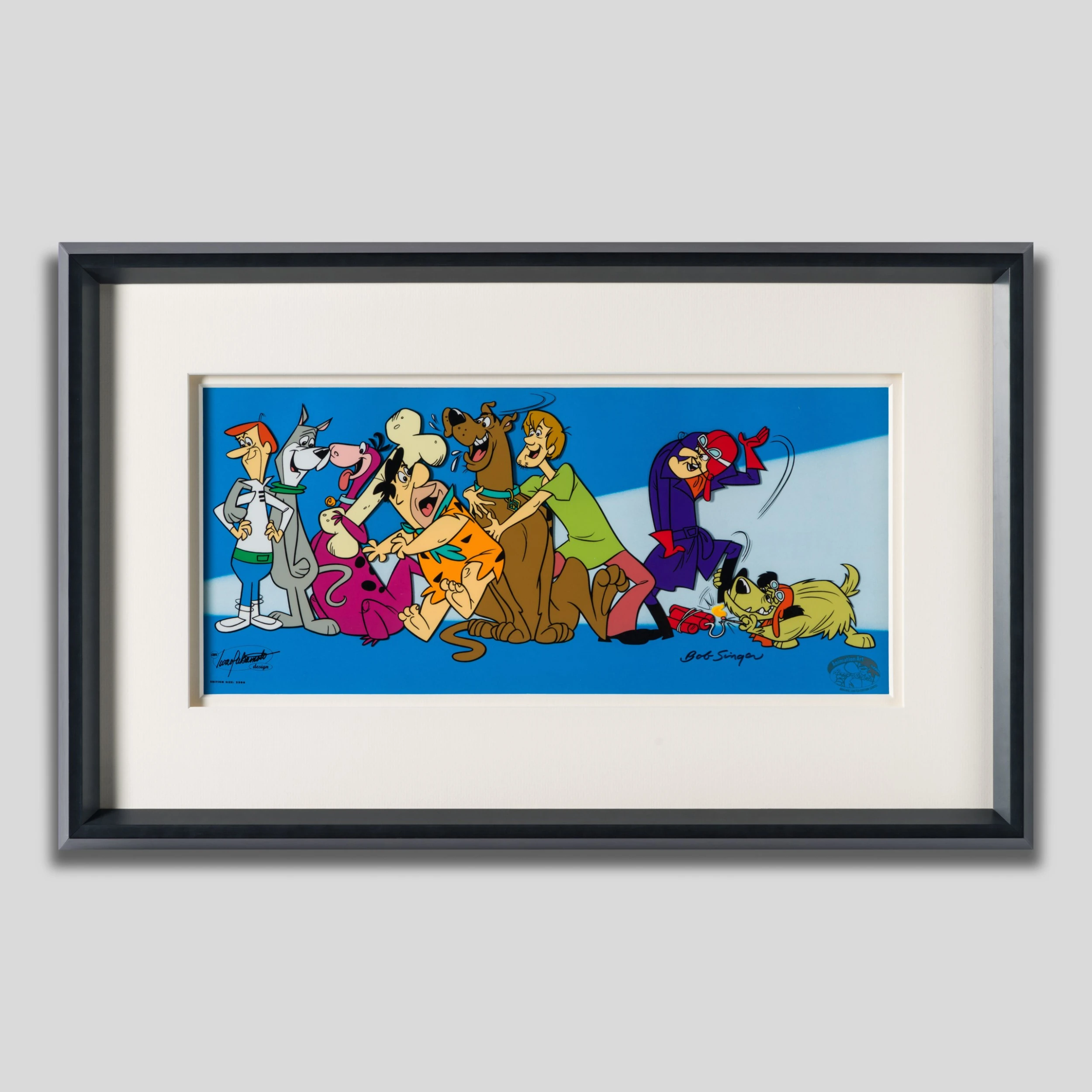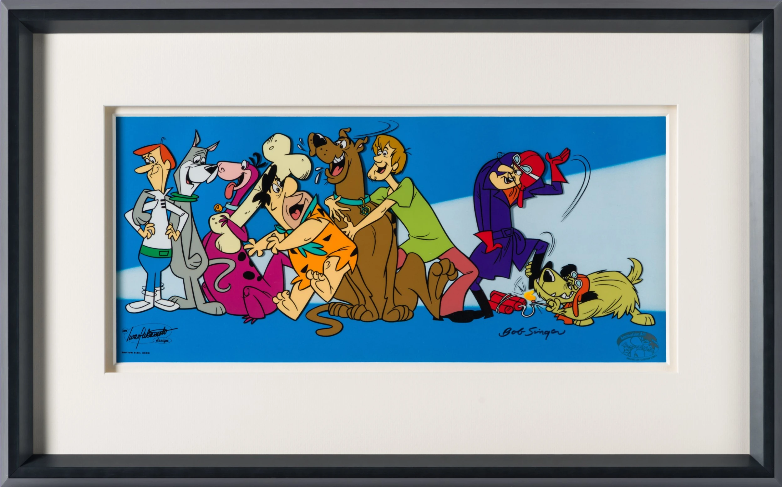Featuring George & Astro, Fred & Dino, Shaggy & Scooby, and Dastardly & Muttley, this limited edition serigraph cel mounted on a printed background comes framed in glass, charcoal pine and spruce wood and hand-signed by animator legend, Bob Singer.