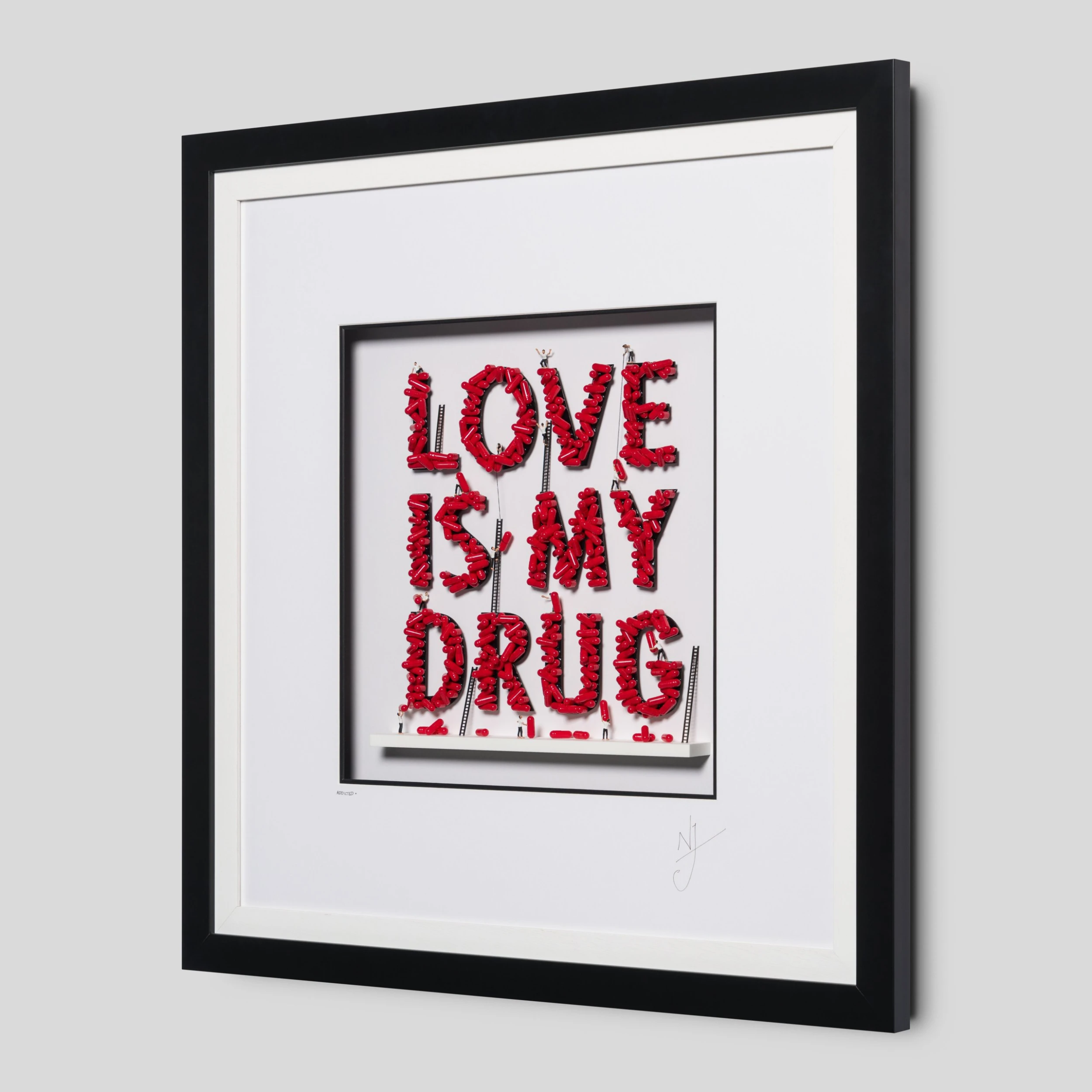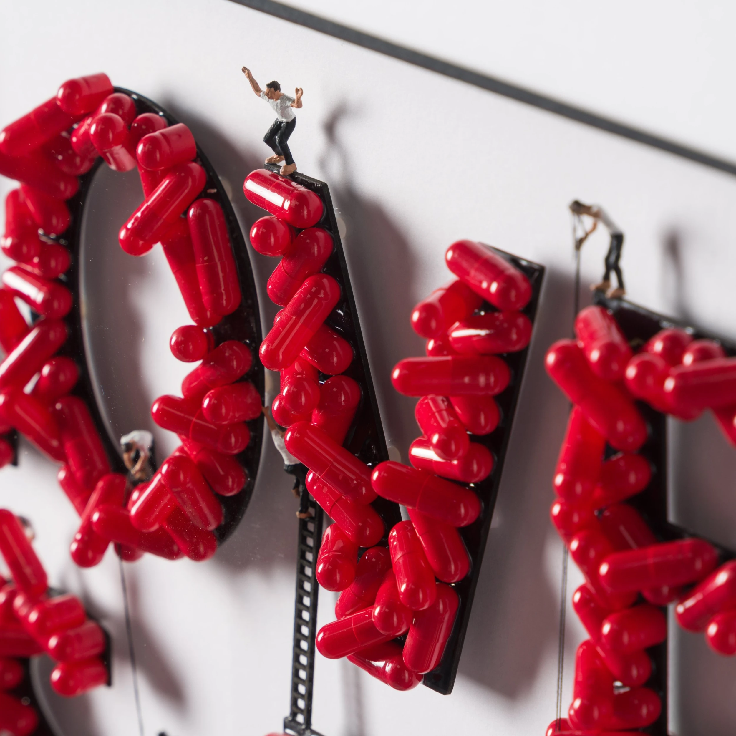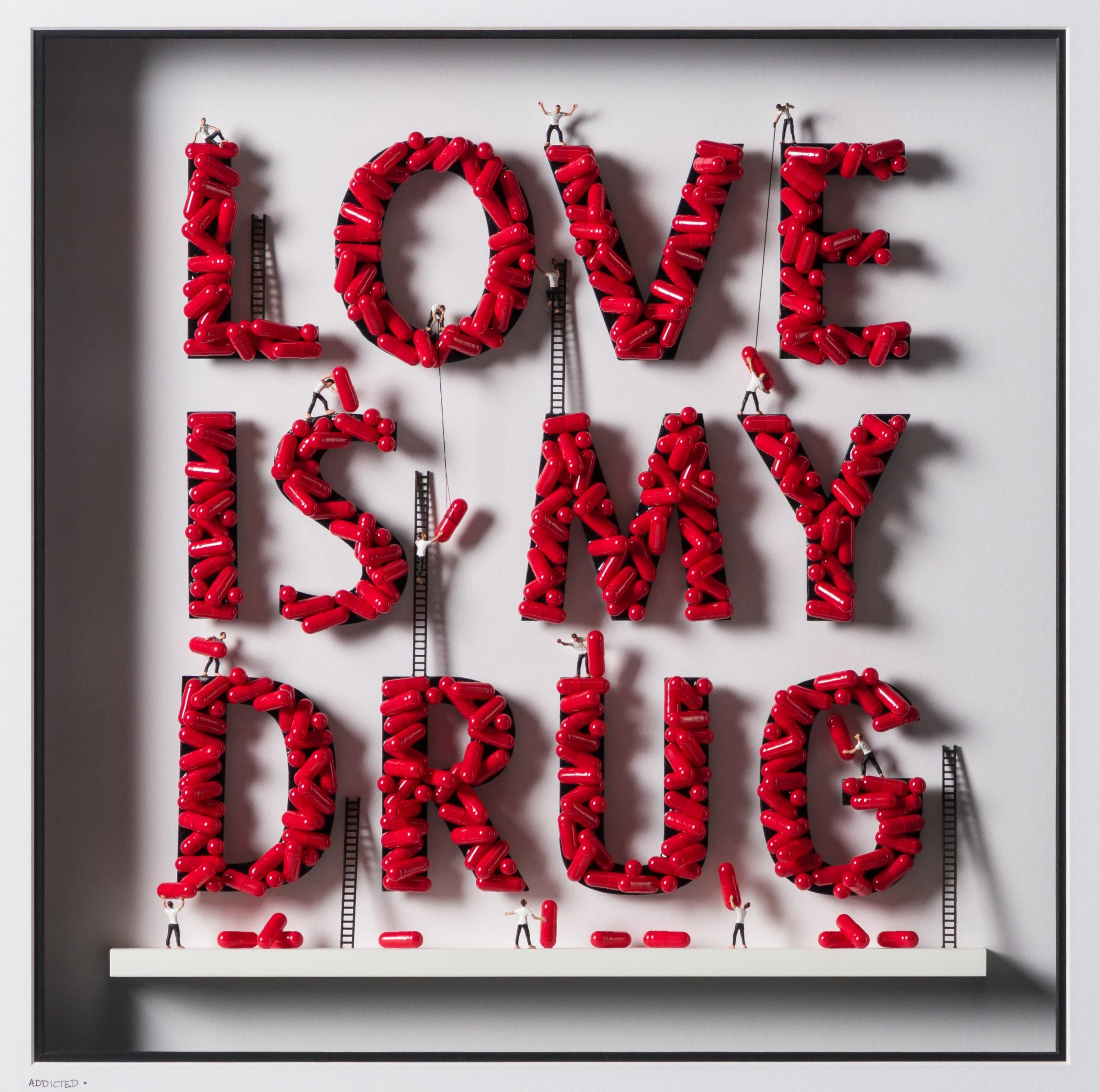 In his iconic wall sculptures, creates humorous depictions of everyday life, and the vices of the modern world are combined with touching explorations of subjects such as mental health. In this piece, the artist created a composition with a sign quoting “Love is my Drug” being assembled by his figurines in red empty pills. Representing that “love is more addictive than any substance”, Nic believes that love is the best drug.
