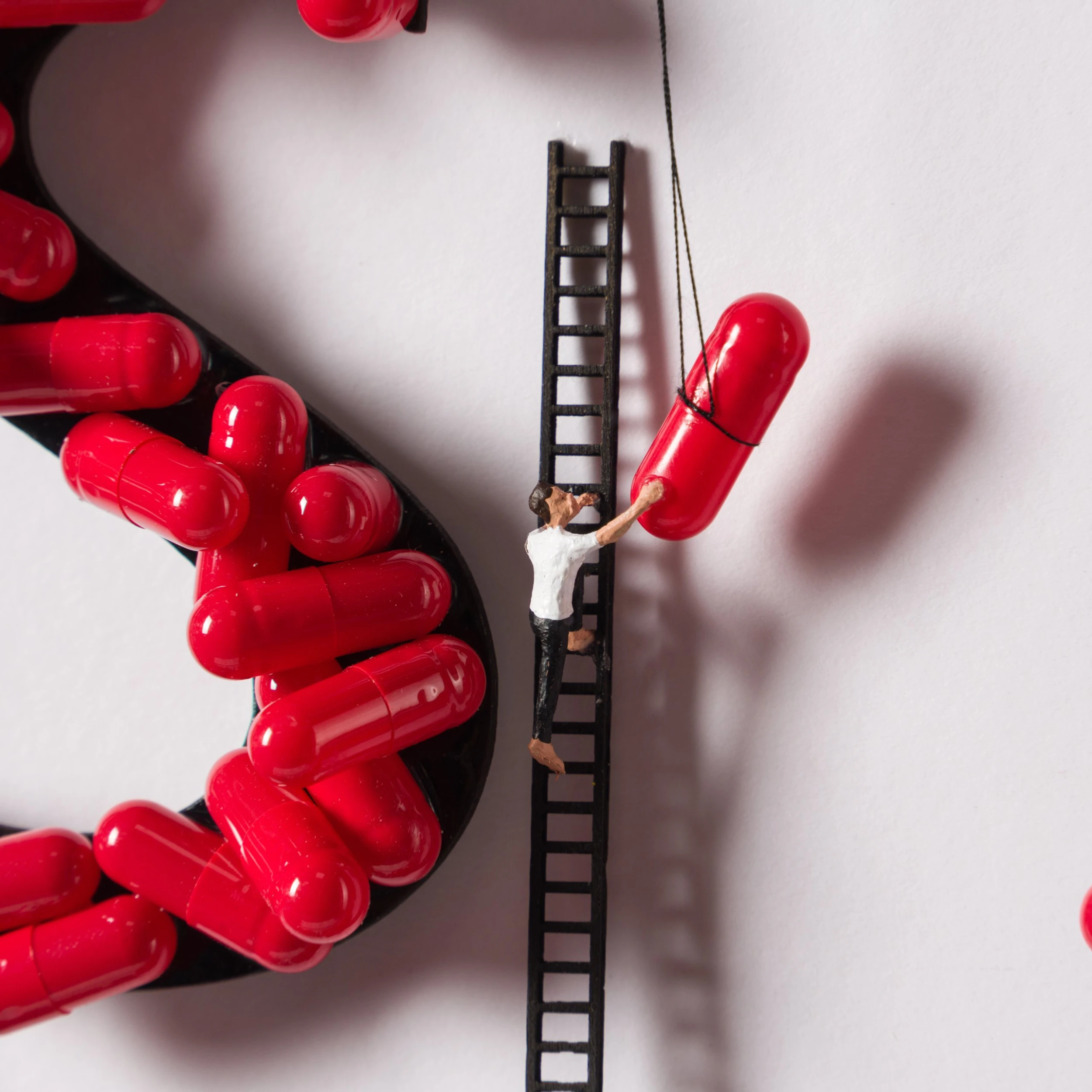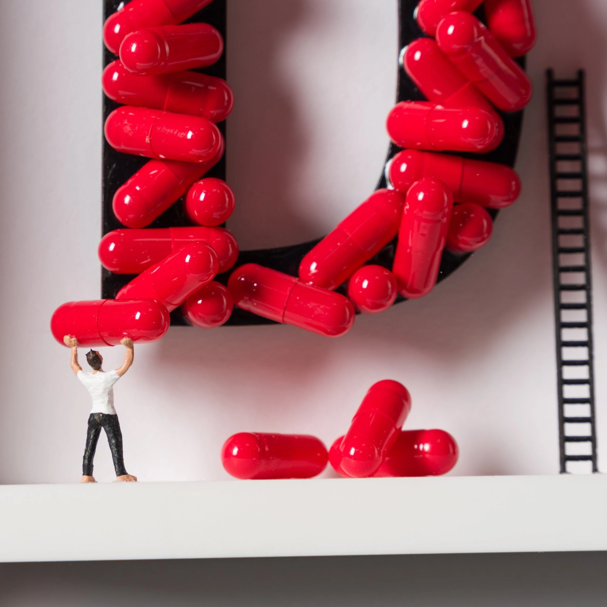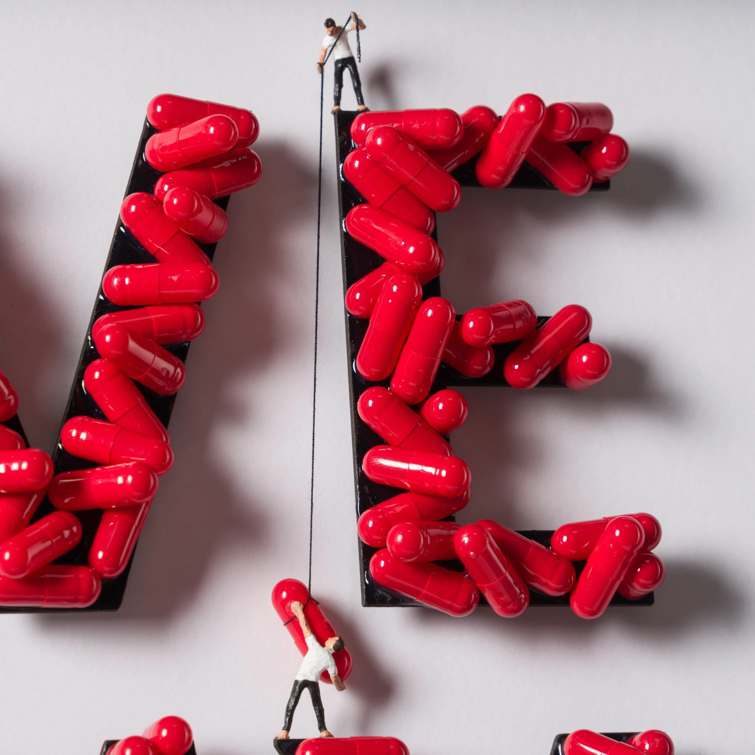 In his iconic wall sculptures, creates humorous depictions of everyday life, and the vices of the modern world are combined with touching explorations of subjects such as mental health. In this piece, the artist created a composition with a sign quoting “Love is my Drug” being assembled by his figurines in red empty pills. Representing that “love is more addictive than any substance”, Nic believes that love is the best drug.