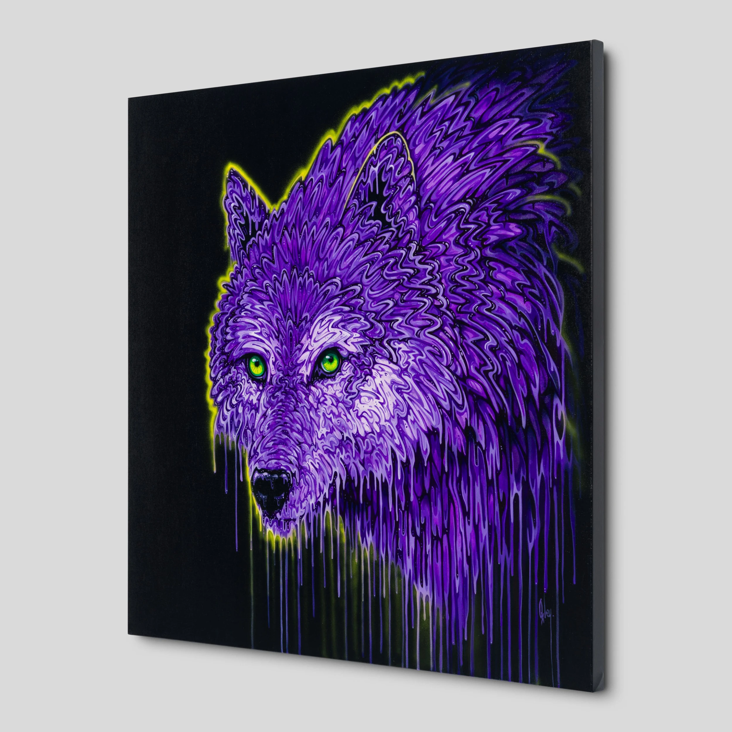 The traditional colours of a wolf are overthrown by exciting shades of purple, transforming the animal into an “ethereal, astral” being through his kaleidoscopic use of colour and form. The strong shades of purple contrast beautifully with the green highlighted by the black background.