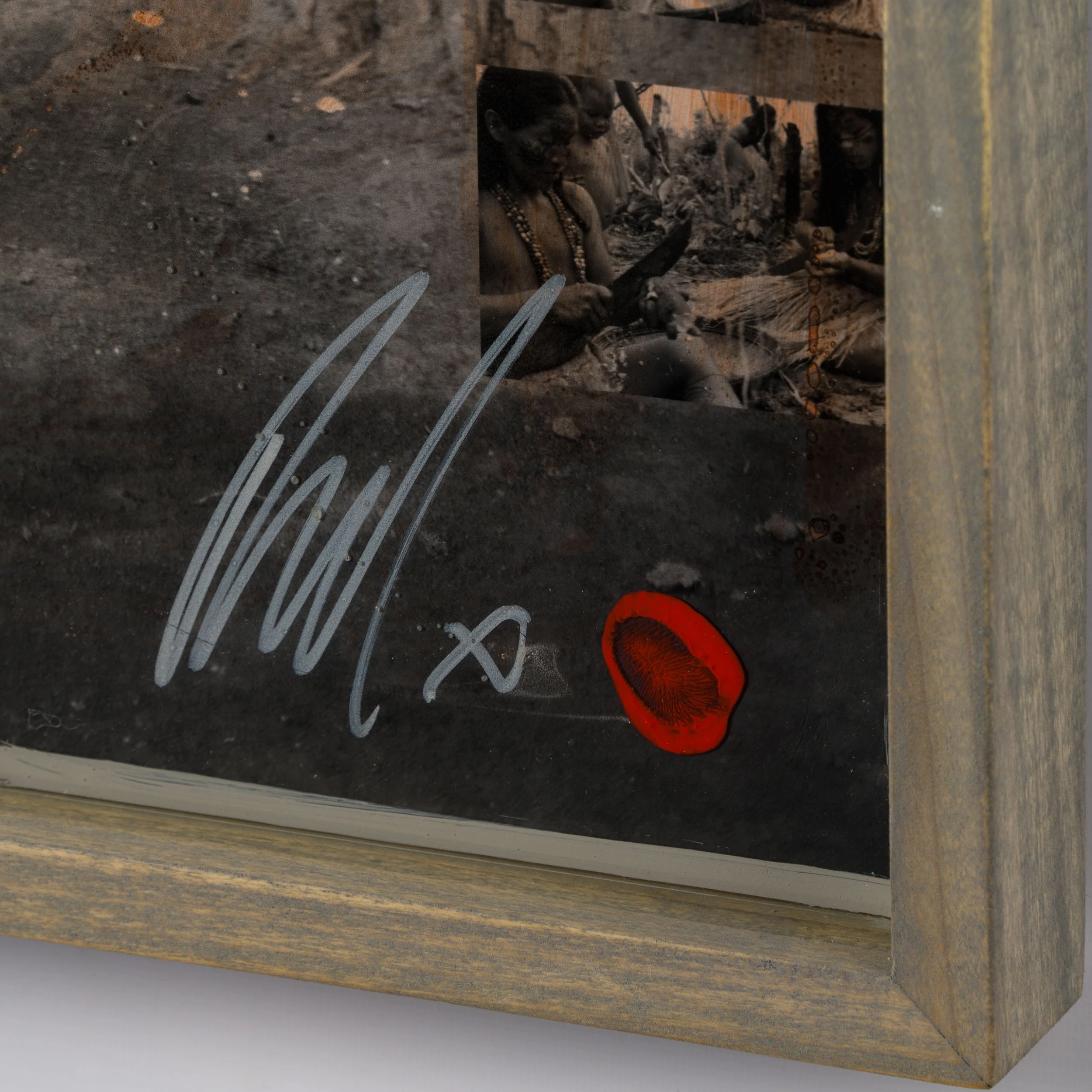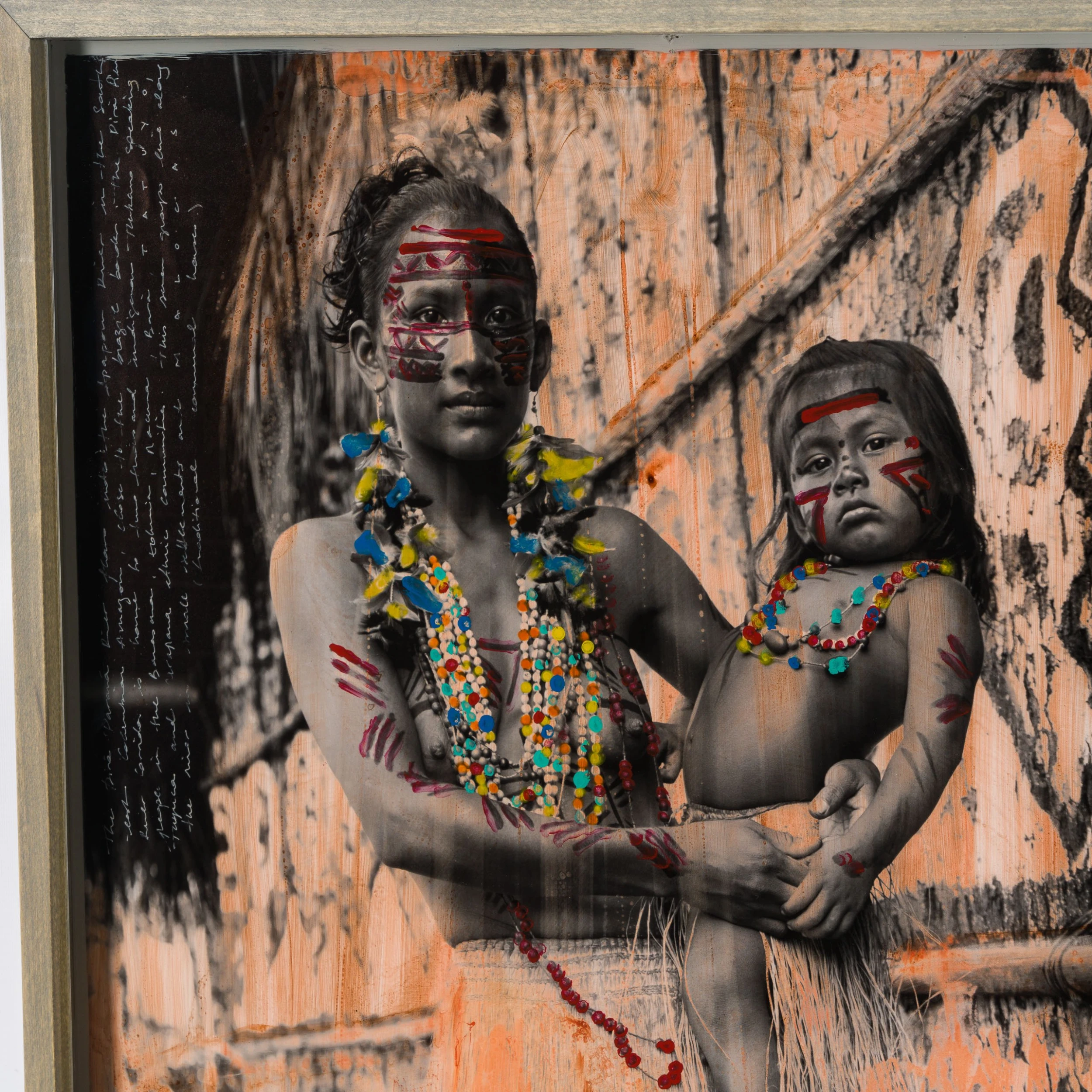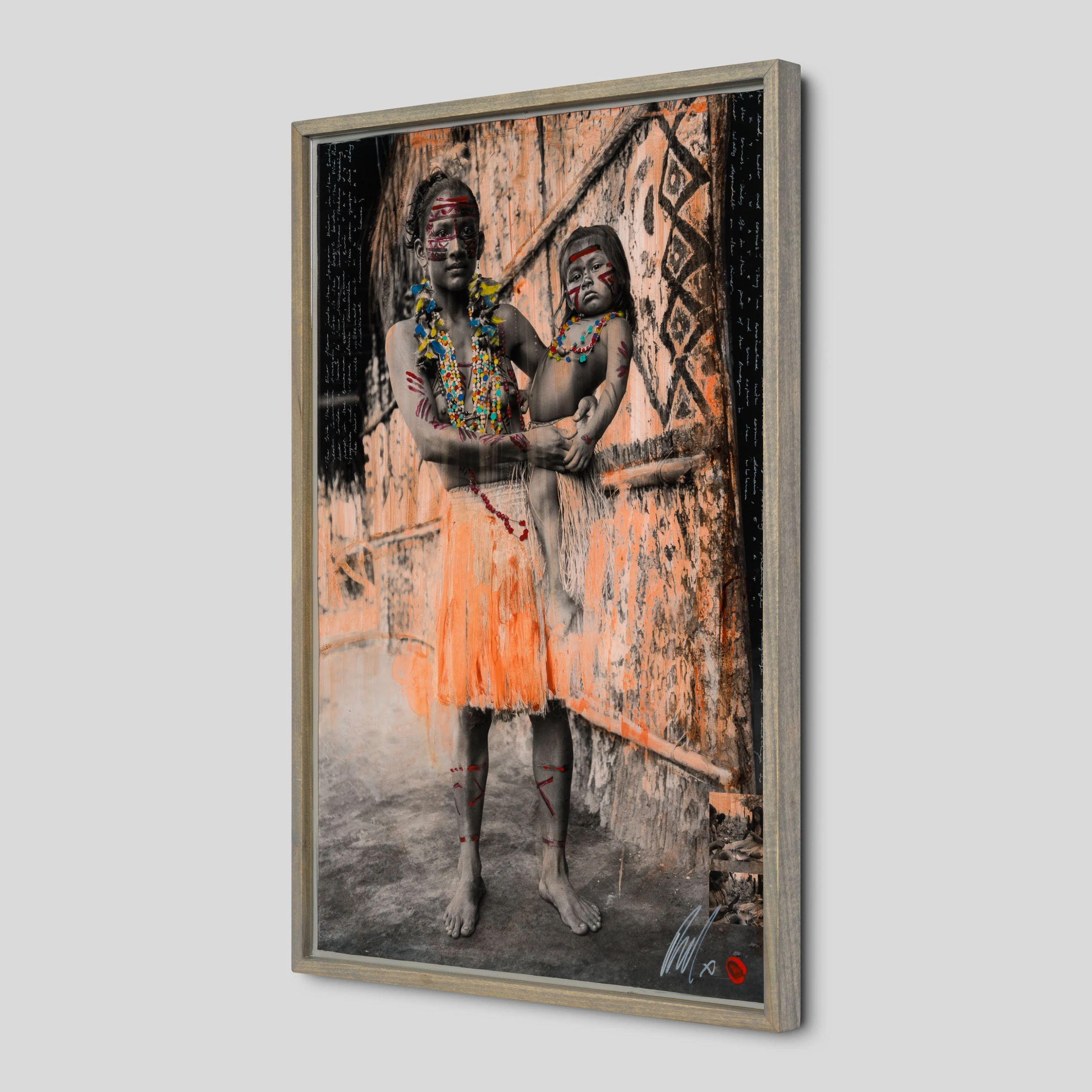 With Moroccan pigments and Vietnamese paints, Mazzucco’s pieces are characterised by the juxtaposition between wildlife and cultural photography, this incredible piece forms part of his introspective collection Grass Roots 2023. “Amor de Mãe (Mothers Love)” features photography mainly in sepia earthy tones, enhancing the raw beauty of the images. The piece tells a story in layers. The overlaying of photography, paint, handwriting, and resin adds life into the composition, creating a statement original. The pops of orange added sporadically throughout the composition create the spontaneous dynamic that this wildlife piece represents. The use of different images sizes and its repetition create the intrinsic depth, characteristic of Mazzucco’s originals.