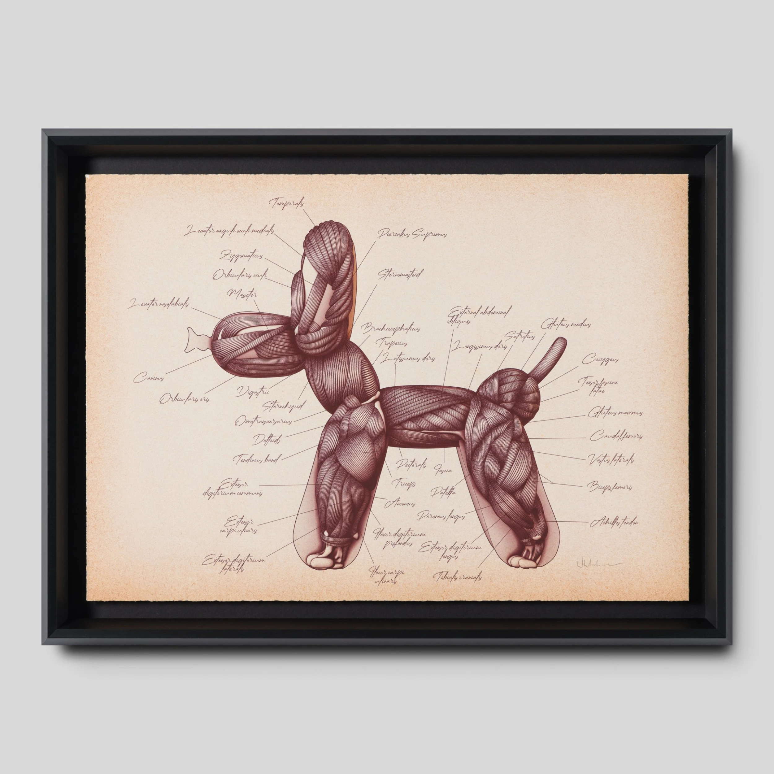 From the marvellous mind of elusive artist Whatshisname, we see the the insides of one of his famous balloon dog sculptures! Portrayed in an antique style, we also see amusing annotations and medical illustration that harness the modern satire of his contemporary pop pieces.ย