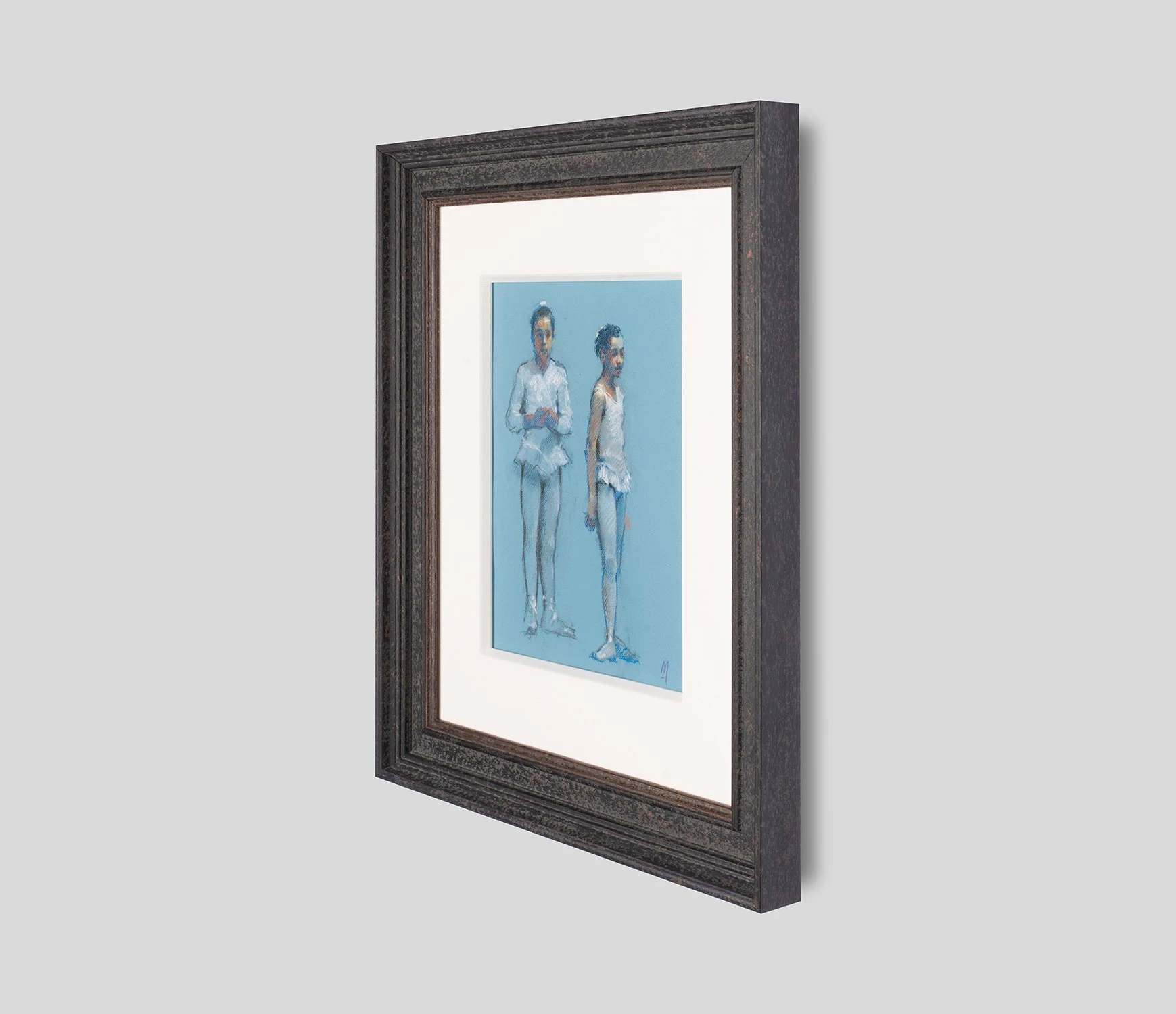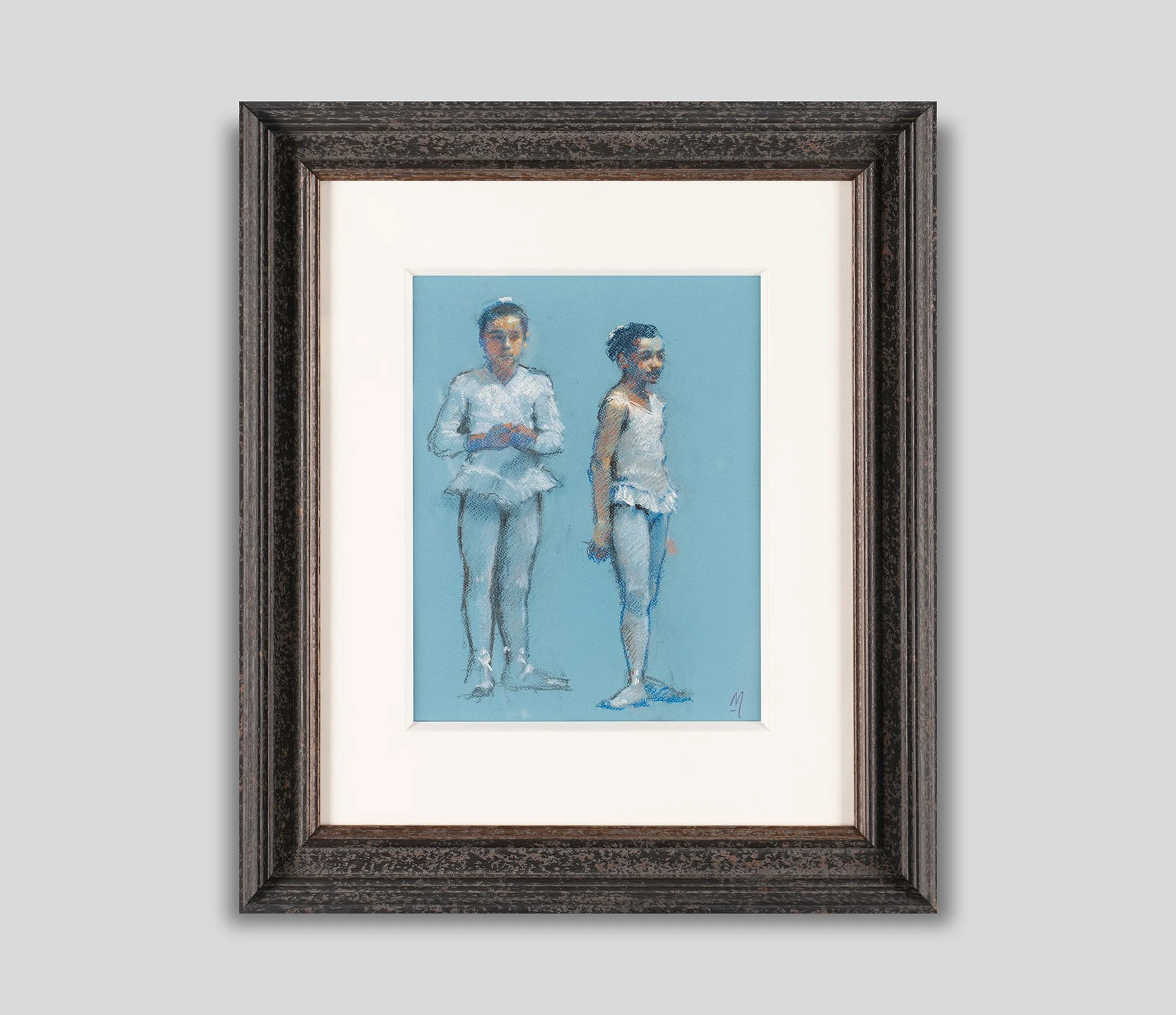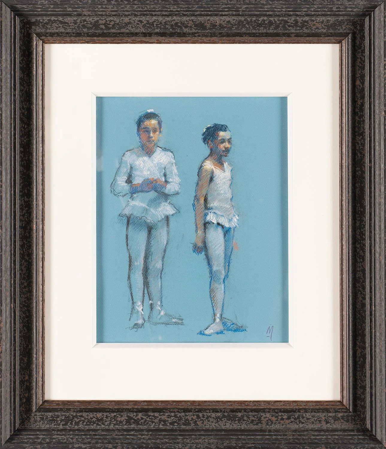 Working primarily in oil paints, this original artwork sees Nigel Mason enter the realm of pastels which was popularised by Edgar Degas in the 19th century. Much like Degas, Nigel has also focused on how light and space interact with the ballerina forms rather than how they interact with the space. Â