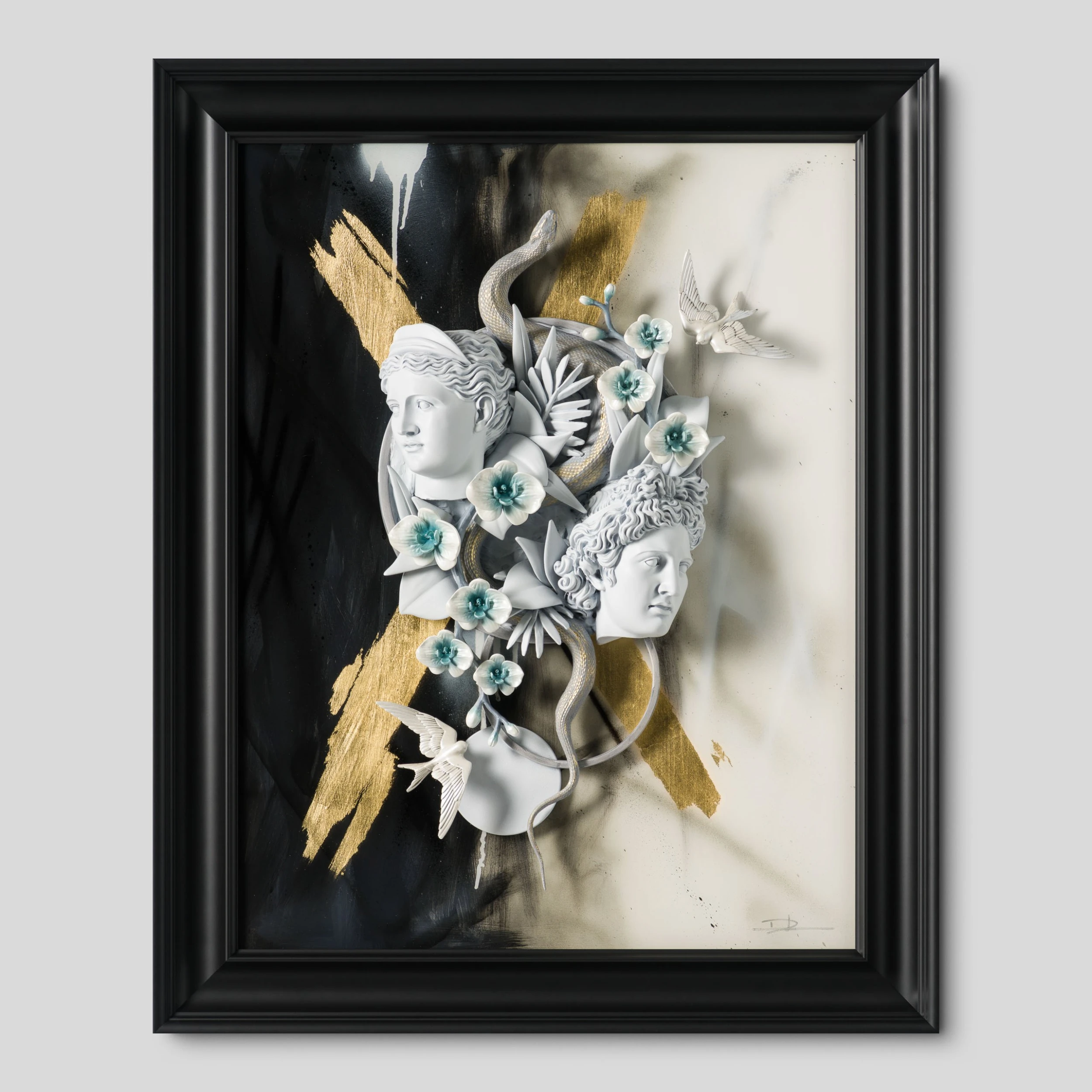 In this bold and luxurious original, Dan Lane revisits some of his beloved themes from his earlier work. In “Apollo And Artemis”, the artist fuses his classical baroque sculpture style and the drama they convey with his own style and its iconic elements. Whilst the piece is bold and dramatic, the title evokes an element of humbleness and simplicity.
