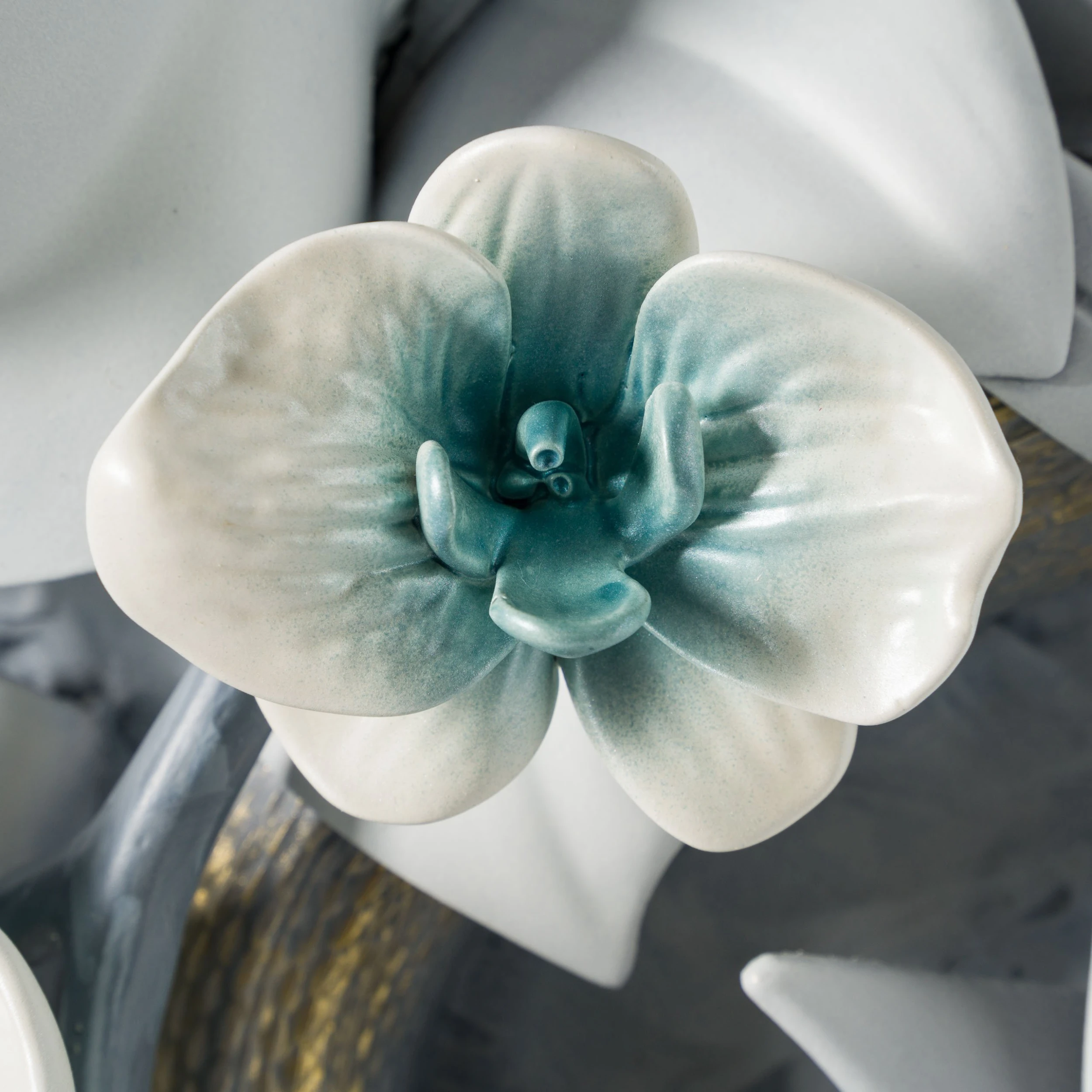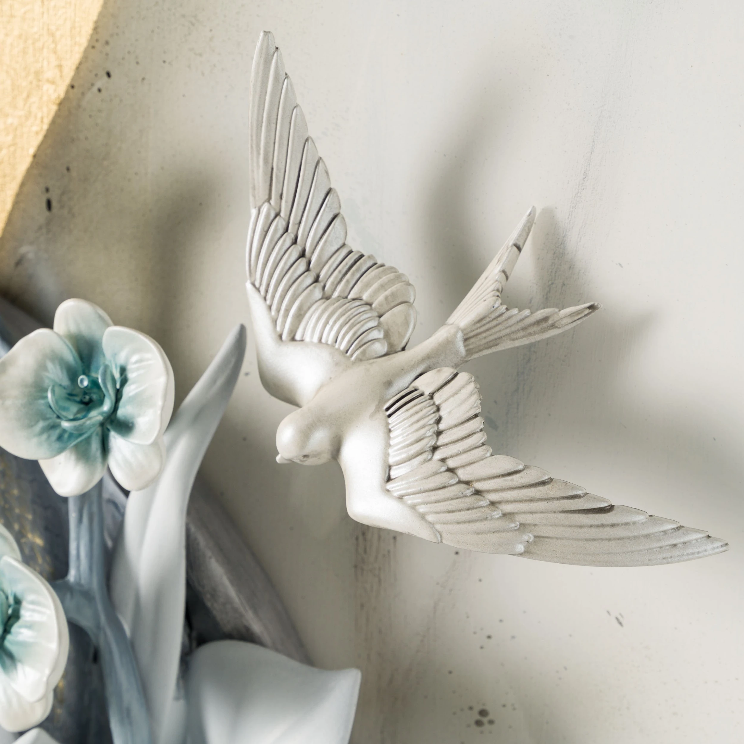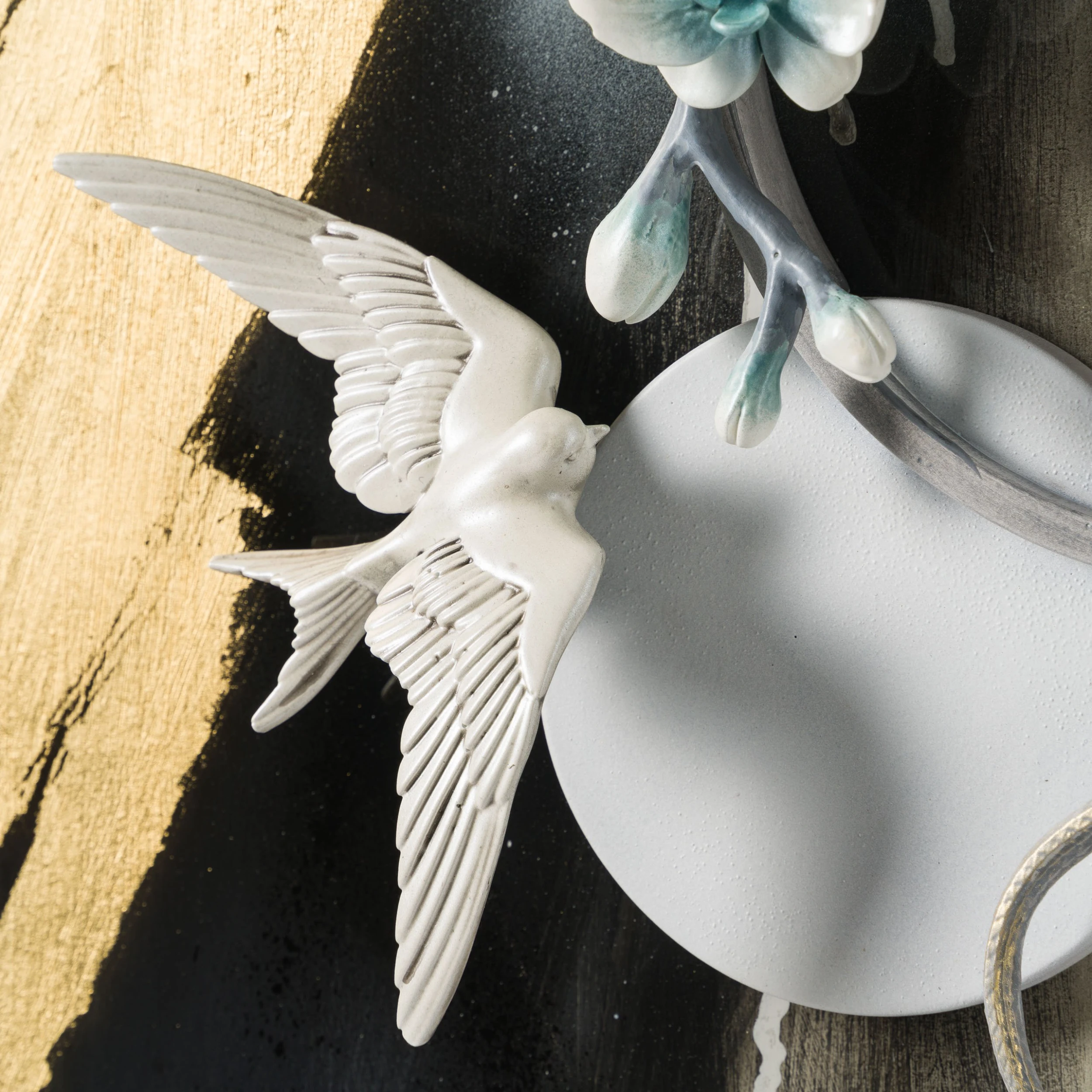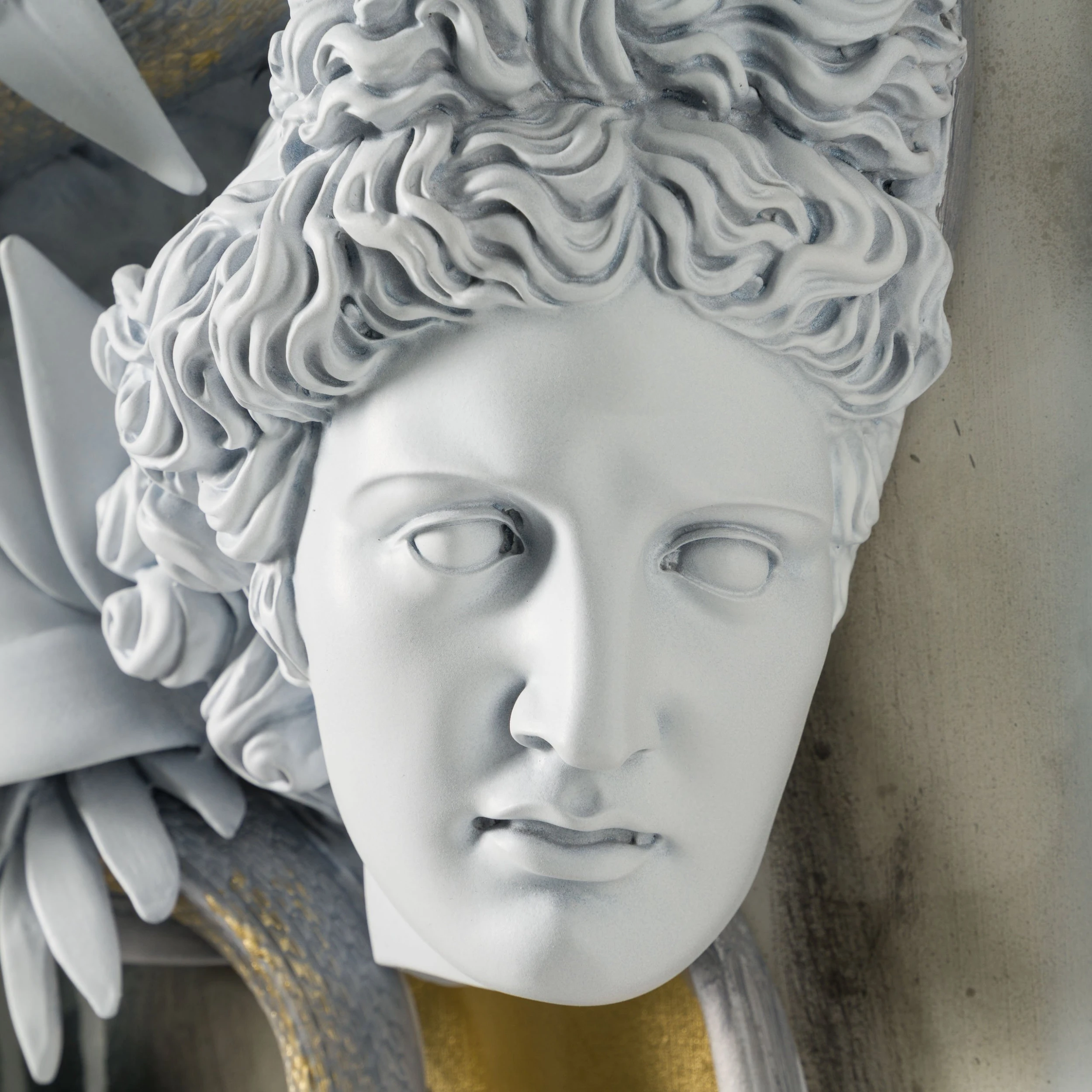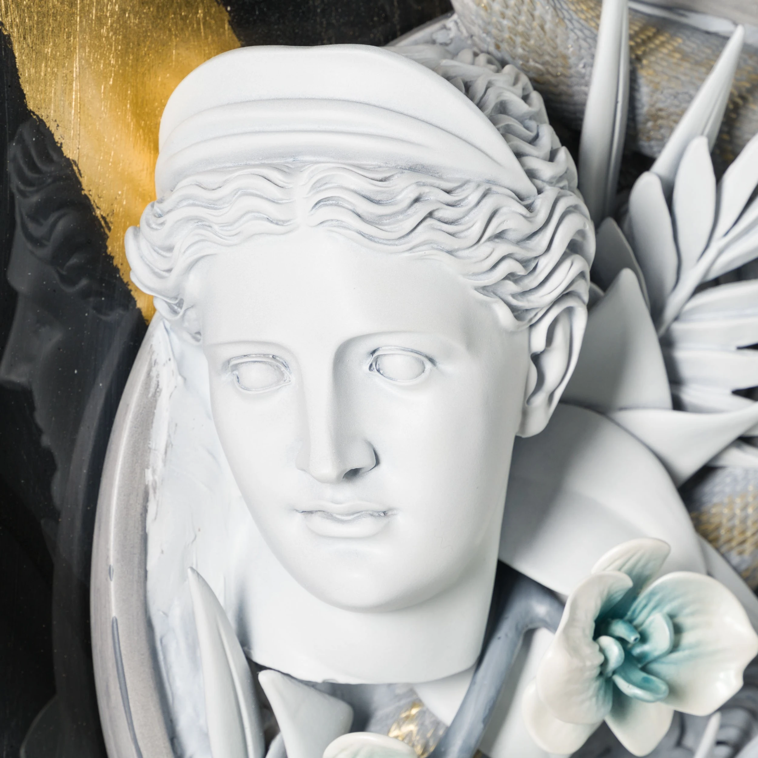 Named after the divine archers from Greek mythology, Apollo and Artemis were twins and although similar in some ways, they were opposites of one another. Whilst Apollo symbolised the sun and day, Artemis represented the moon and the night. The divine twins were two sides of the same coin – different and inseparable. The wall sculpture resembles the portraits of some of the most classical works from Baroque and Renaissance masters whilst featuring the artist most popular symbols – the flowers, the hummingbird and the gold elements.