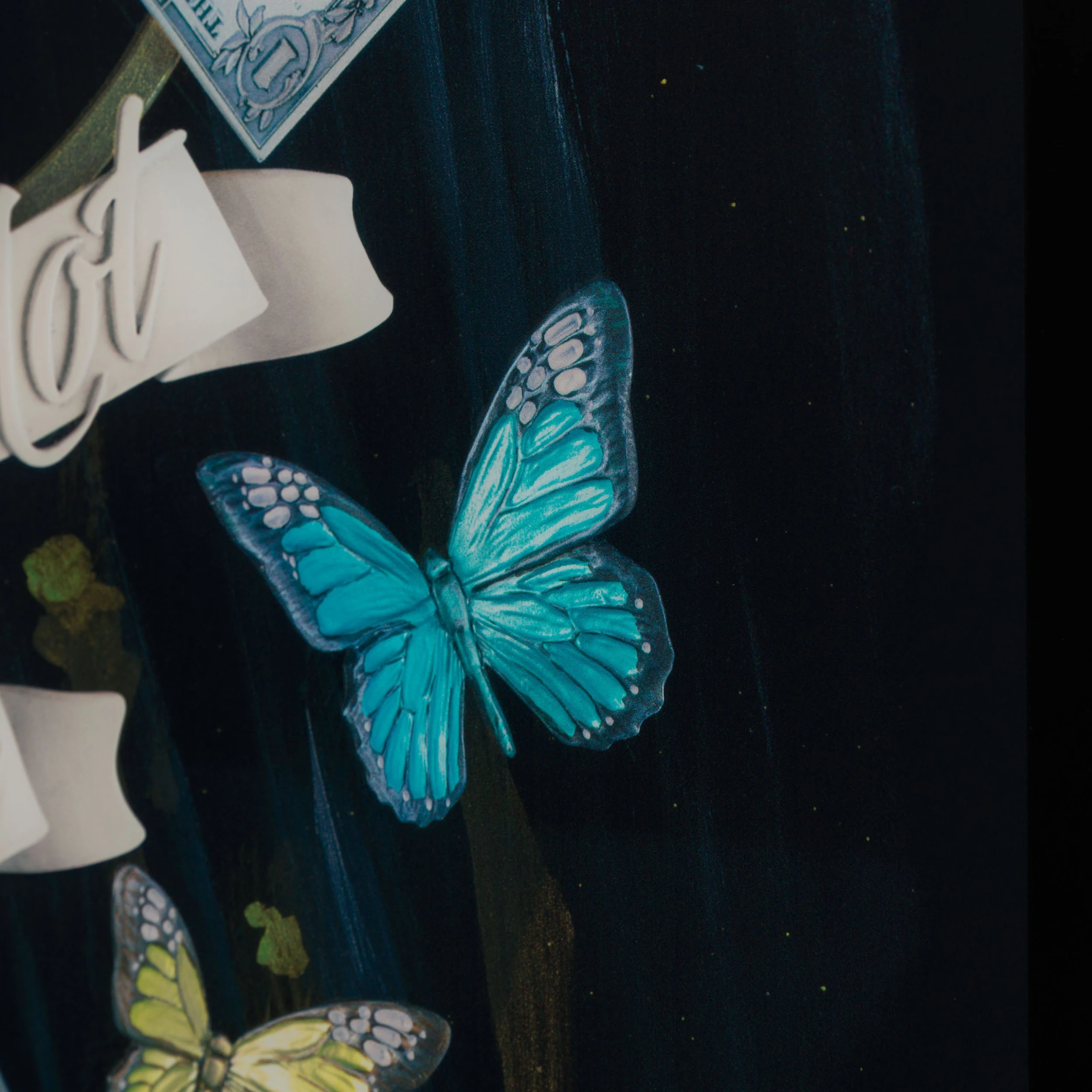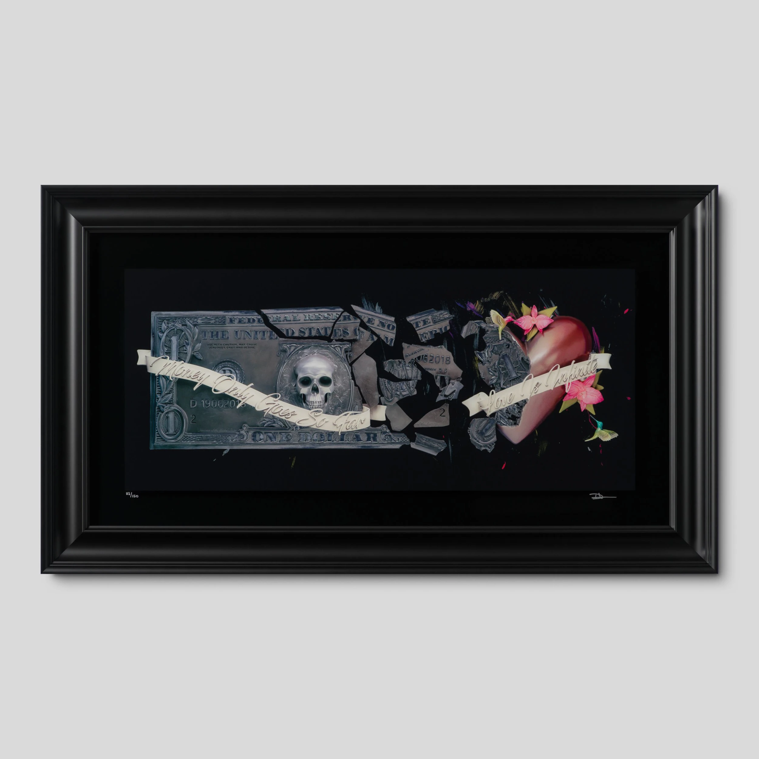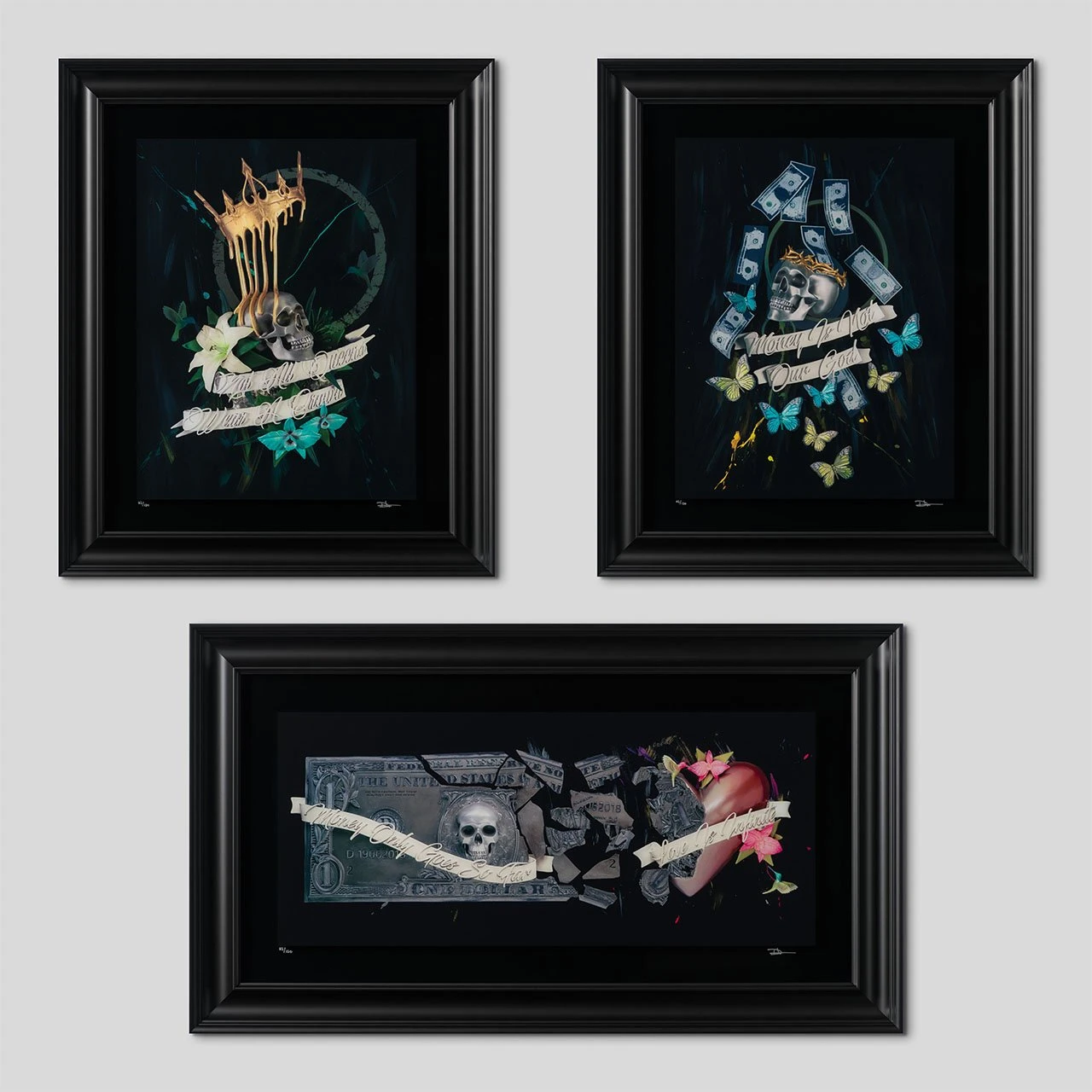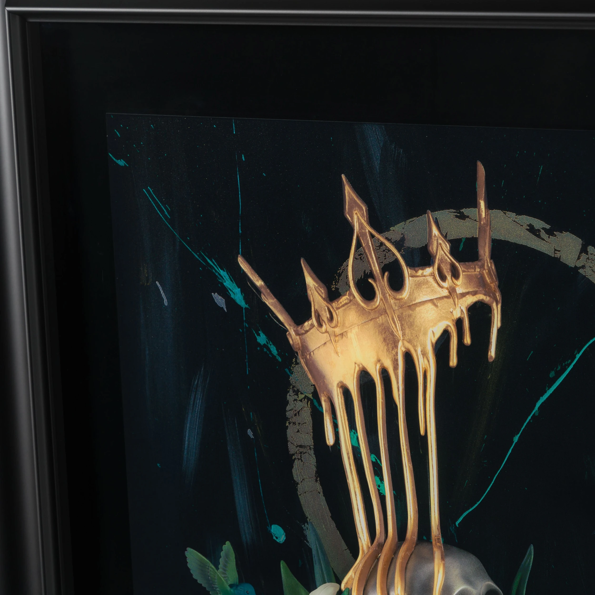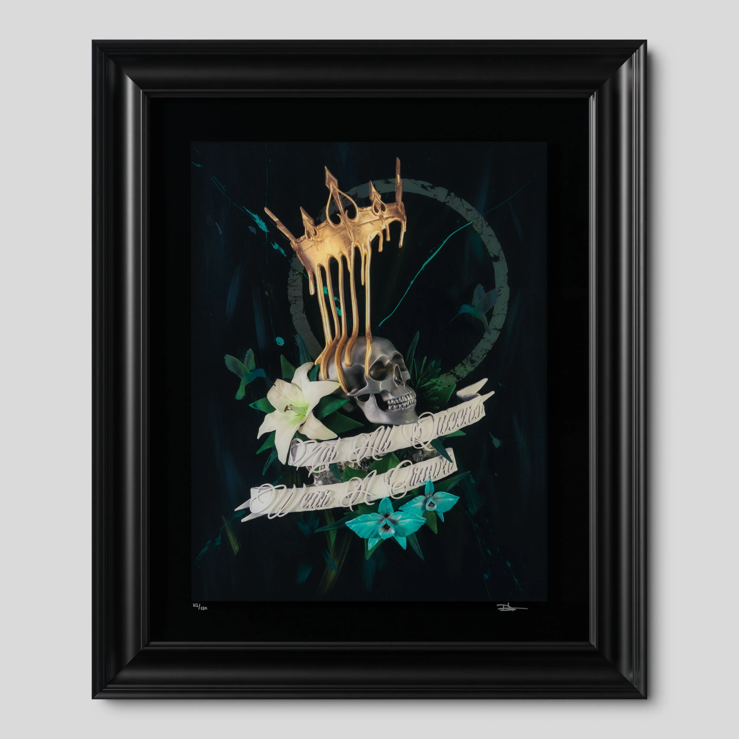 Created for the artist “Chaos & Order” show, in the elegantly portrayed on glass, hand signed bold limited editions, Dan Lane revisits some of his beloved themes from his earlier work. The artist fuses his classical baroque sculpture style and the drama they convey with his own style and its iconic elements. The dark and thoughtful artworks are full of contrasting details, incorporating elements in a balanced way, from incredibly detailed and gothic skulls to Roman and Greek mythology references to lightness and colour in flowers and hummingbirds.