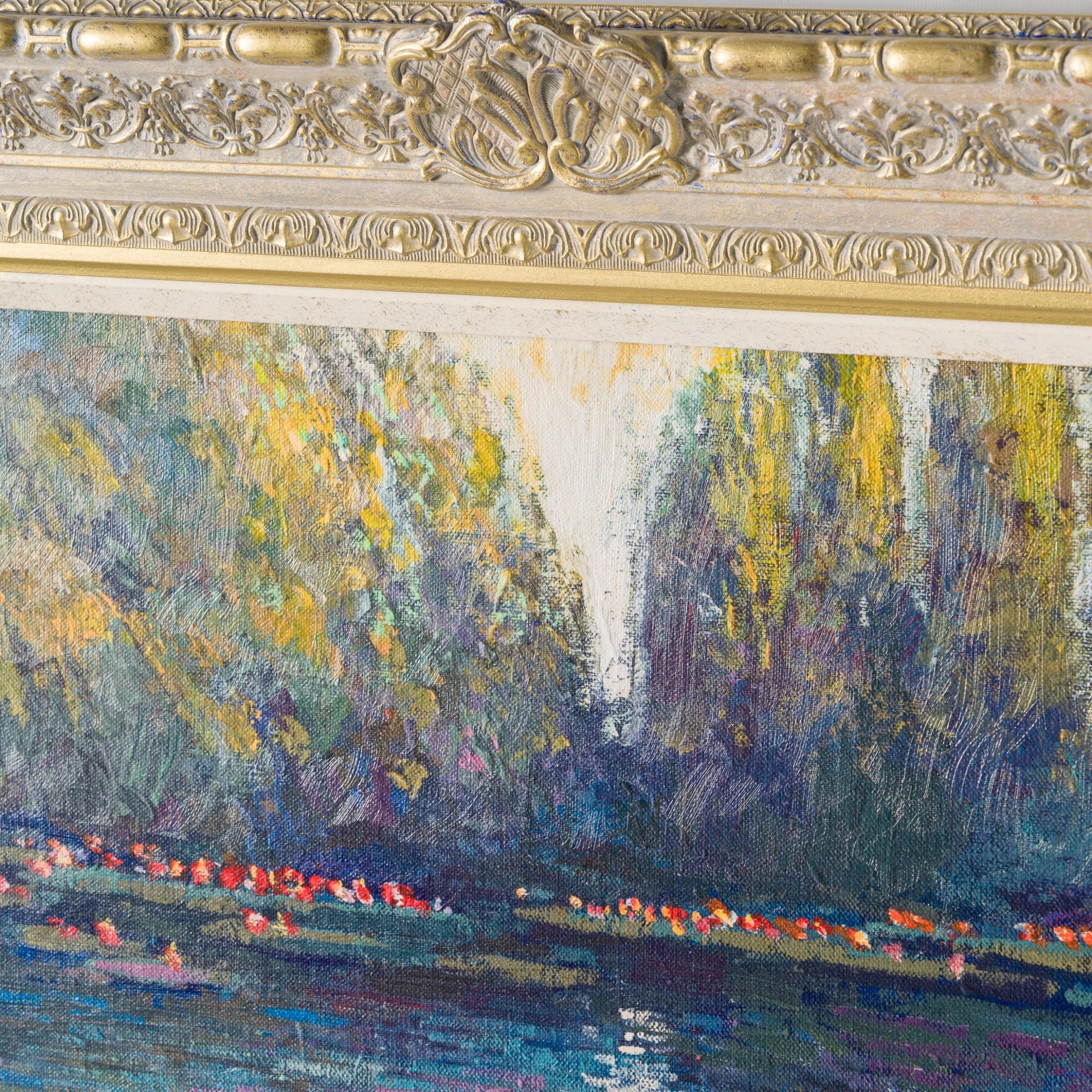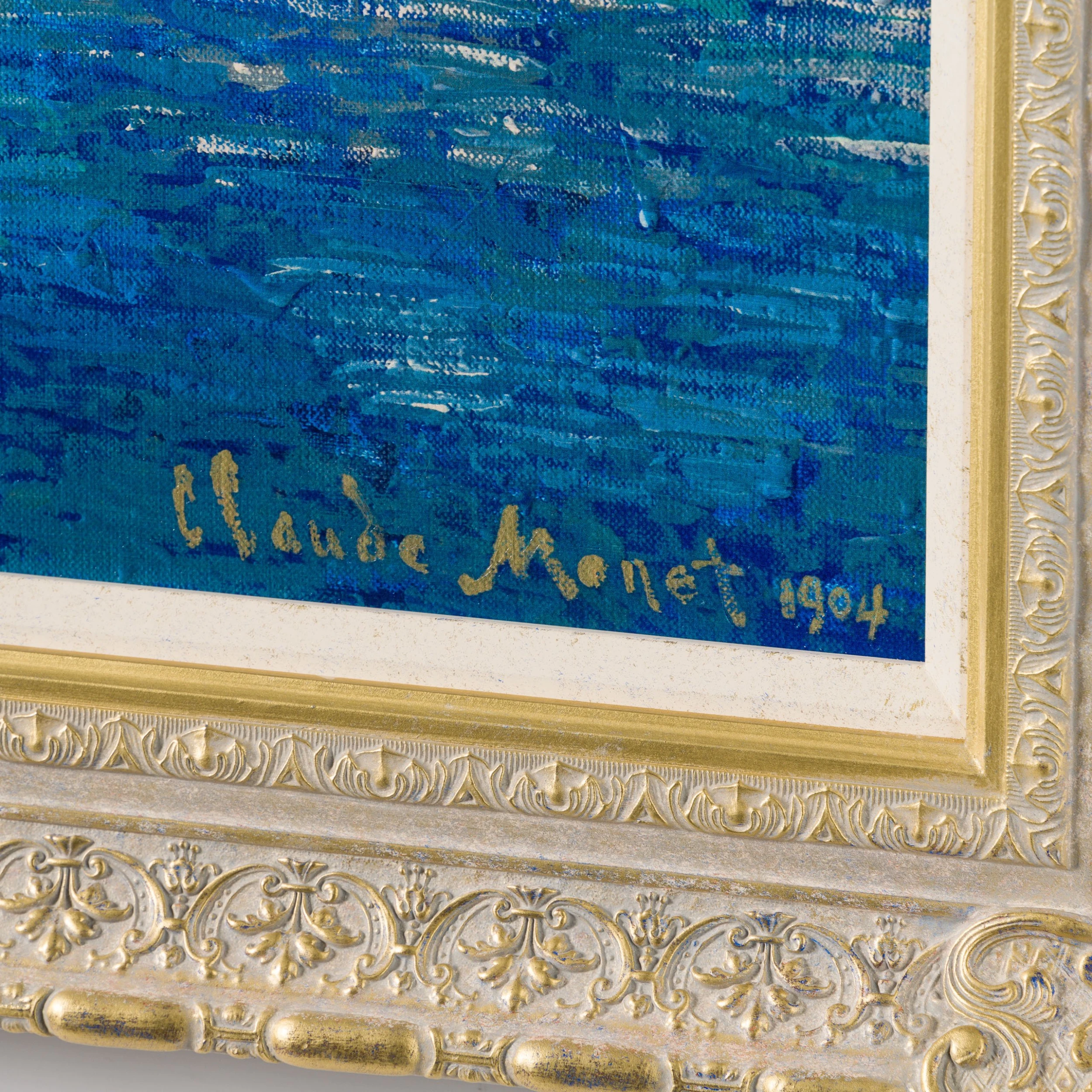 Between 1887-1888, Monet returned to one of his earlier subjects undertaken at Argenteuil, having painted at least six large canvases depicting Alice’s daughter’s boating. Monet represents the figures as individuals rather than shadowy, light-bathed silhouettes, and they take on the fullness of a living entity. Symbolist in its dreamy, ethereal atmosphere, “La Bargue 1887” gives the impression of an enclosed and private world created through soft hues.