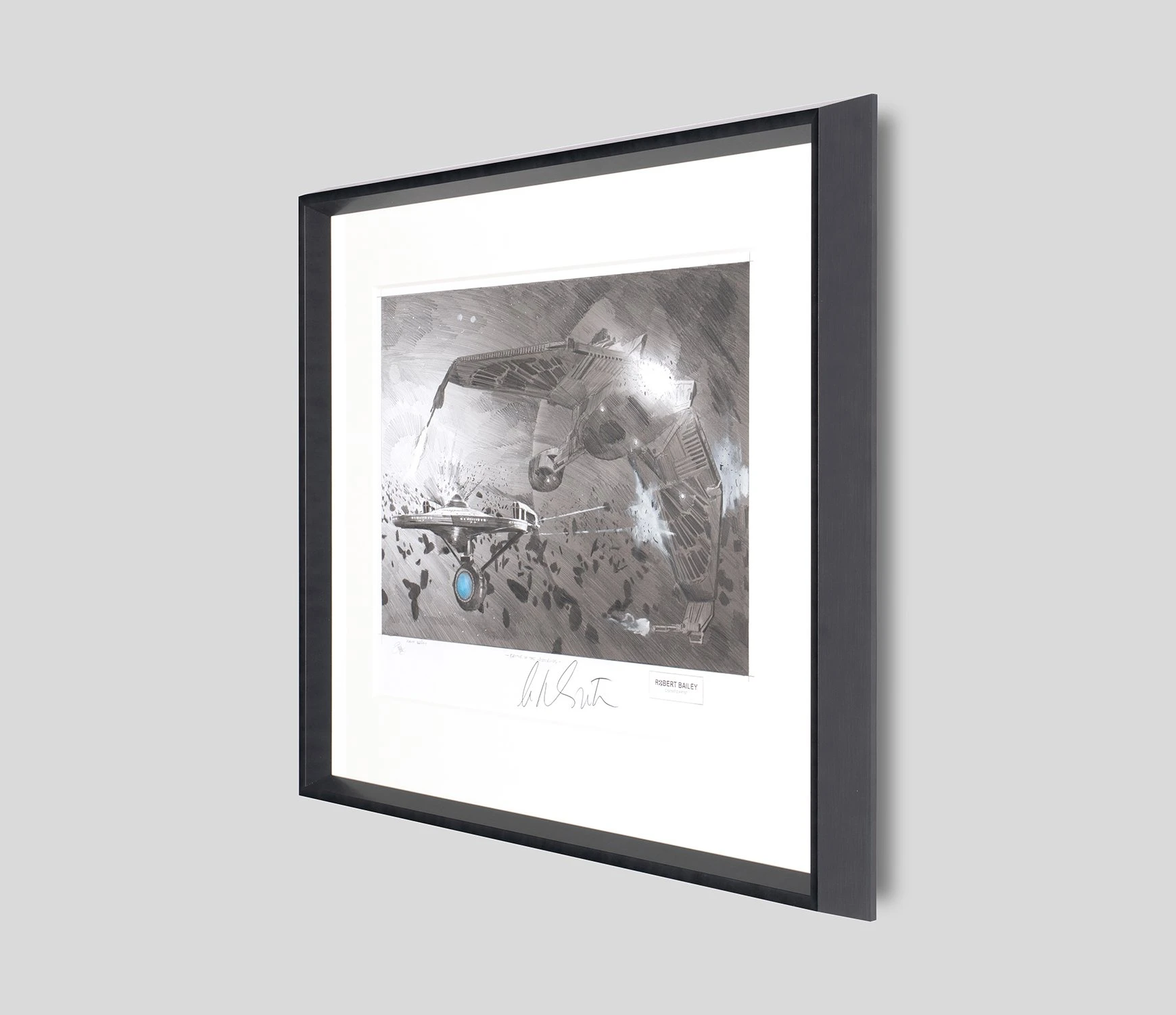 Hand-signed by William Shatner himself, who has since been into real space, this original artwork by Robert Bailey will add a touch of space-age magic into your home through a bold and bright colour palette and bespoke black wooden frame. View our full Robert Bailey portfolio .