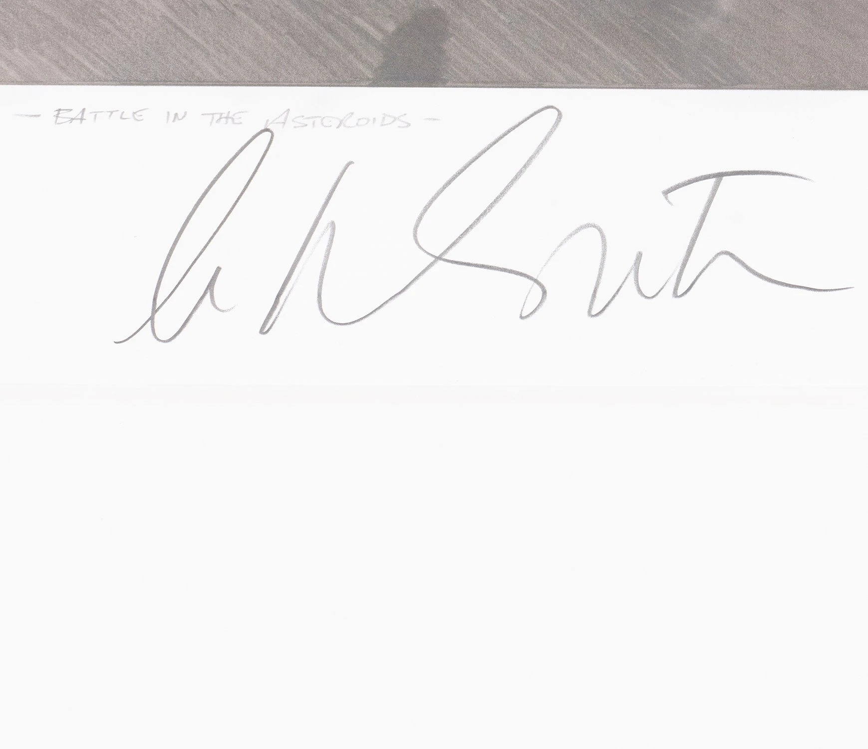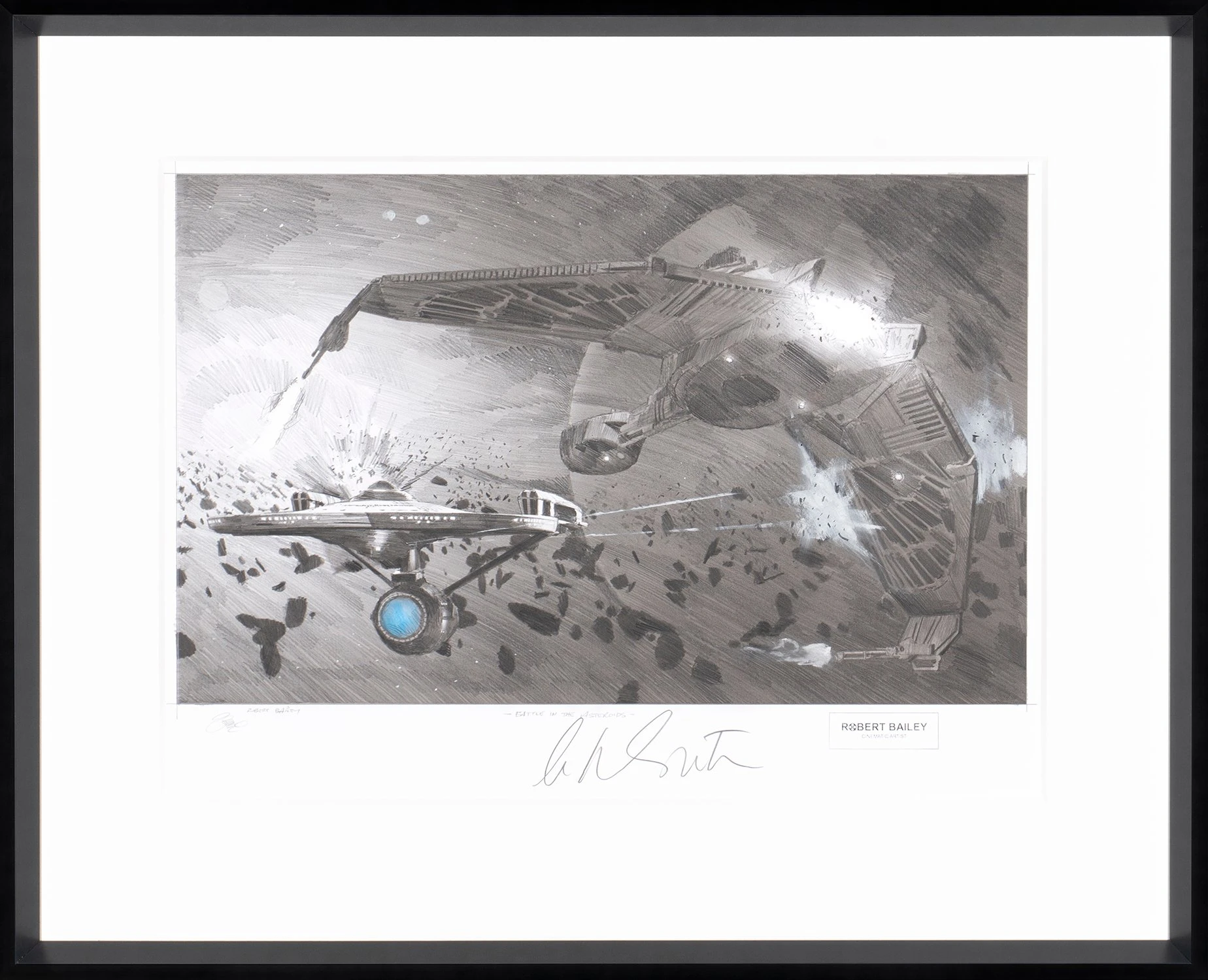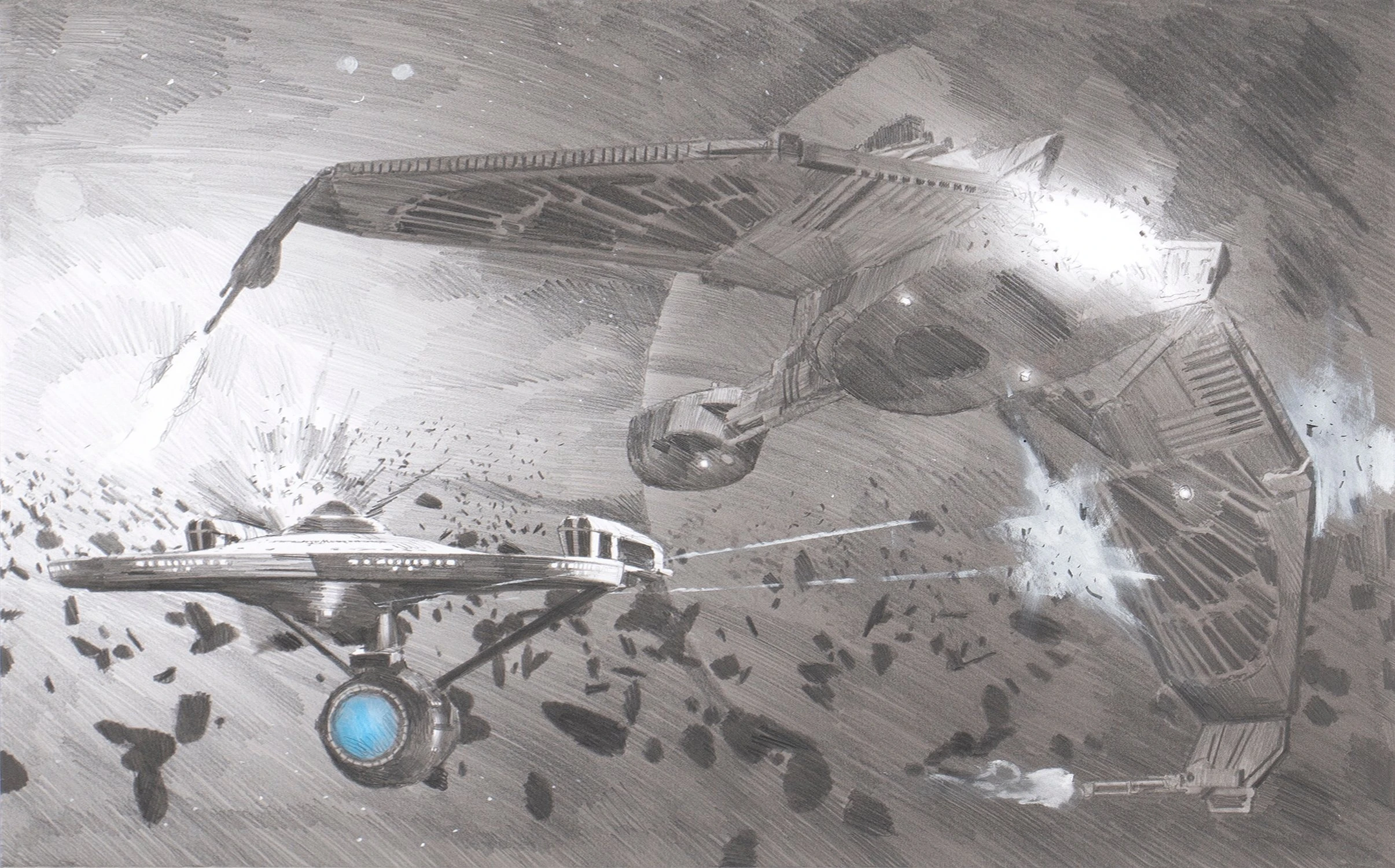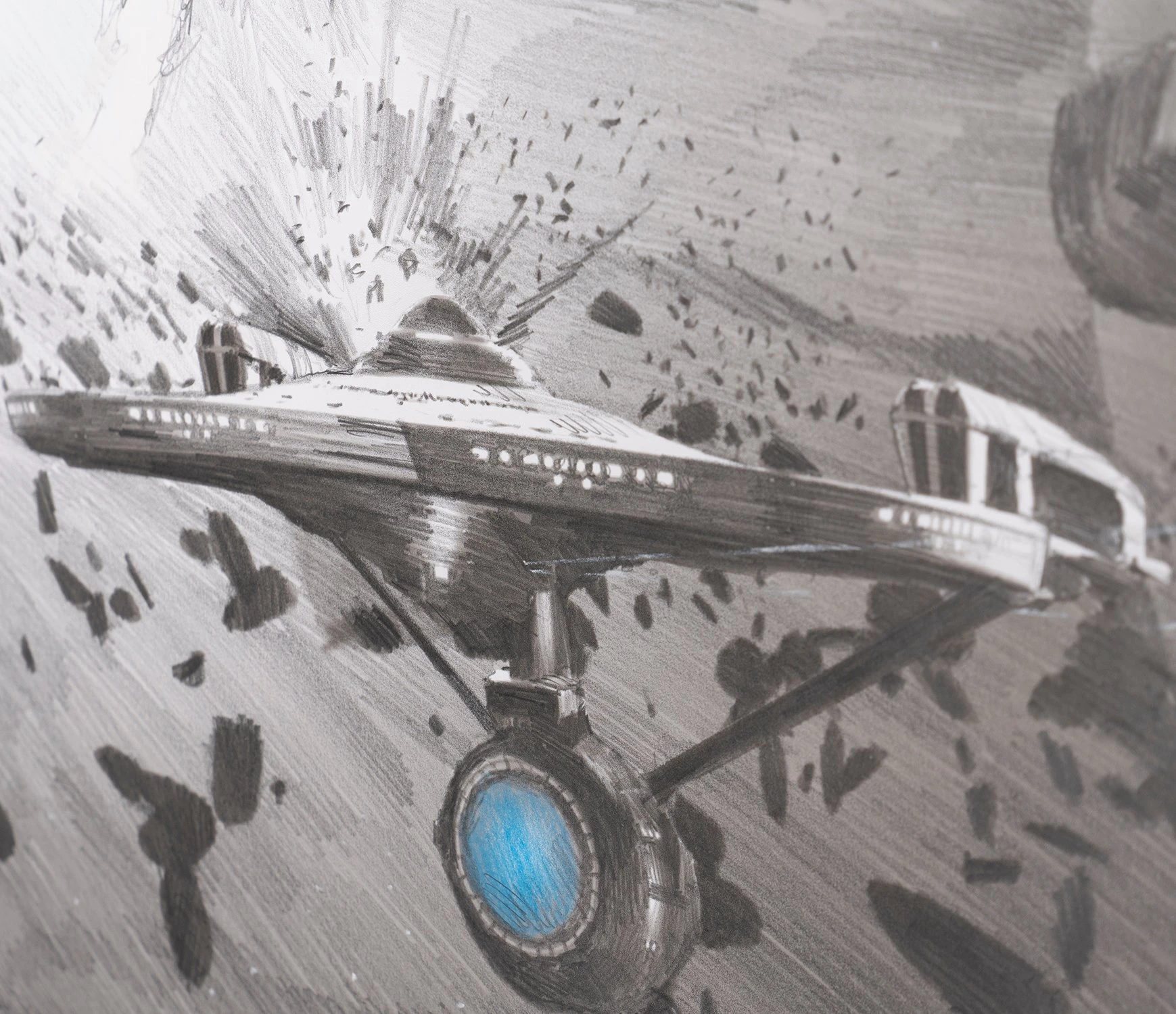 With subtle pops of white and blue accentuating the different tones of delicate graphite, this otherworldly original drawing by Robert Bailey perfectly captures the iconic scenes and retro quality of Star Trek: The Original Series.