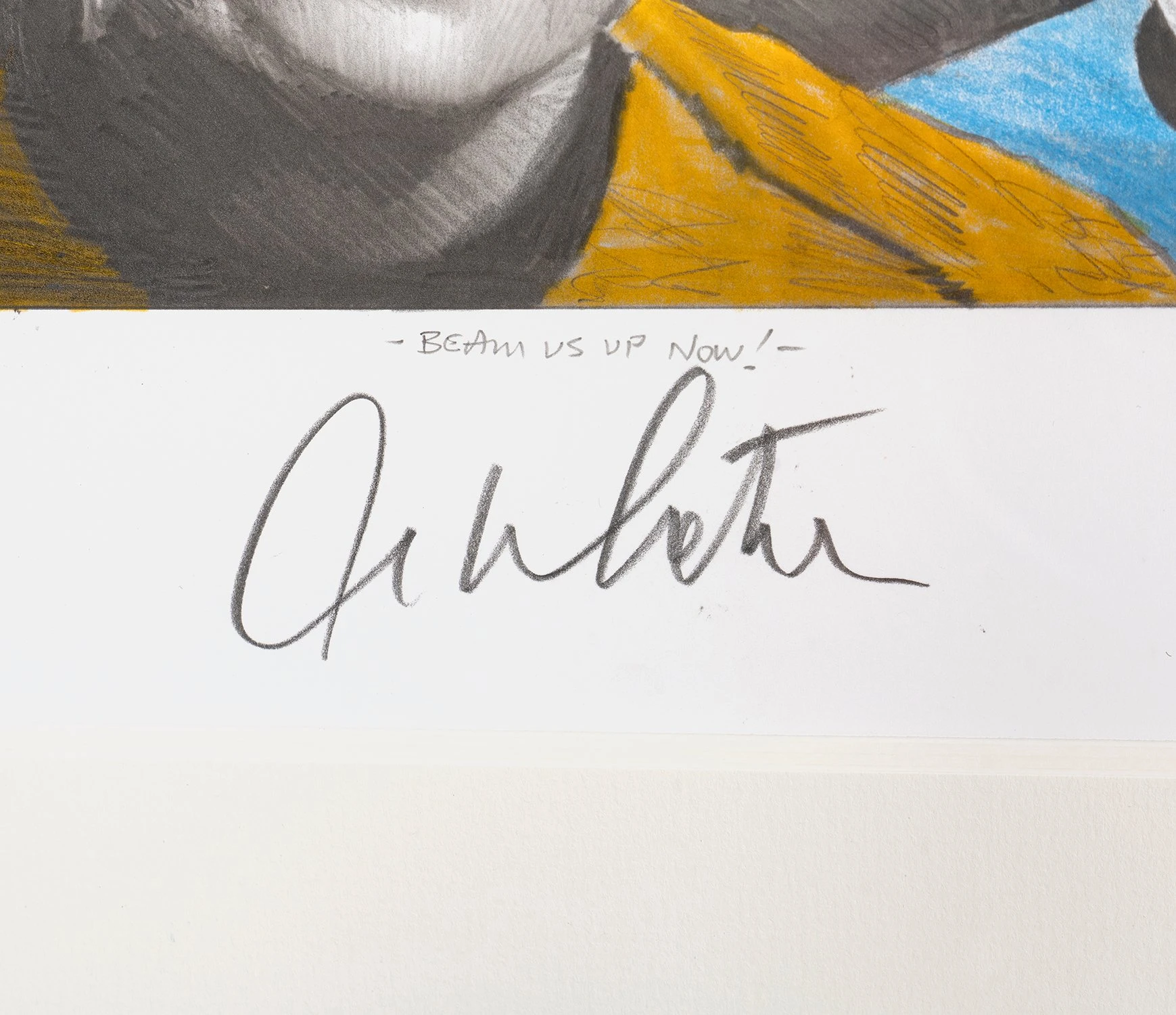 With bright pops of yellow and blue accentuating the different tones of delicate graphite, this otherworldly original drawing by Robert Bailey perfectly captures the iconic characters and retro quality of Star Trek: The Original Series.