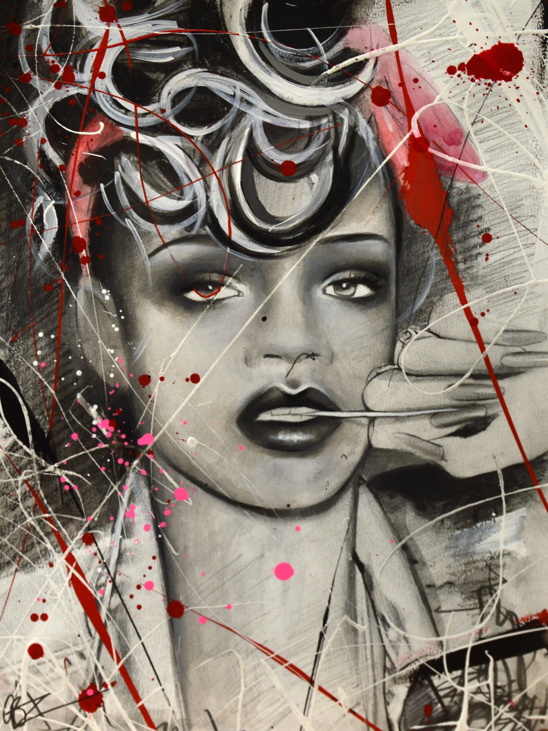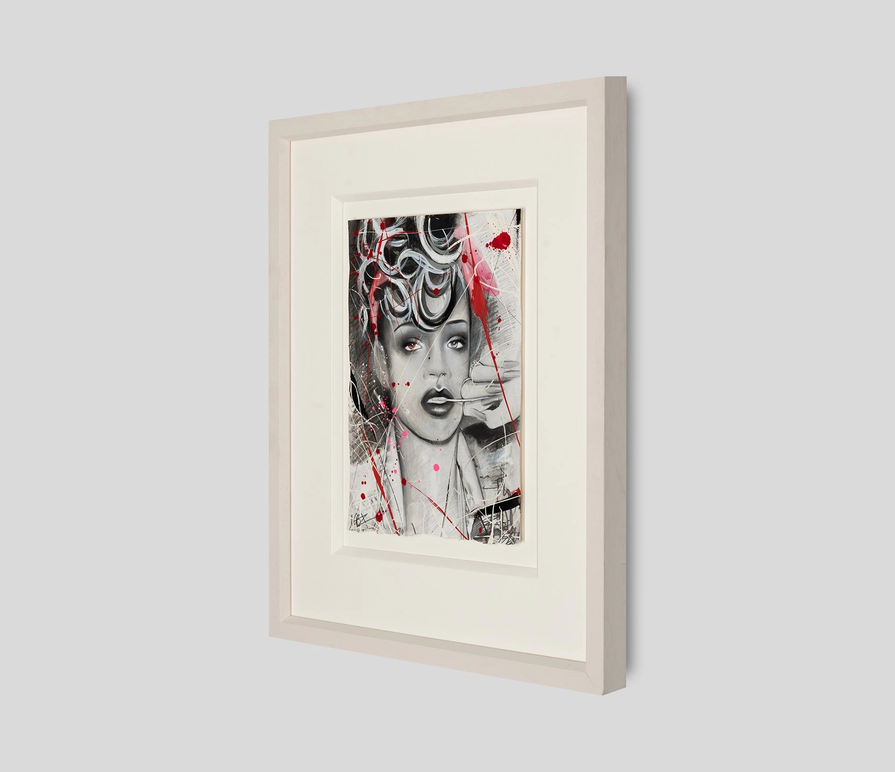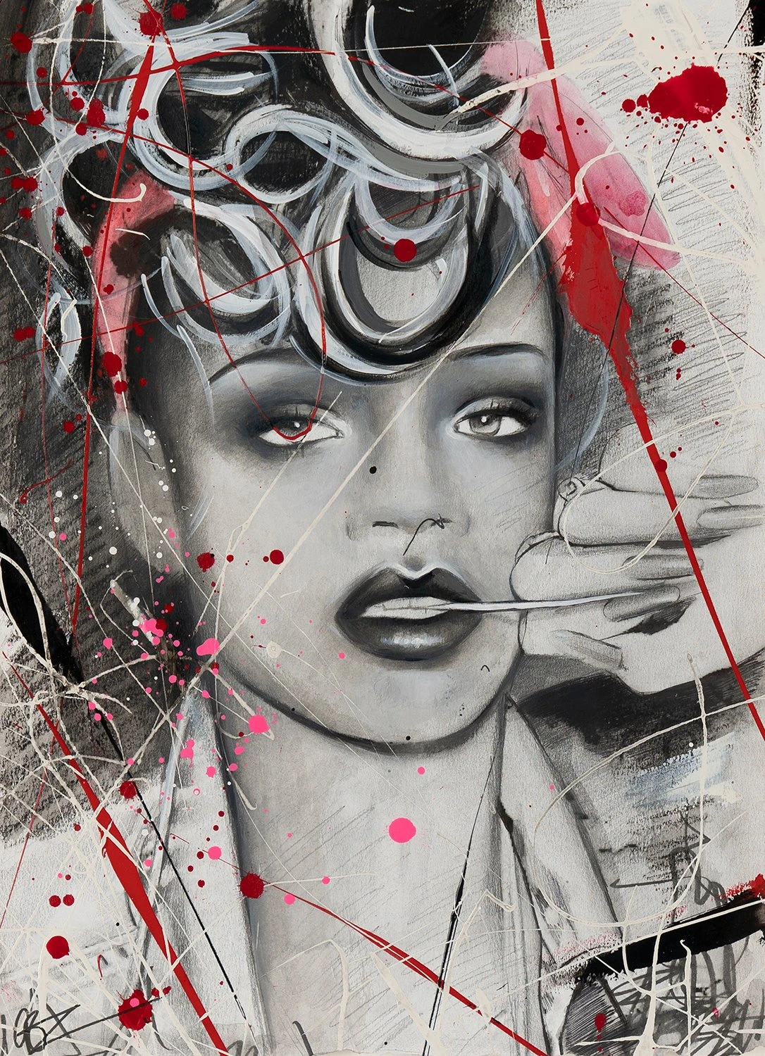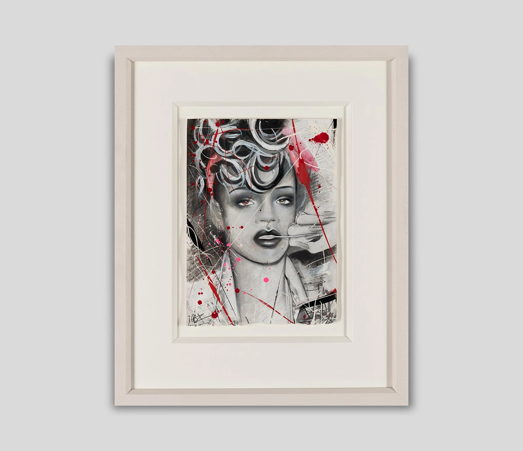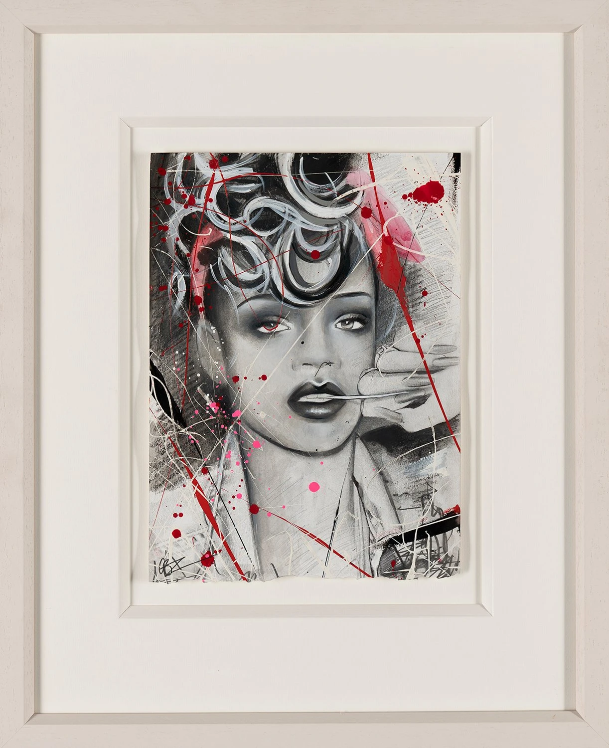 Emma’s artwork is full of movement, emotion, and strong women. This gorgeous original watercolour painting on paper is no exception and portrays music icon and fashion legend Rihanna. It bursts with vibrant pops of red, hot pink, and white that perfectly offset the monochromatic portrait and convey the sitter’s passion for music and art.
