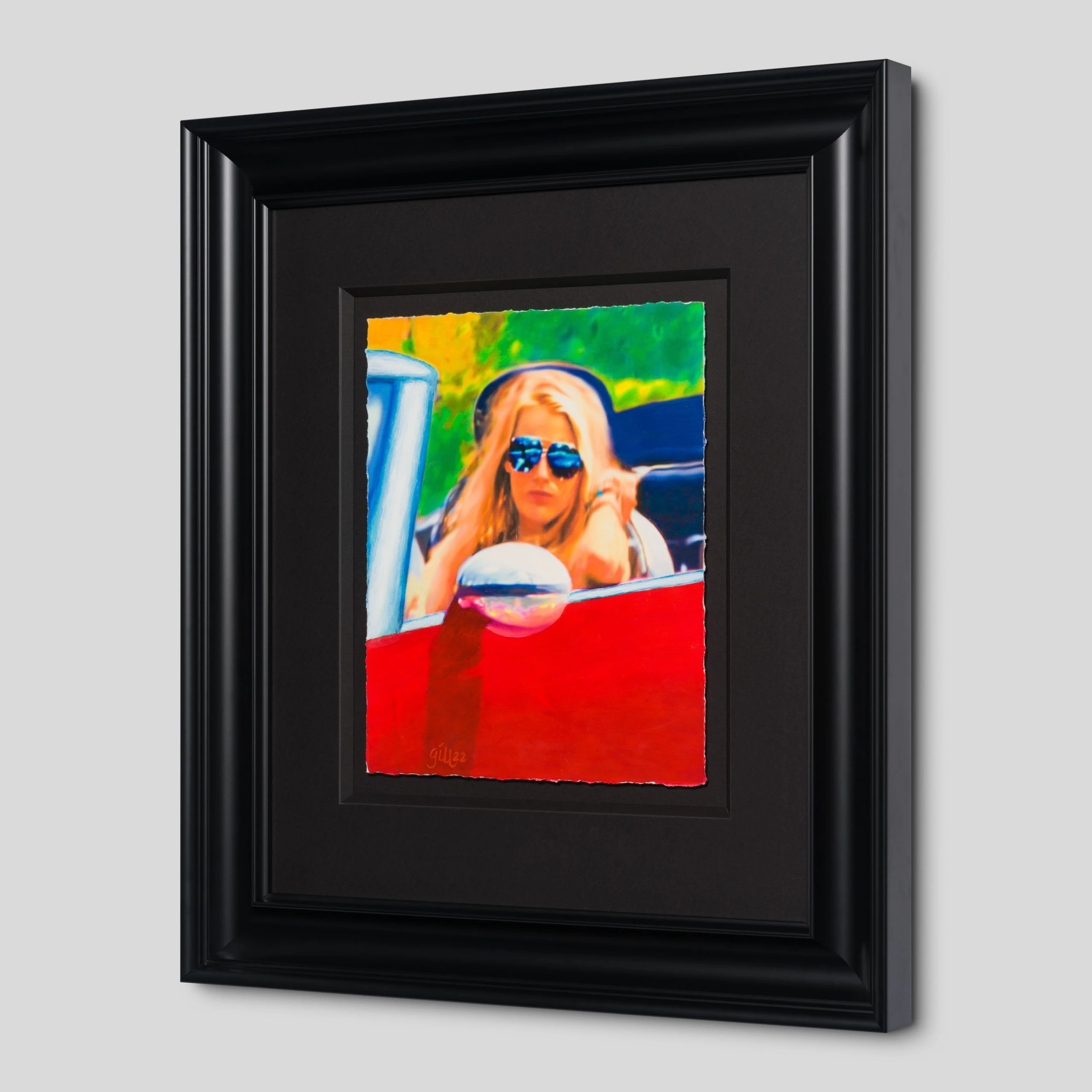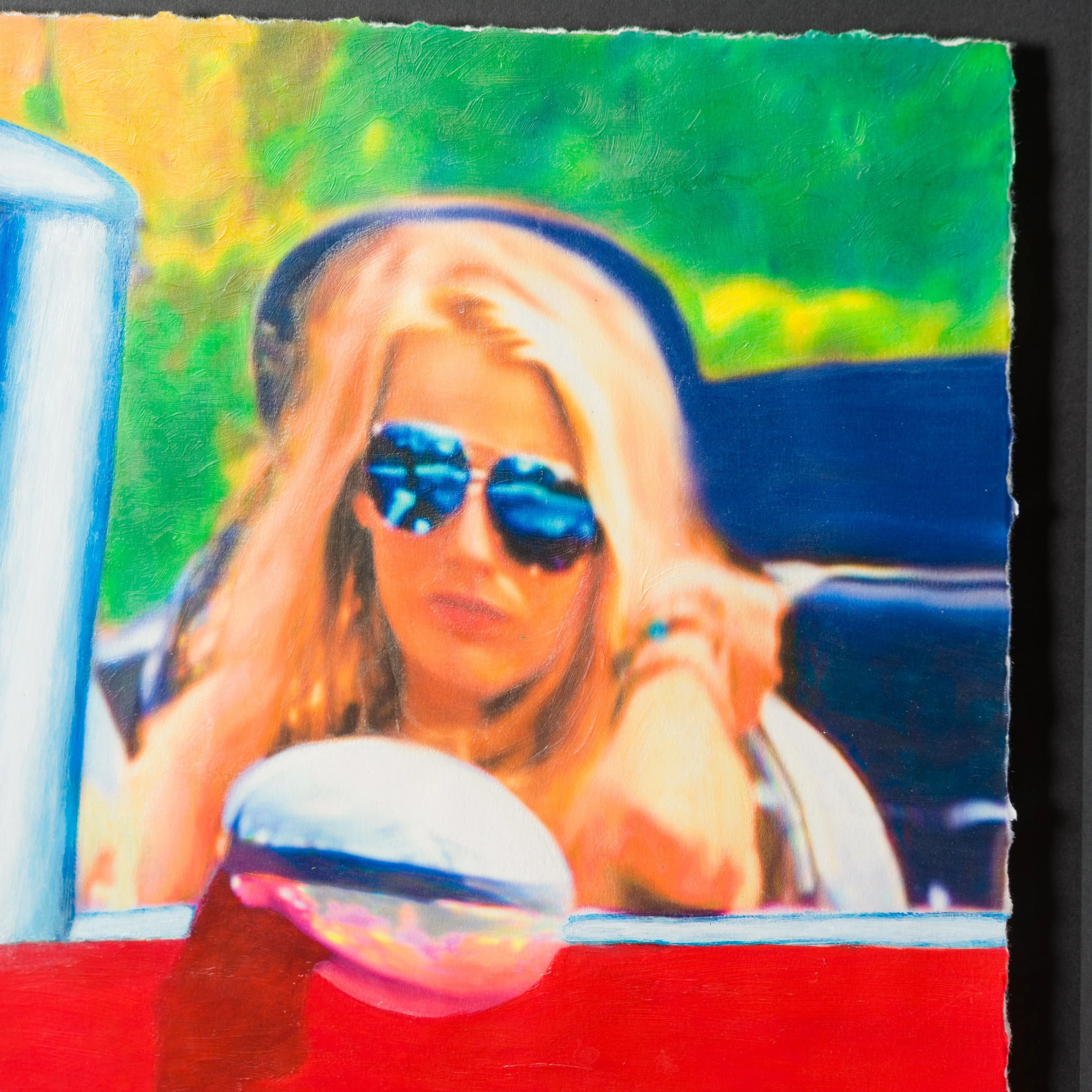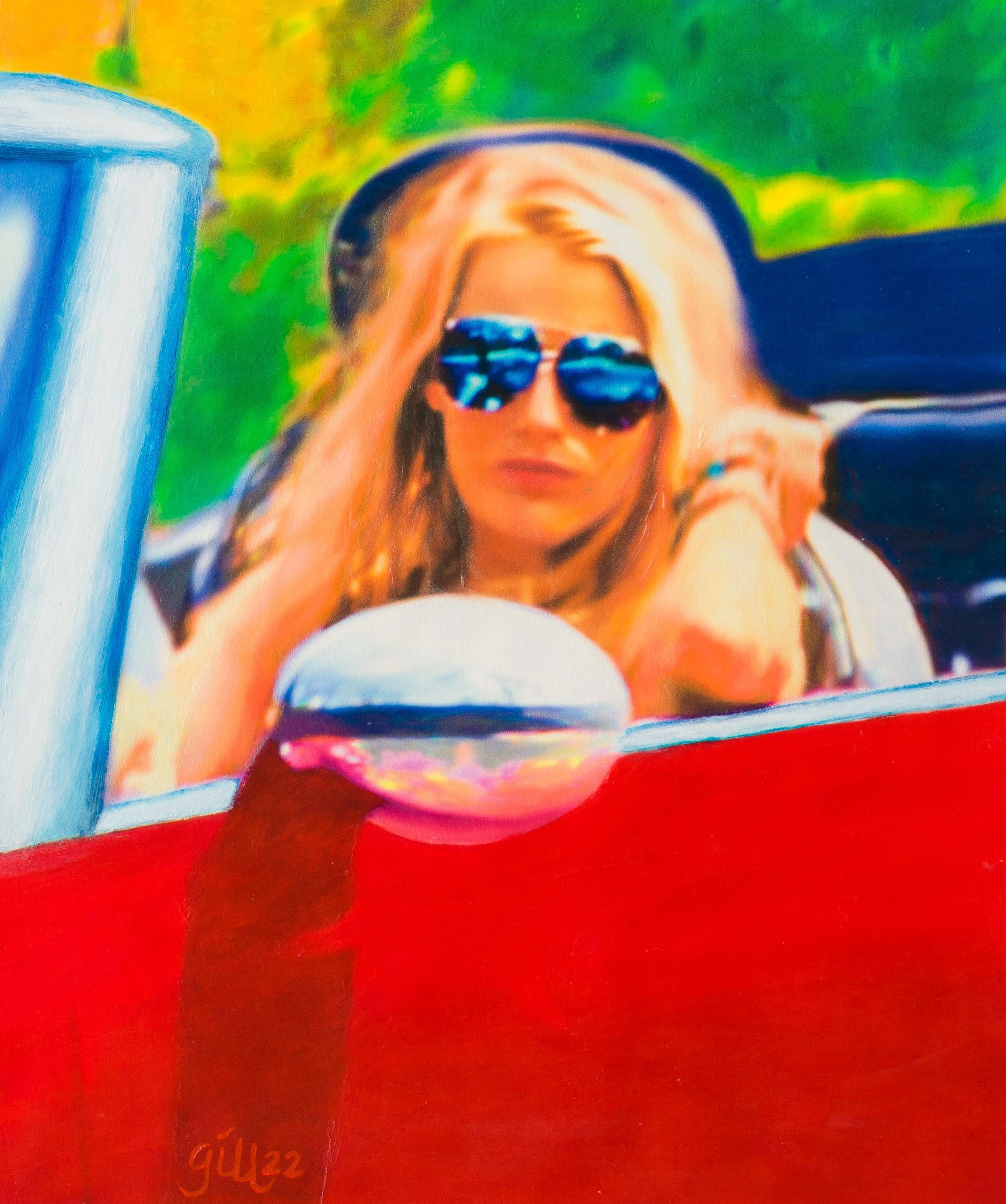 This strong, bold, angular study utilising primary colours features Blake Lively in her car. This painting was exhibited in Germany in 2022 and can be found in the Coffee Table Book “Women in Cars” (page 259).