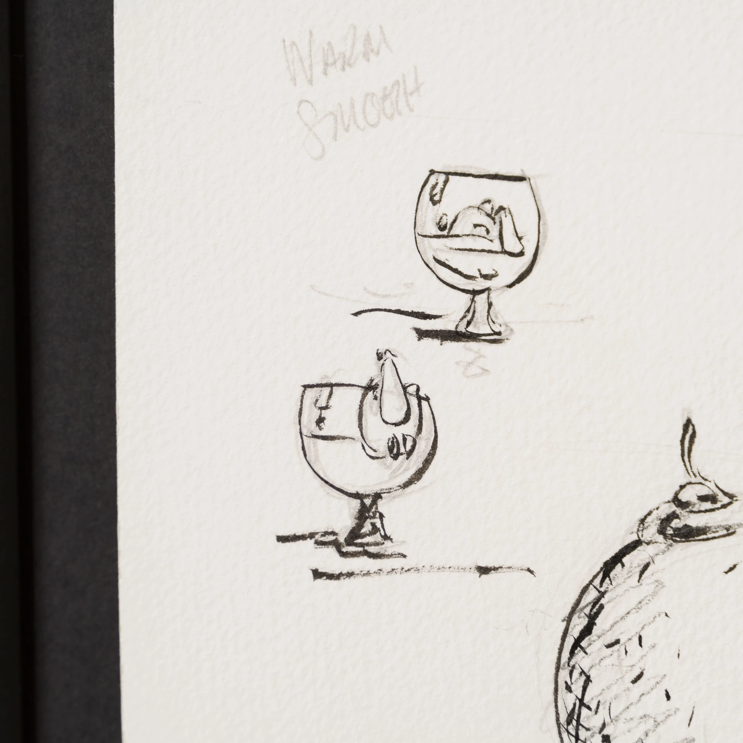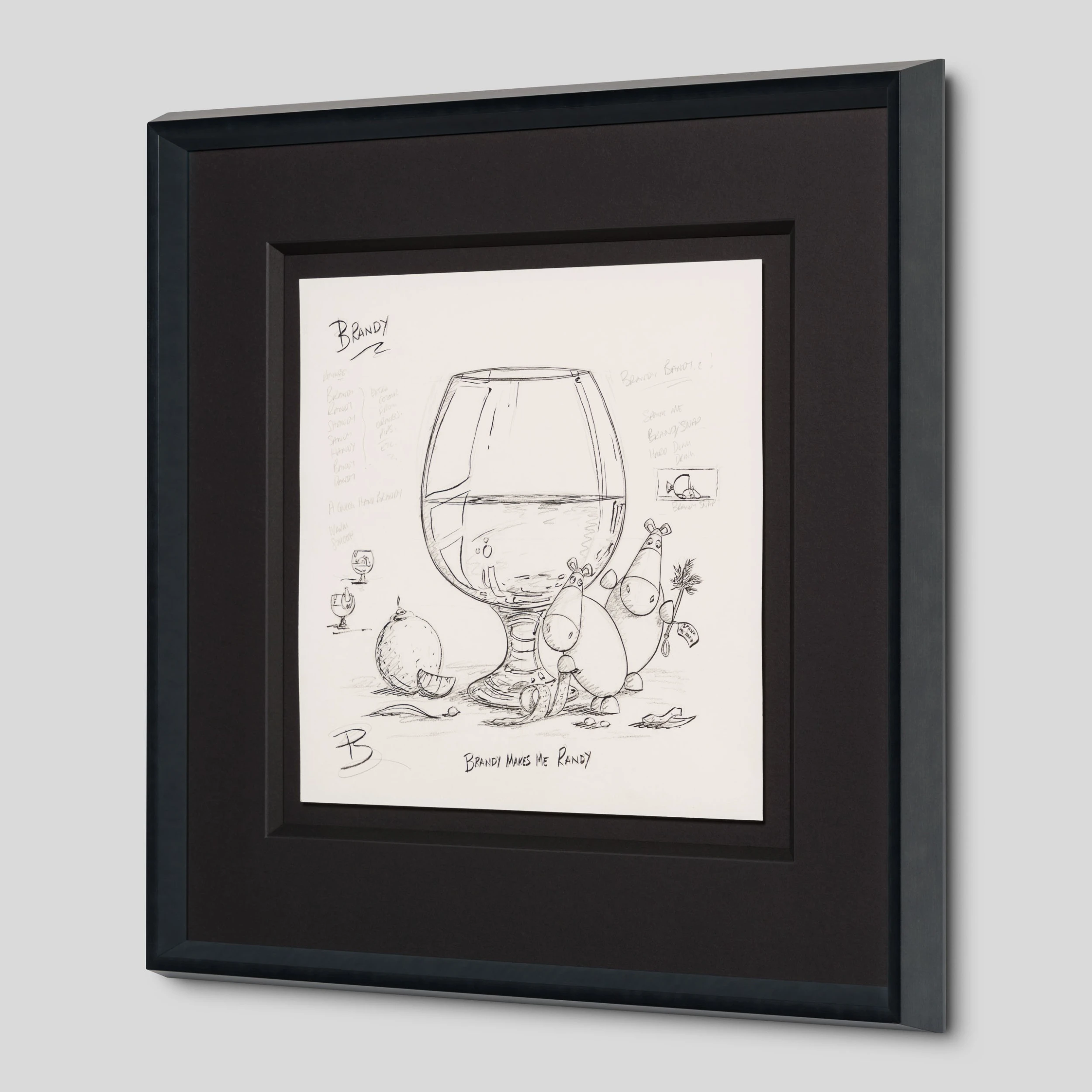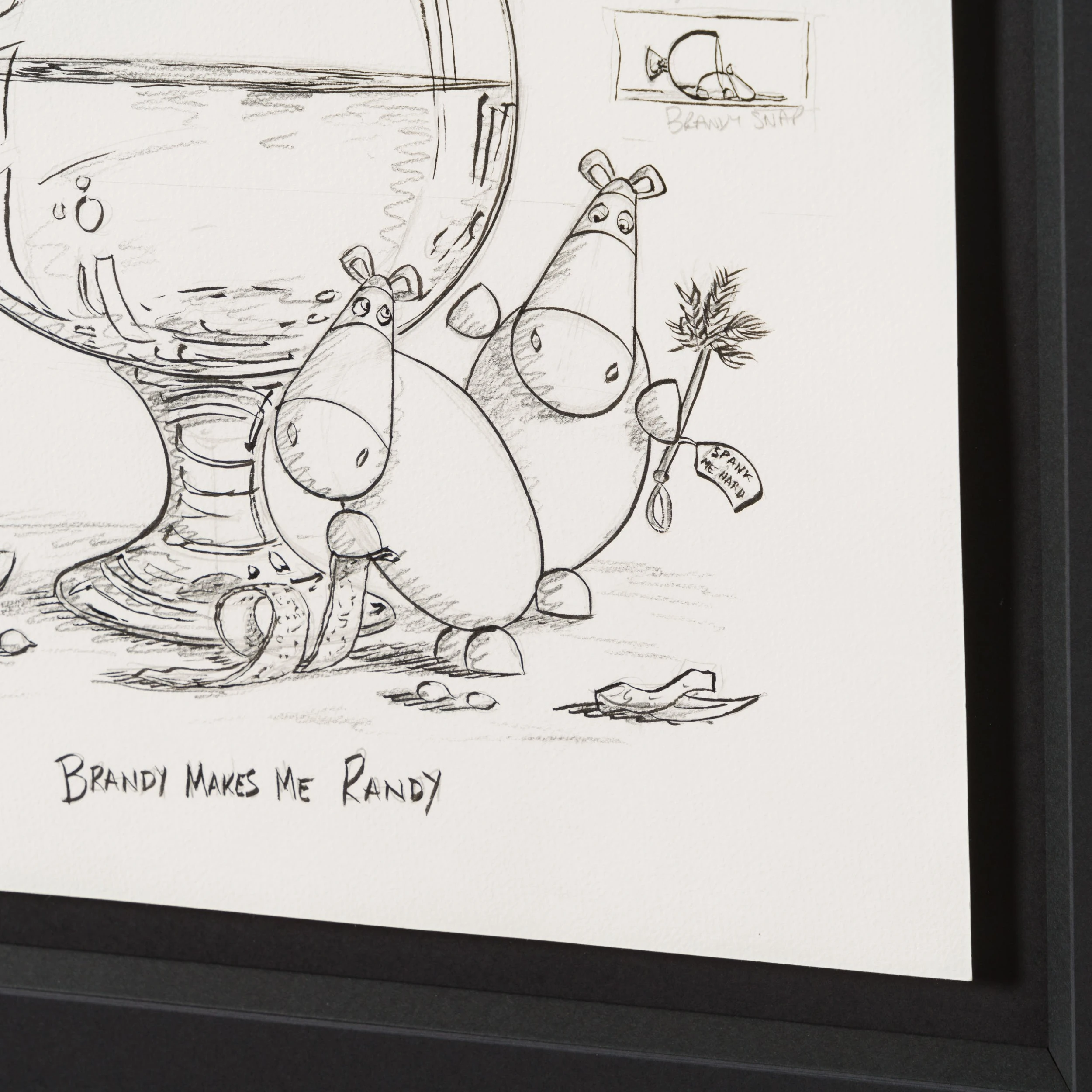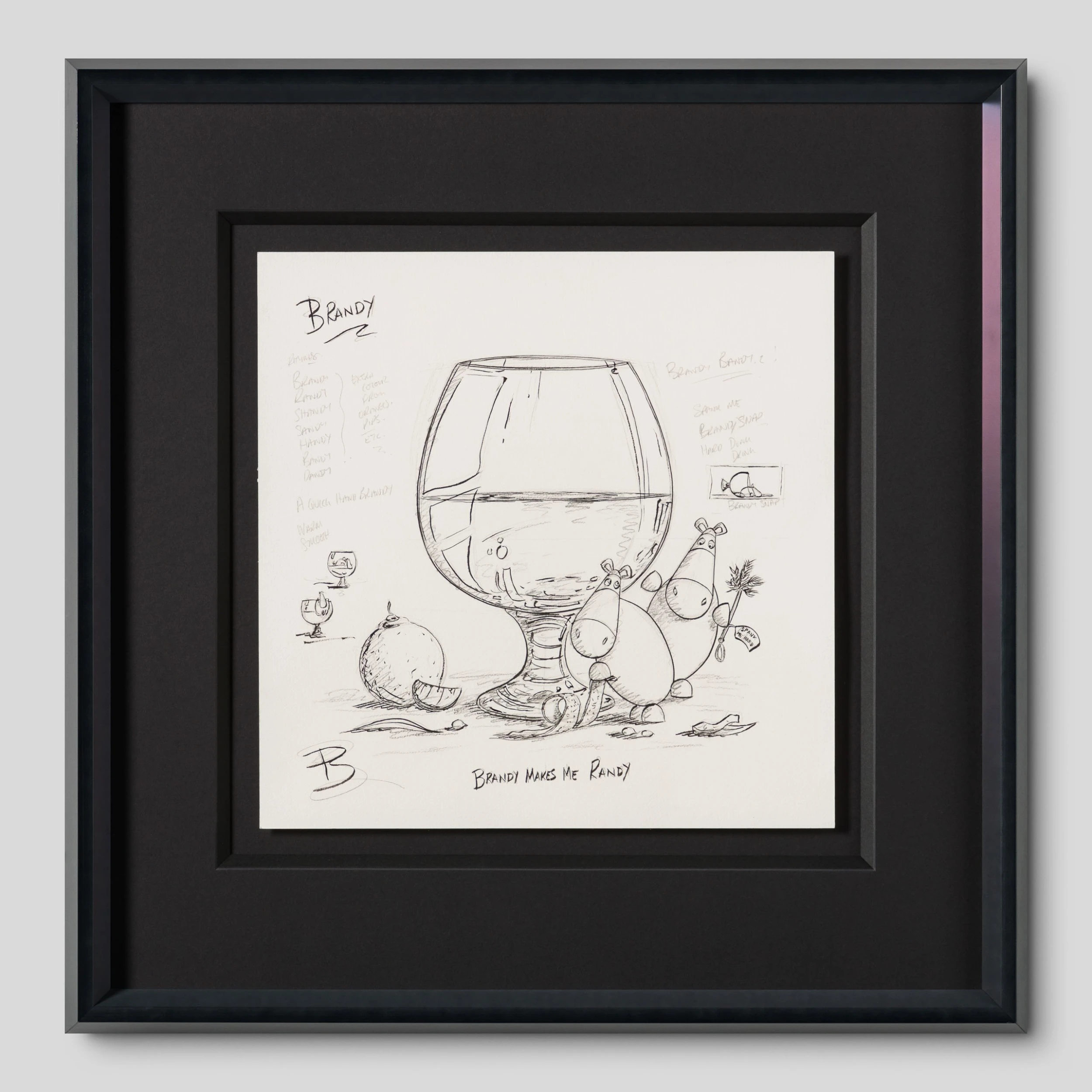 The artistic duo is back by popular demand with the latest in their Impossimal drinks series: ‘The Shaker Maker’, featuring their own twist on a menu of the classic cocktails we all know and love. The Shaker Maker sees the Impossimals bring out in glorious bold colour the fun we know and love, coupled with a bit of Dutch Courage and remind us to find the humour in life, ourselves, and the times we share with friends and family! In a traditional still-life composition creating a visually appealing and balanced image, “Brandy Makes Me Randy” is a drawing the artist created before mastering the oil painting.