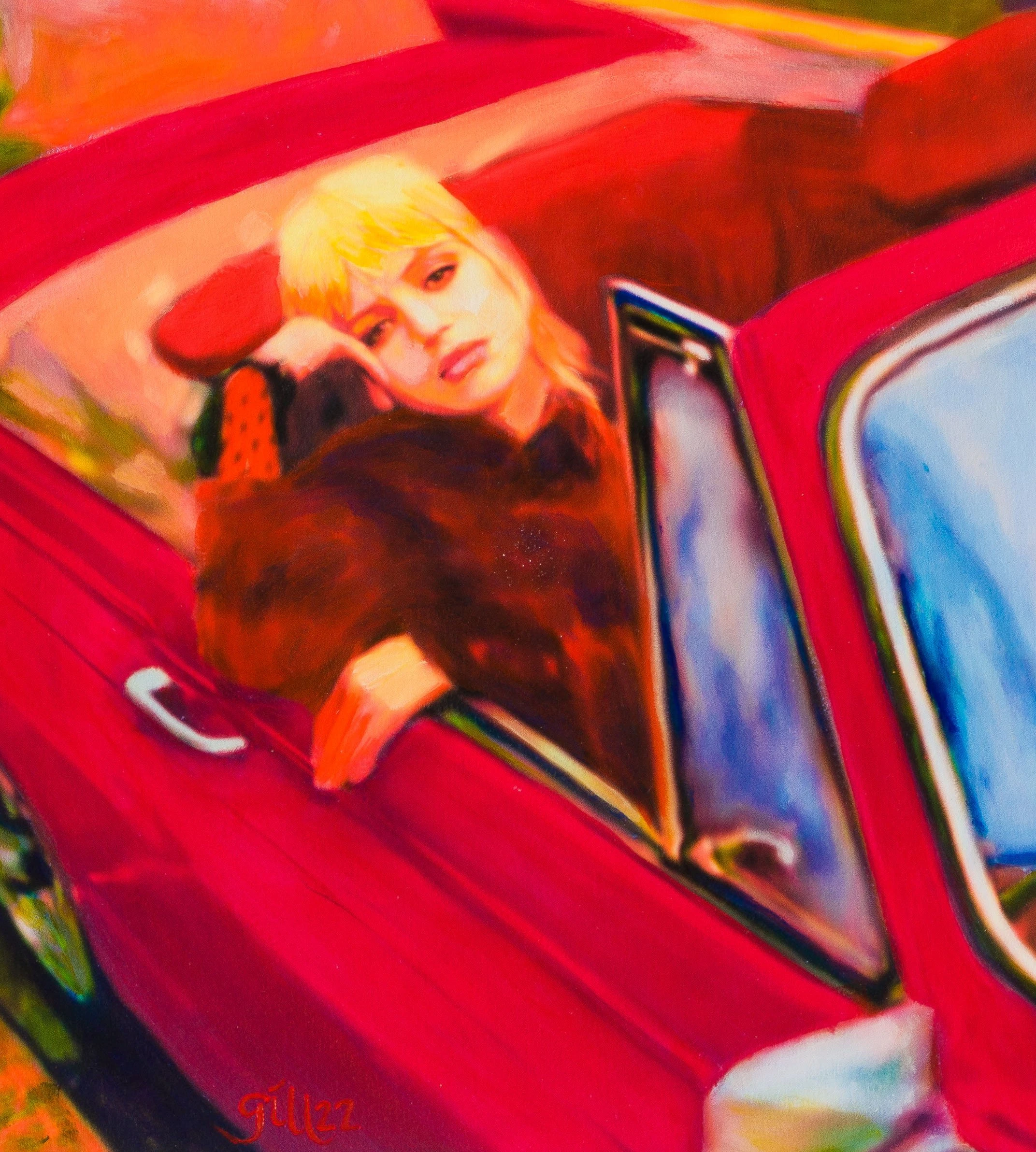 In this romantic piece, Gill uses warm red tones to evoke the serenity of “California Dreamin’. The model takes centre stage with a calm expression, while the burgundy car falls into second plan. The colours compliment each other beautifully with stand out details such as the model’s blonde hair, the almost out of focus background with touches of green and the blue toned glass. California Dreamin’ is the perfect example of a strong bold angular study utilising primary colours. The details and minimalism of this piece bring an iconic and almost magic feel to it.