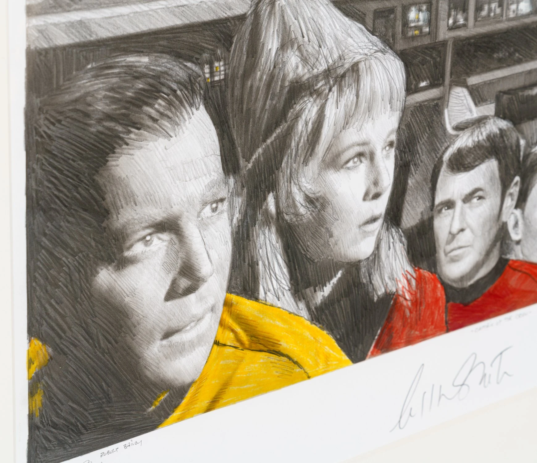 With bright pops of yellow, blue, and red accentuating the different tones of delicate graphite, this otherworldly original drawing by Robert Bailey perfectly captures the iconic characters and retro quality of Star Trek: The Original Series.