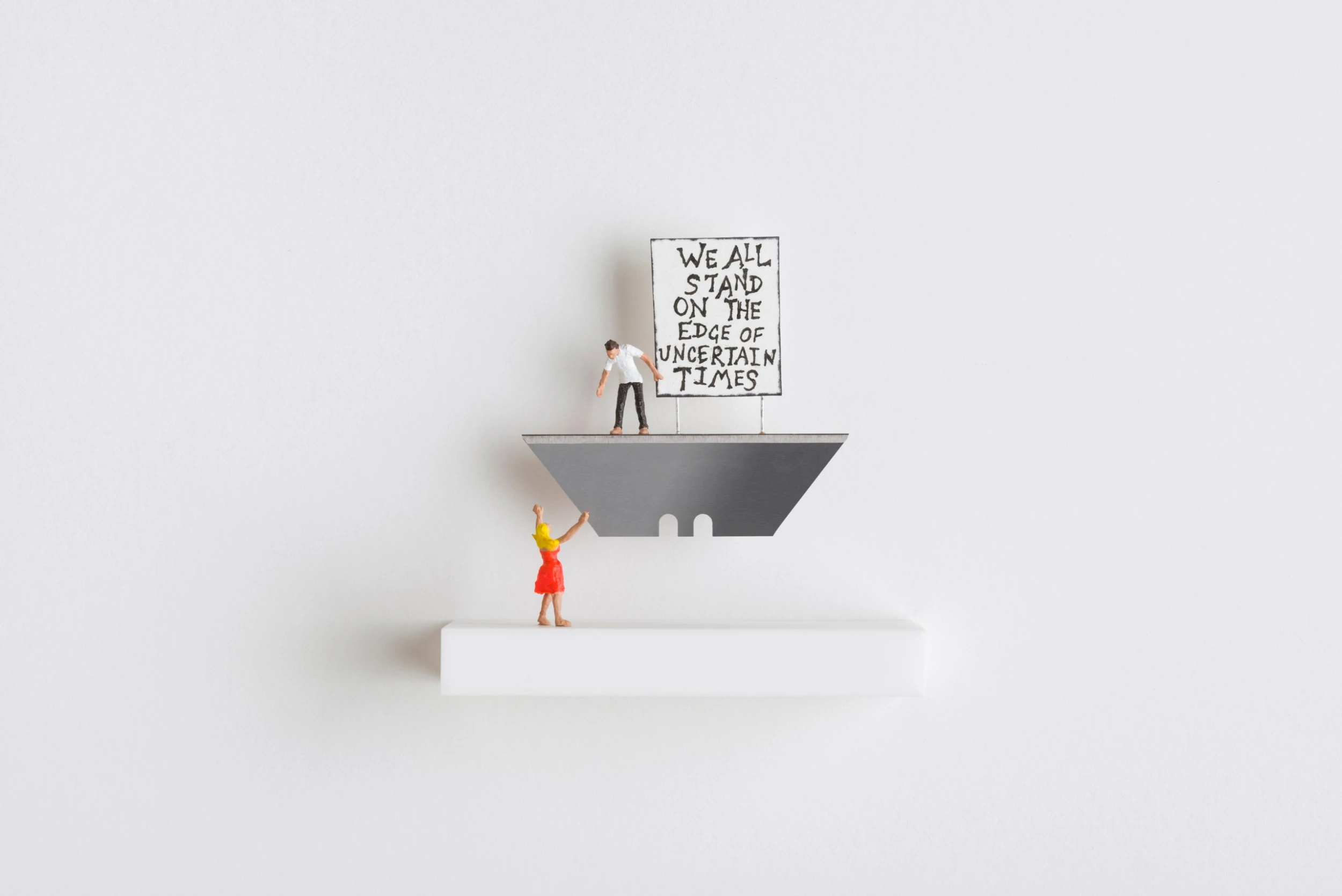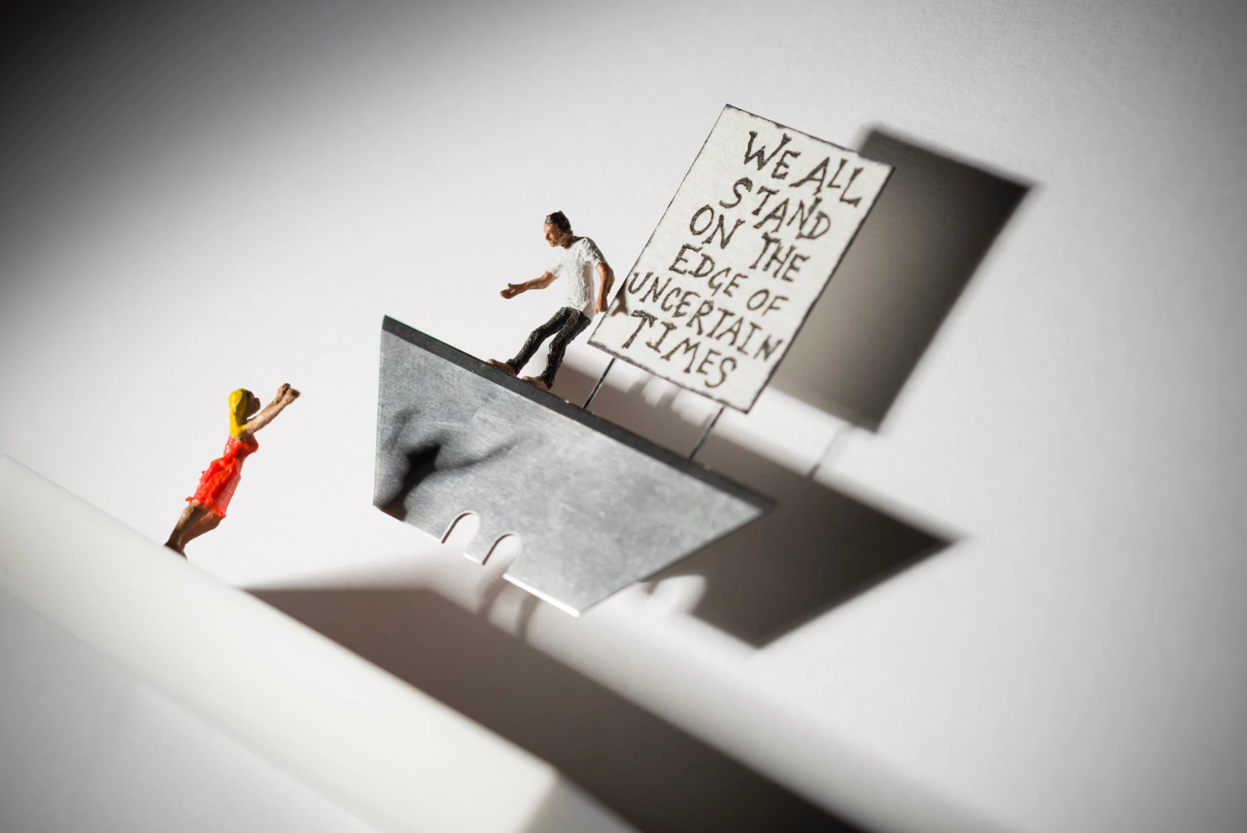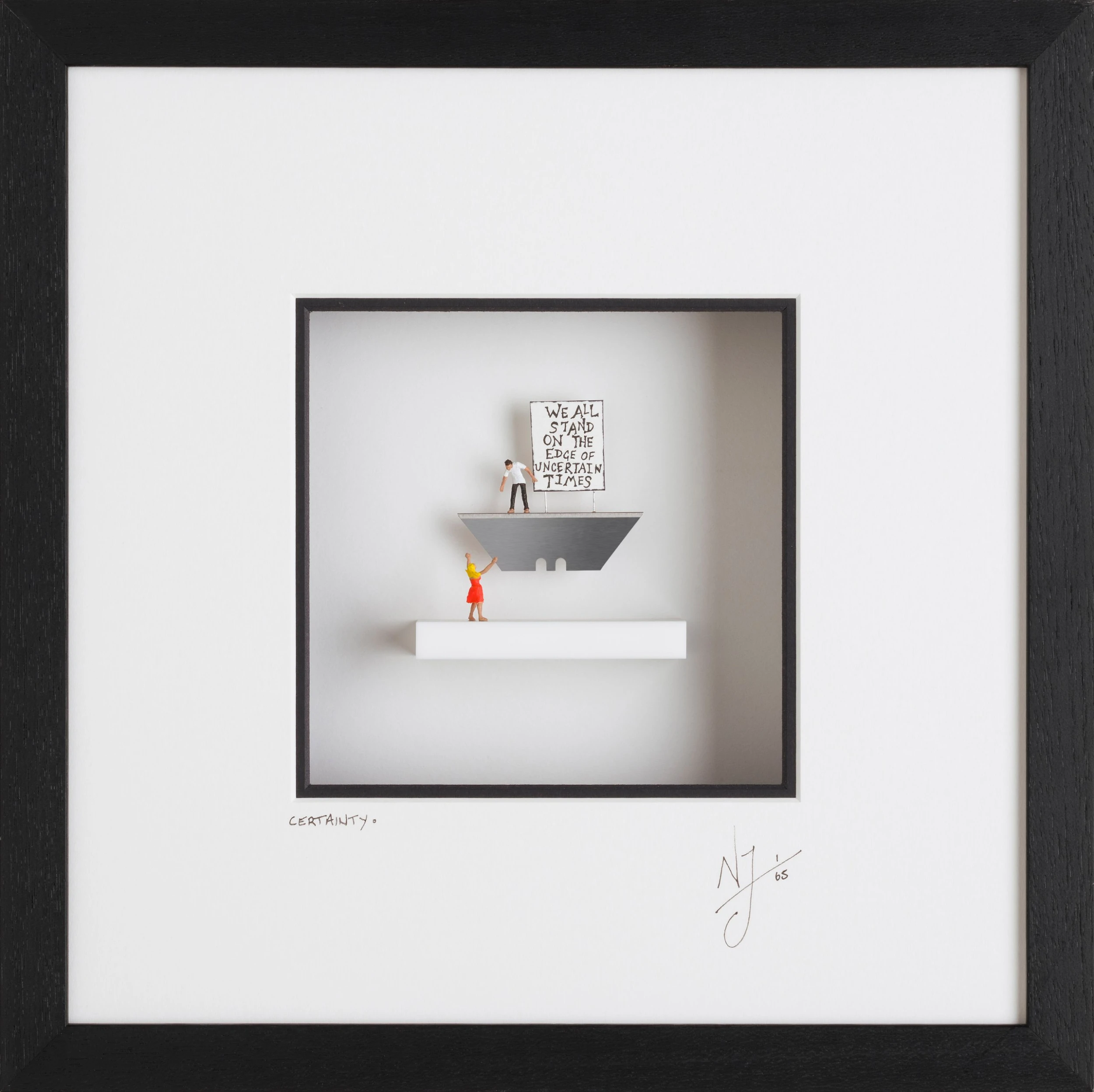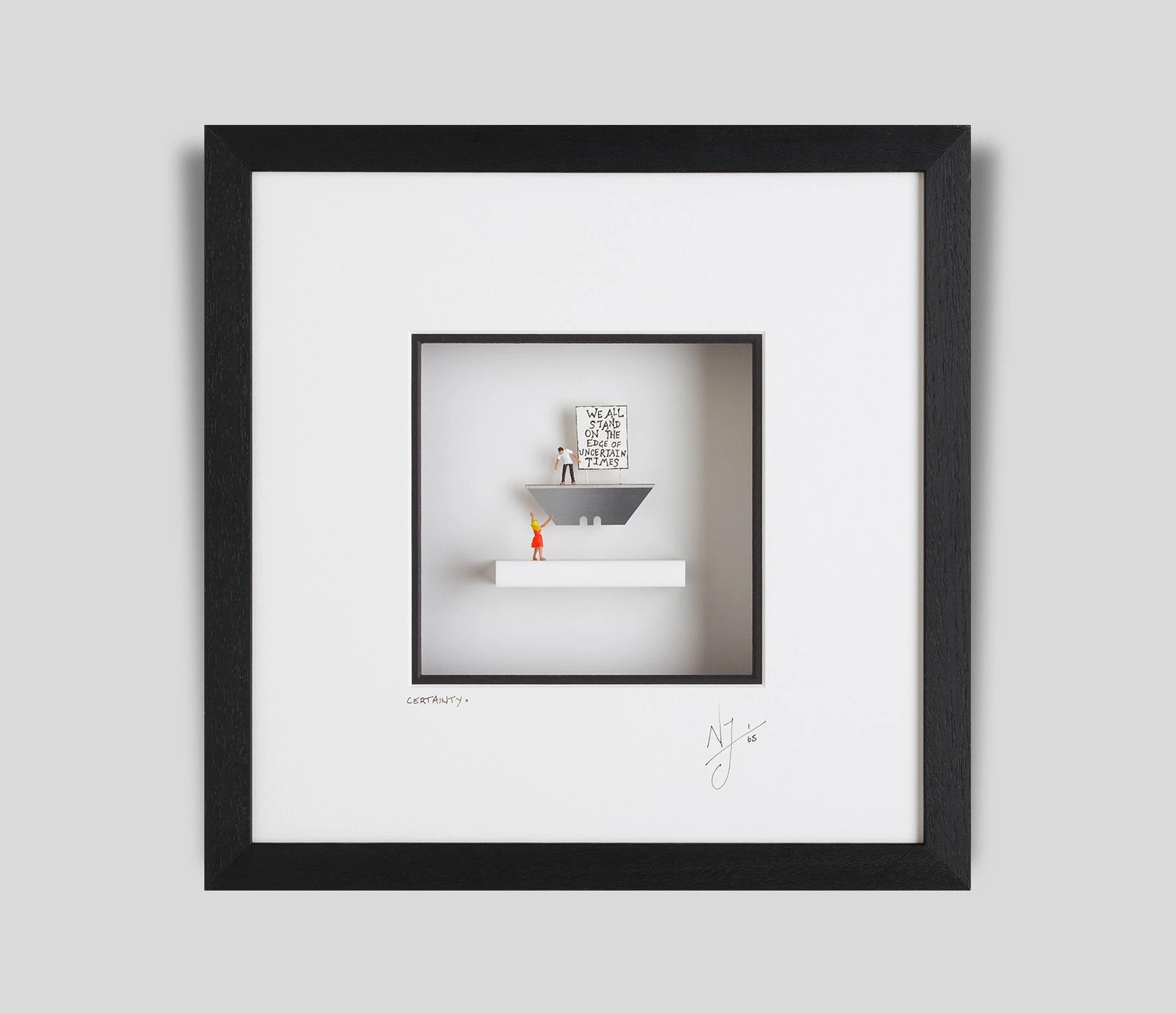 This handmade, studio edition wall sculpture by Nic joly was the first that he made as part of his 2021 collection . Born out of a time when we were all on edge, this beautiful piece reminds us of the time that also brought many of us closer together. The minimalist composition, featuring a real razor blade, is accentuated by small pops of red and yellow on the individually painted figures, and creates a beautifully simple artwork that we can all relate to.