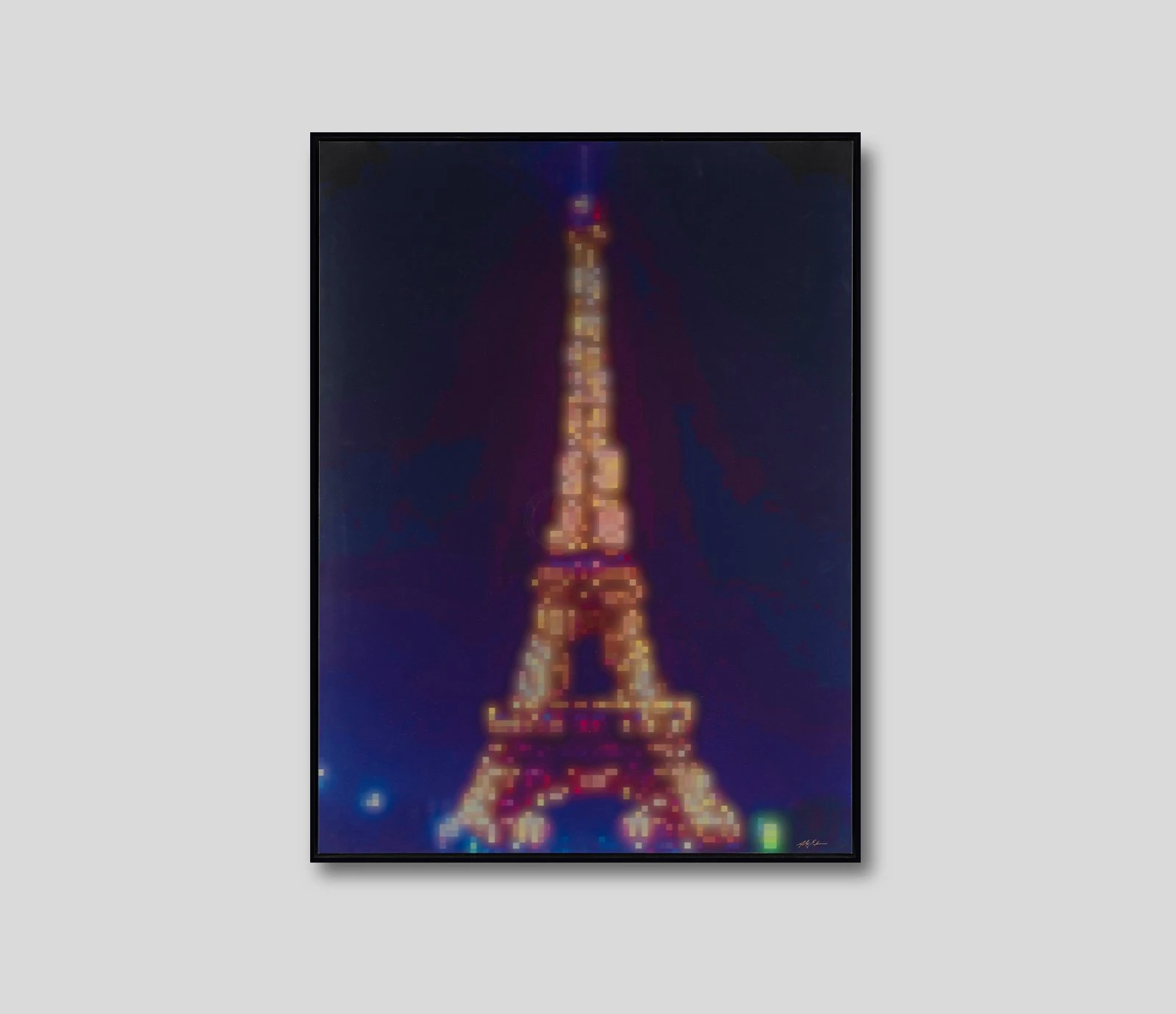 Here, Alex Echo has combined his abstract and colourful artistic approach with digital media to create this contemporary and abstract Parisian landscape. Using vibrant squares as pixels, the well-known image has been distorted but remains recognisable; commenting on the role of images in the digital age.