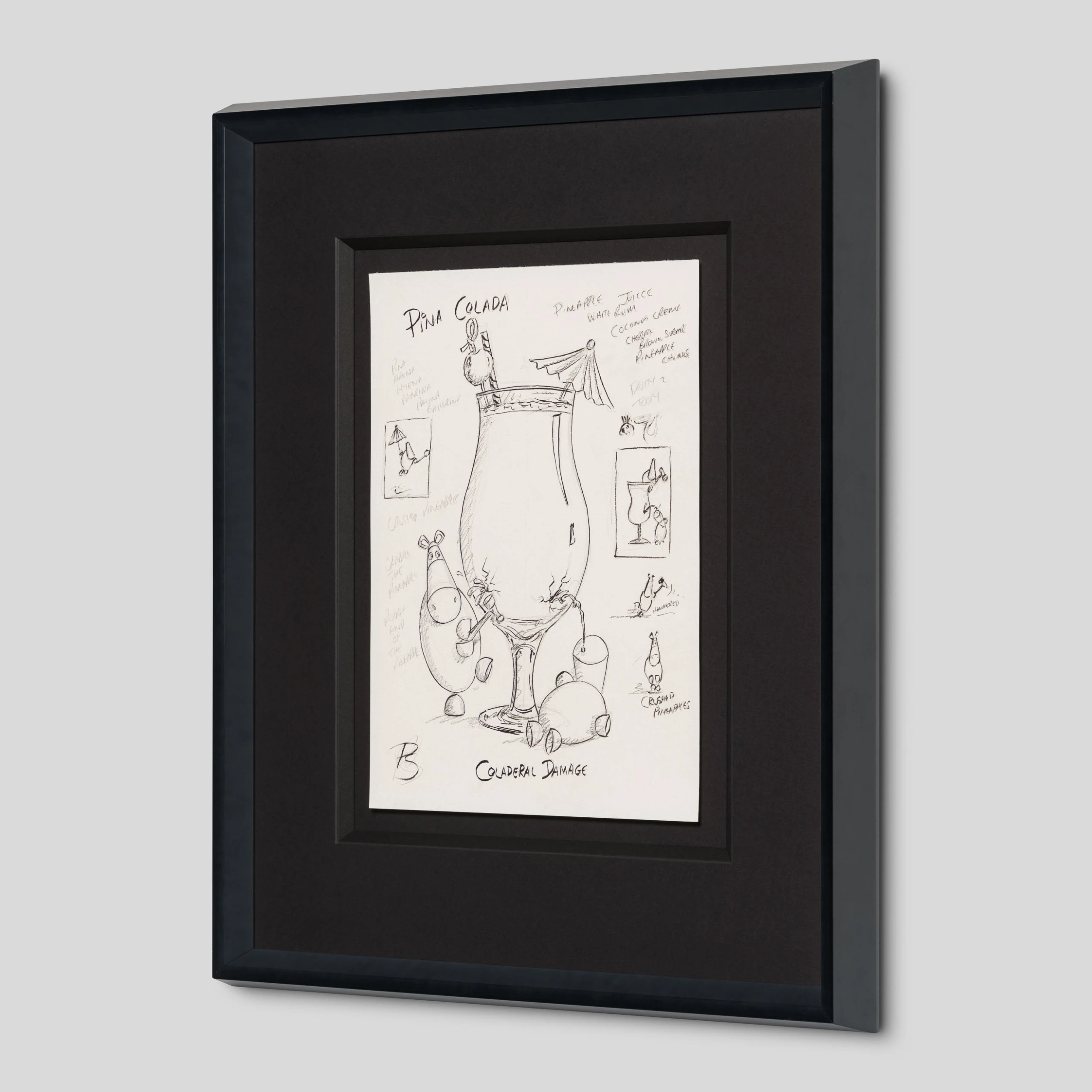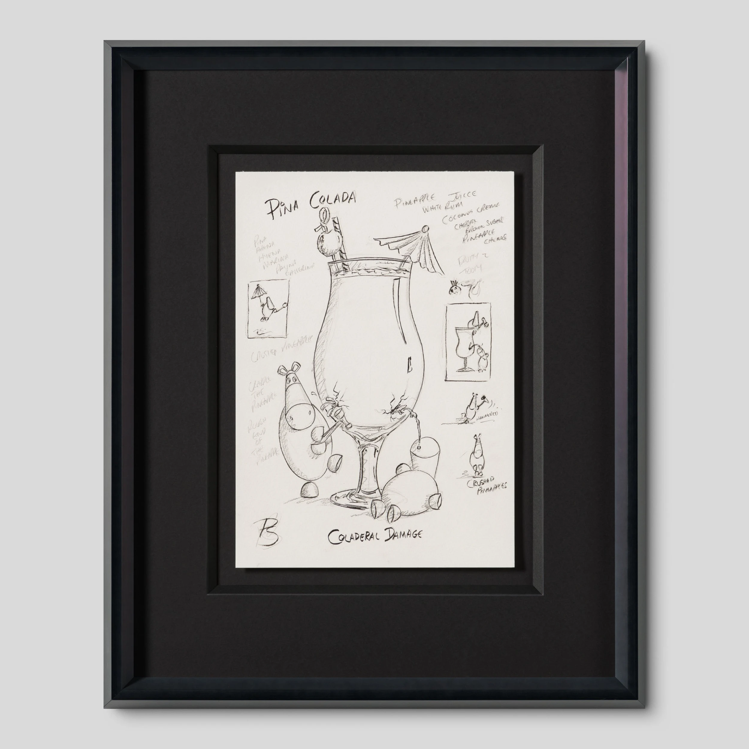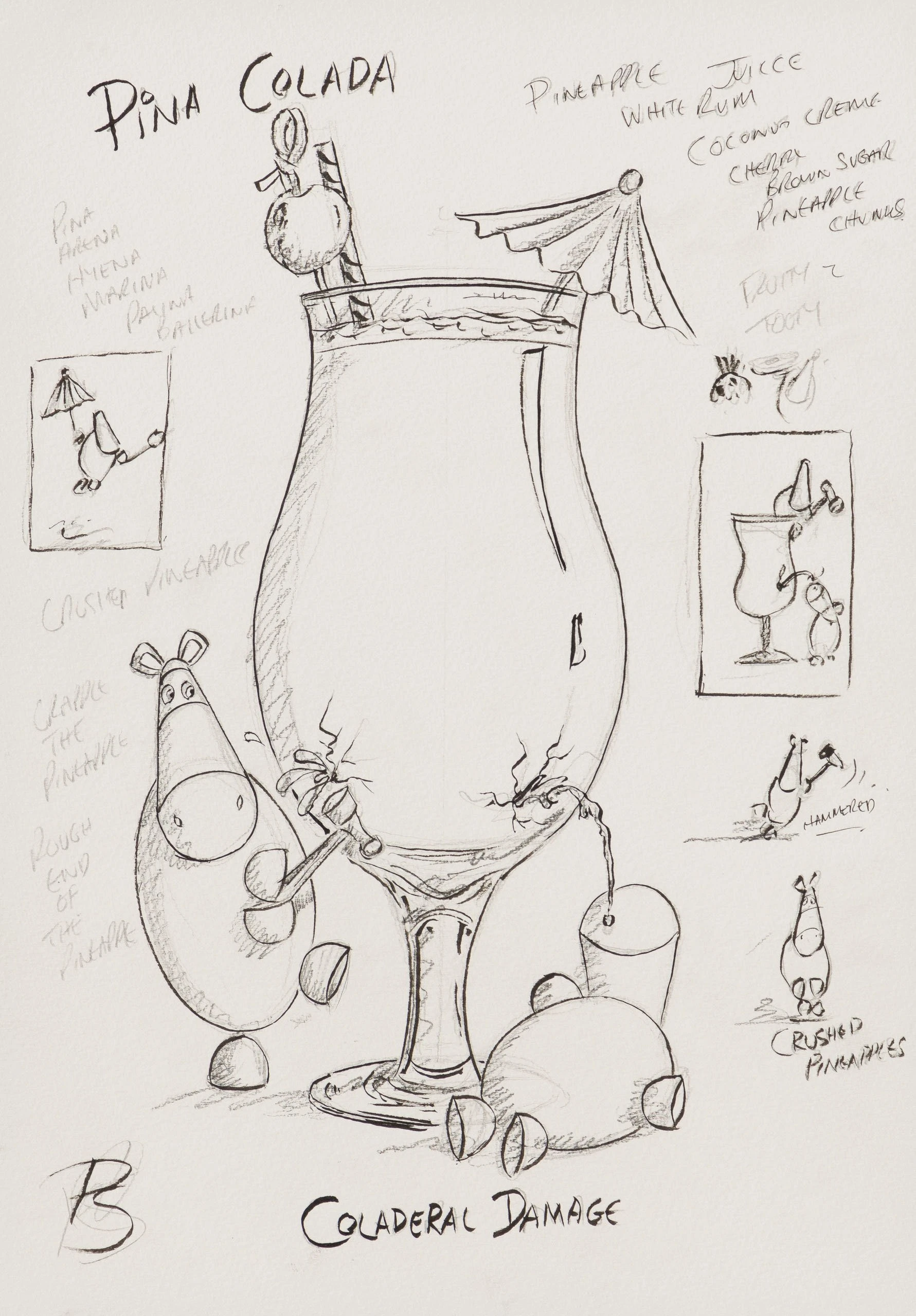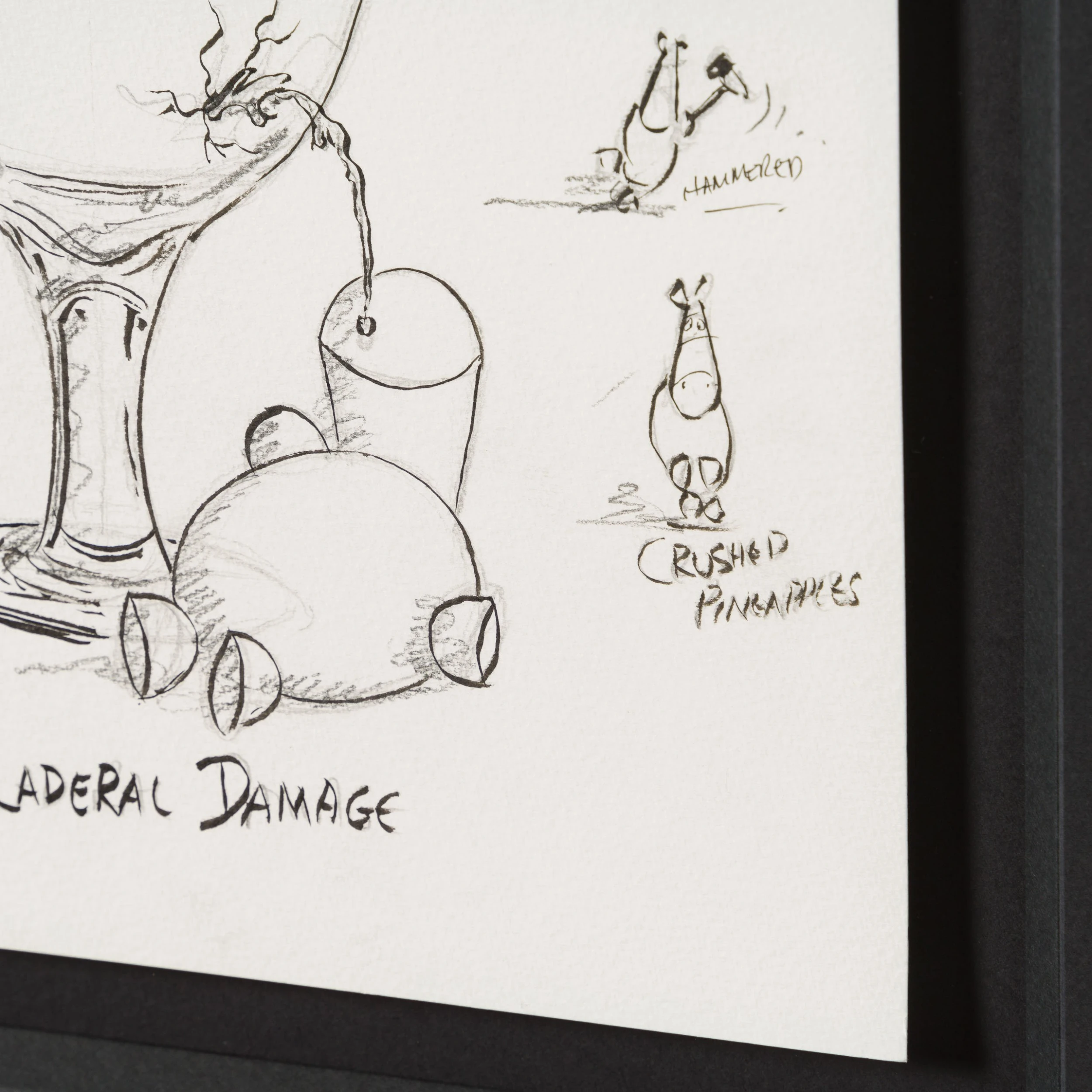 The artistic duo is back by popular demand with the latest in their Impossimal drinks series: ‘The Shaker Maker’, featuring their own twist on a menu of the classic cocktails we all know and love. The Shaker Maker sees the Impossimals bring out in glorious bold colour the fun we know and love, coupled with a bit of Dutch Courage and remind us to find the humour in life, ourselves, and the times we share with friends and family! In a traditional still-life composition creating a visually appealing and balanced image, โColaderal Damageโ is a drawing the artist created before mastering the oil painting.