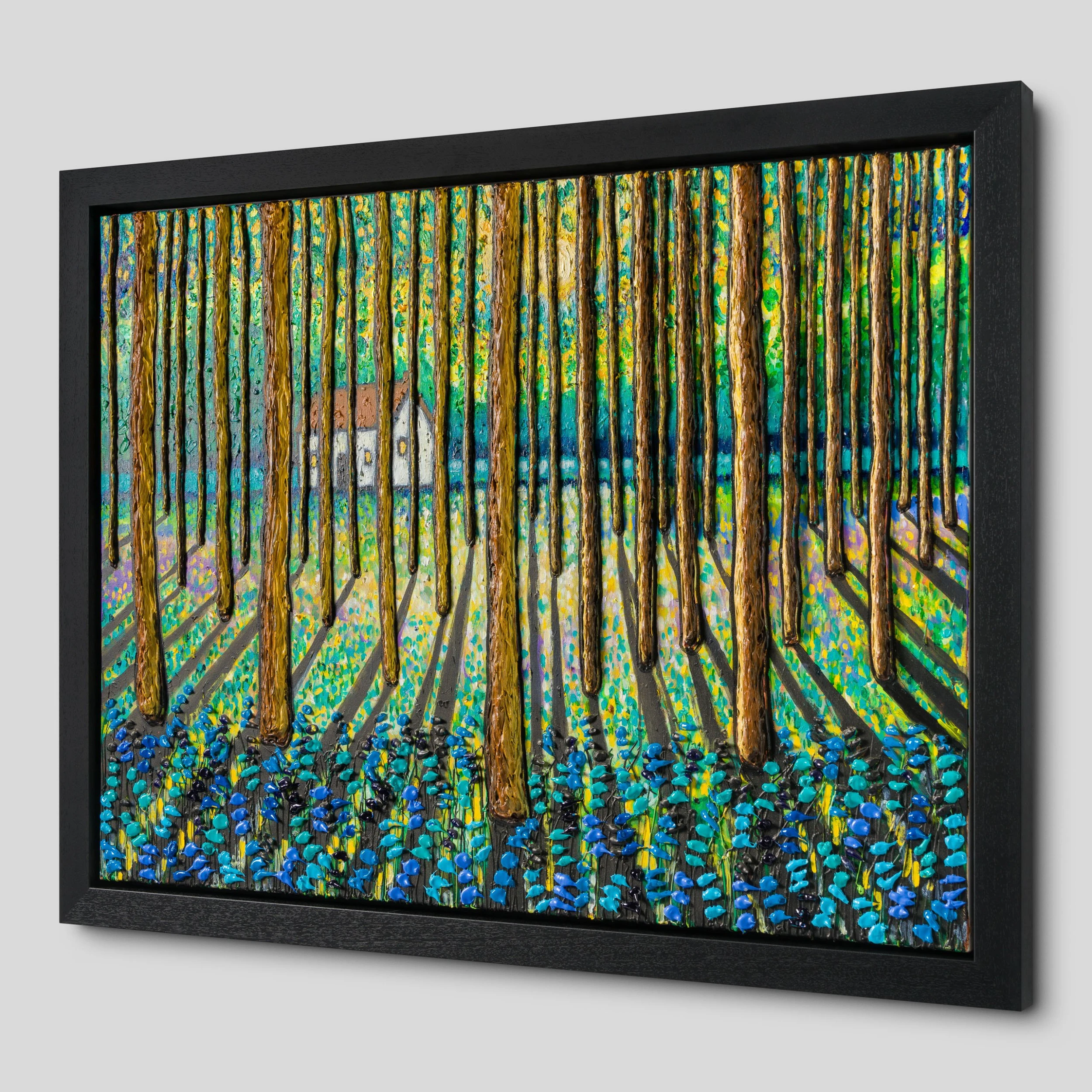 In “Cottage In The Woods”, the artist depicts the countryside with beautiful depth. In-between tree branches, Raven adds a white cottage, an element featured in multiple paintings in this collection. One of her most passionate pieces, this artwork is full of love for natural surroundings with bold and bright colours. Working with oil paints and acrylics, Scarlett adds splatters and daubs of paint to replicate the abundance of textures found outdoors. With stylistic influences from Anselm Kiefer, Gustav Klimt and David Hockney, her emotive works are inspired by her personal connection with nature.