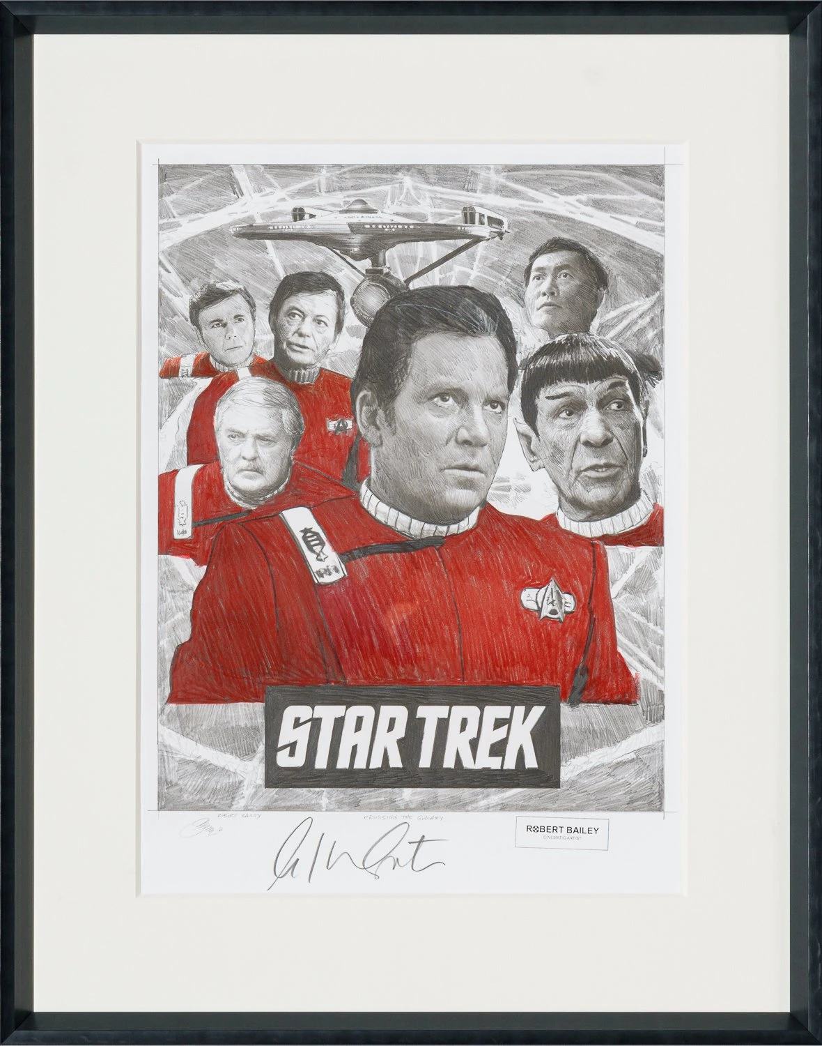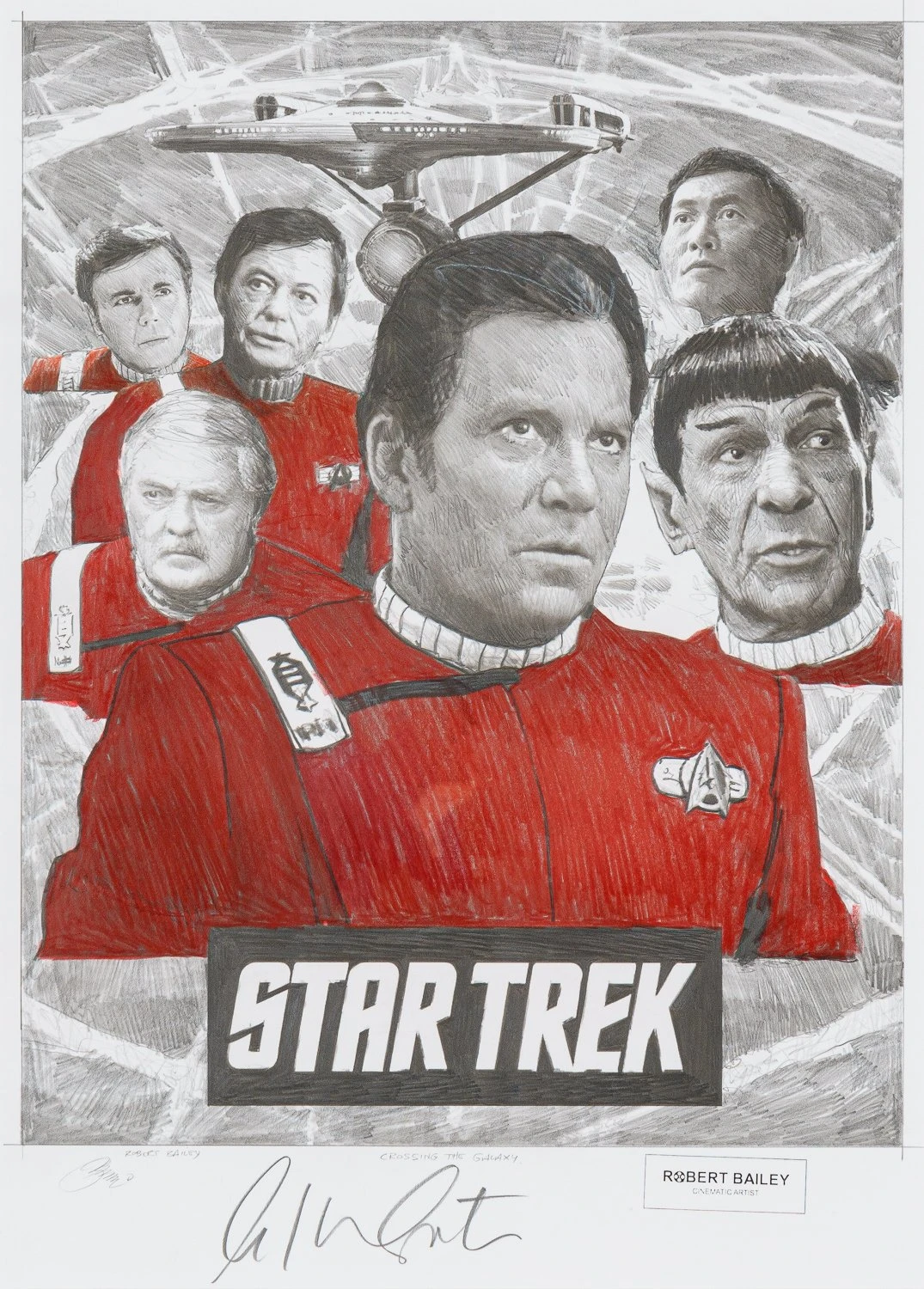 With bright pops of red accentuating the different tones of delicate graphite, this otherworldly original drawing by Robert Bailey perfectly captures the iconic characters and retro quality of Star Trek: The Original Series.