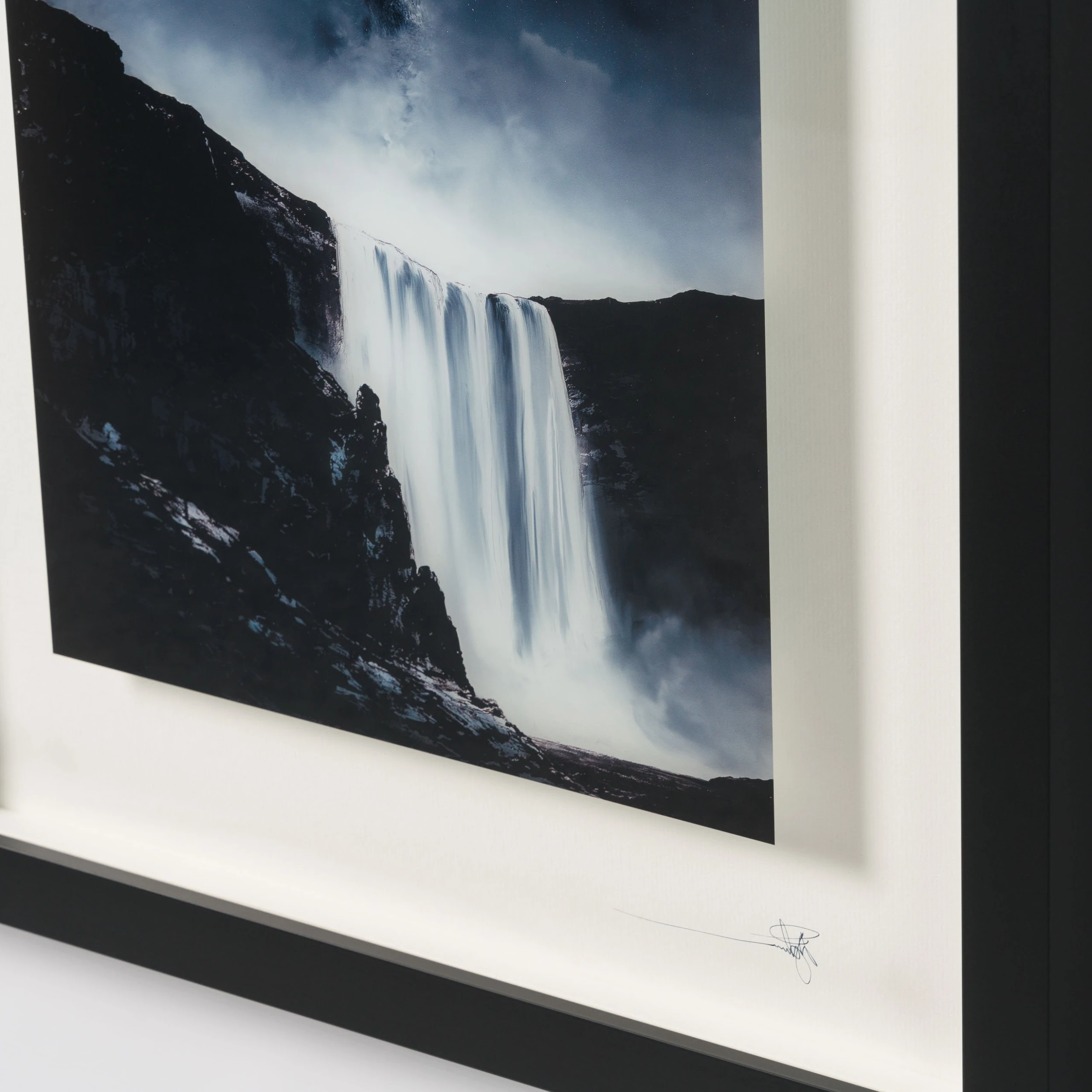 “Dark Days, Bright Nights” is a beautiful, striking limited edition print of based on a landscape in Iceland. Not only is this piece special technically, given the combination of the night sky, the waterfall and the Milky Way painted with minimal colour, but also given the memories the artist has in Iceland. The detail and precision of the brush strokes are astonishing, elevating the level of realism. Rowan painted this piece while listening to “The Way Of Water” by Solstice Beats.