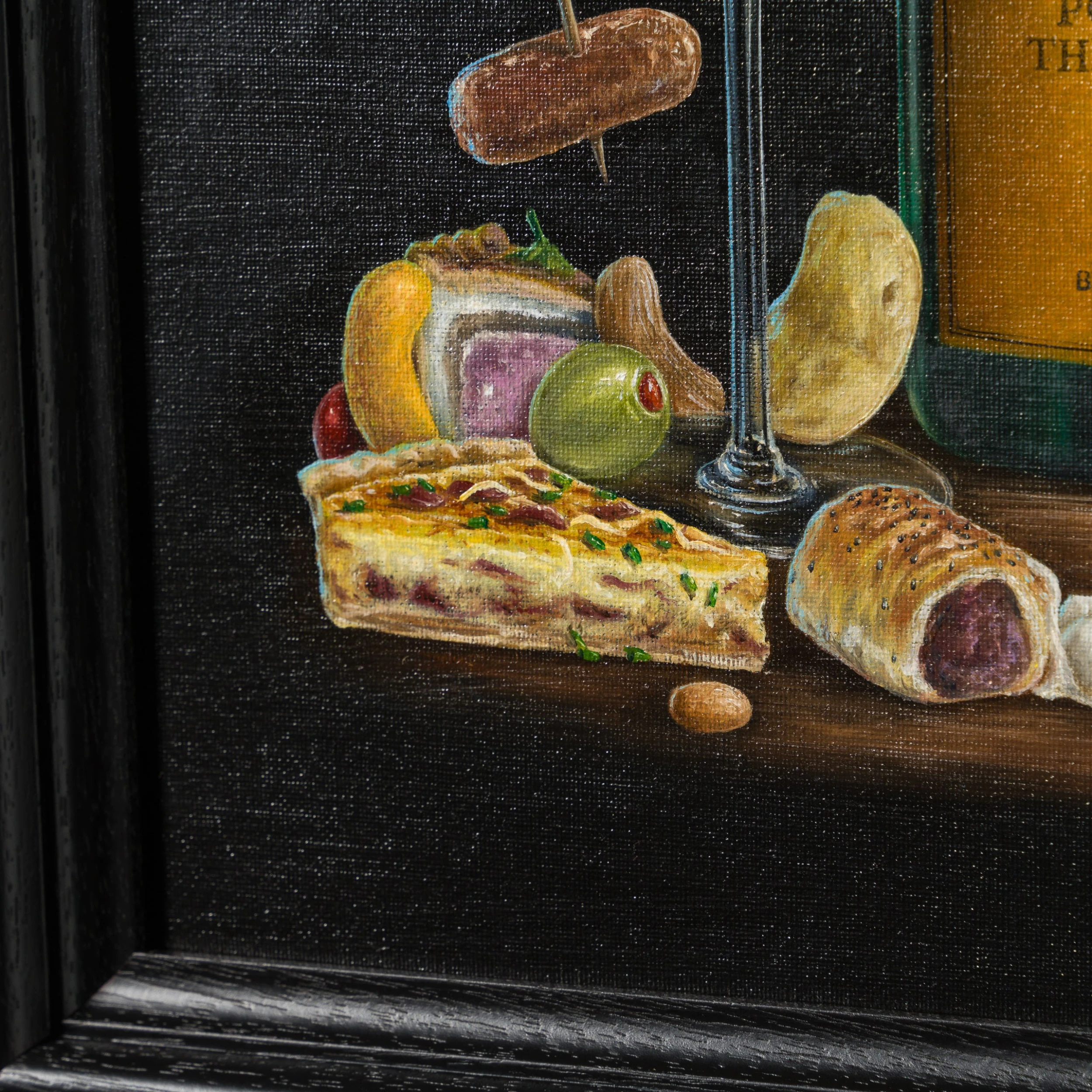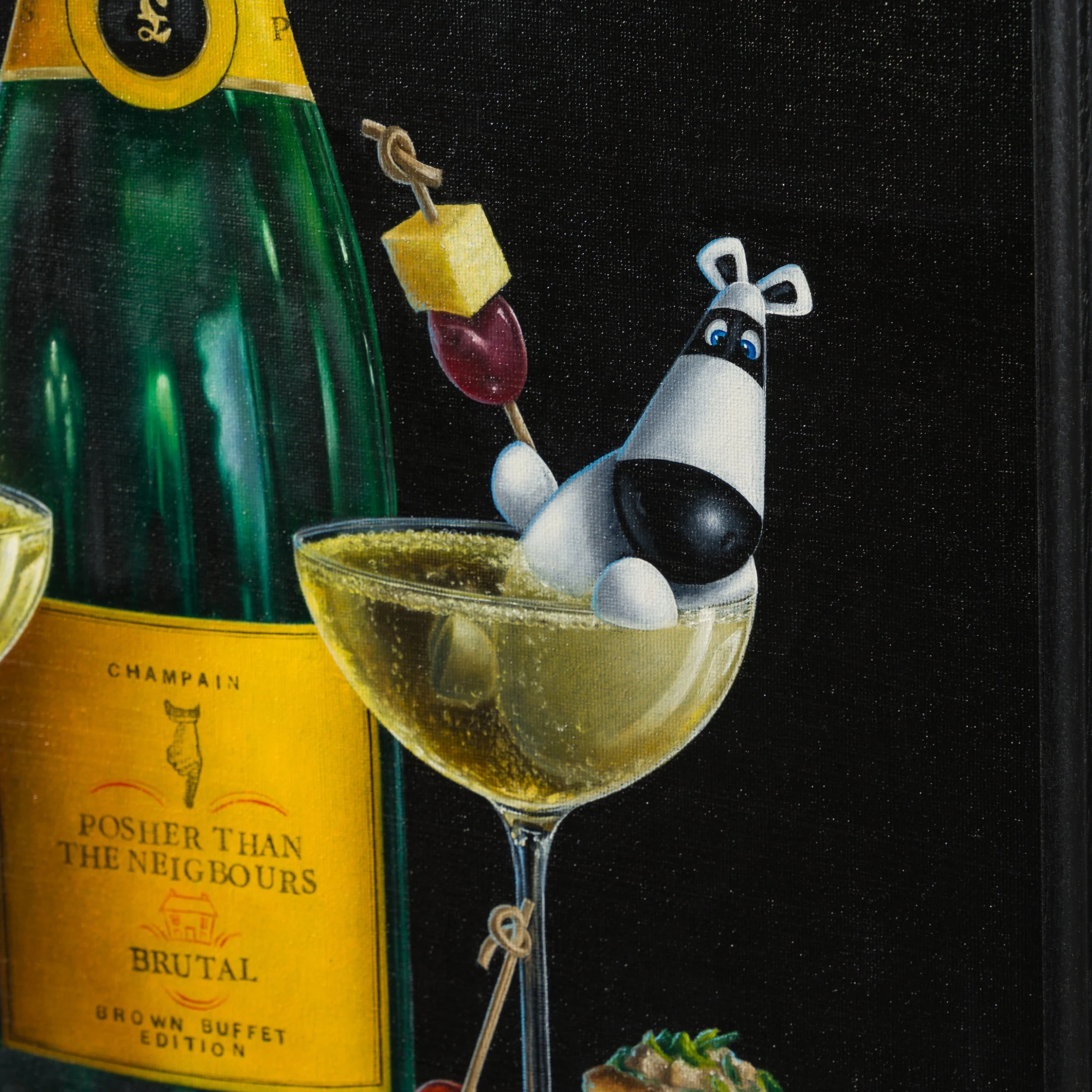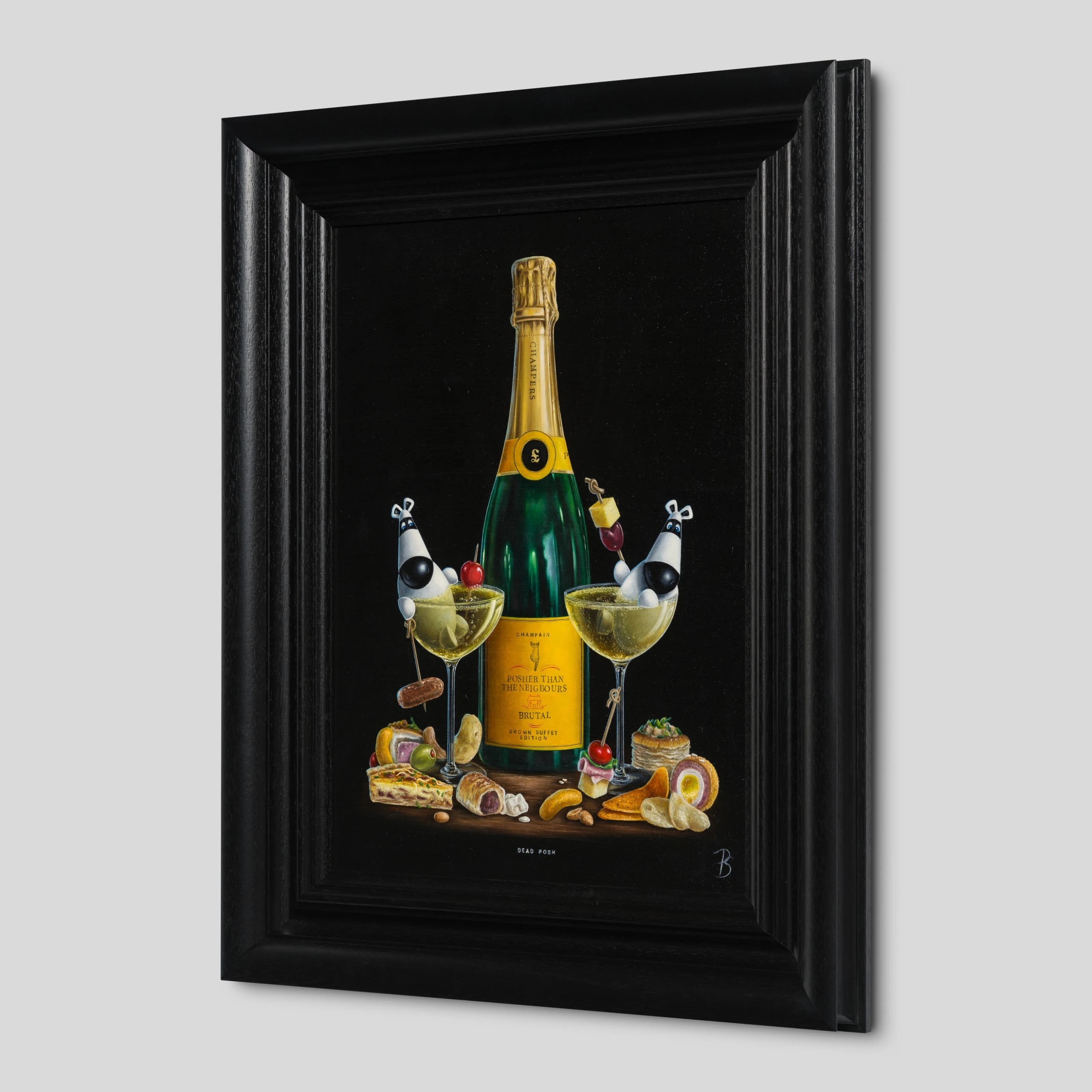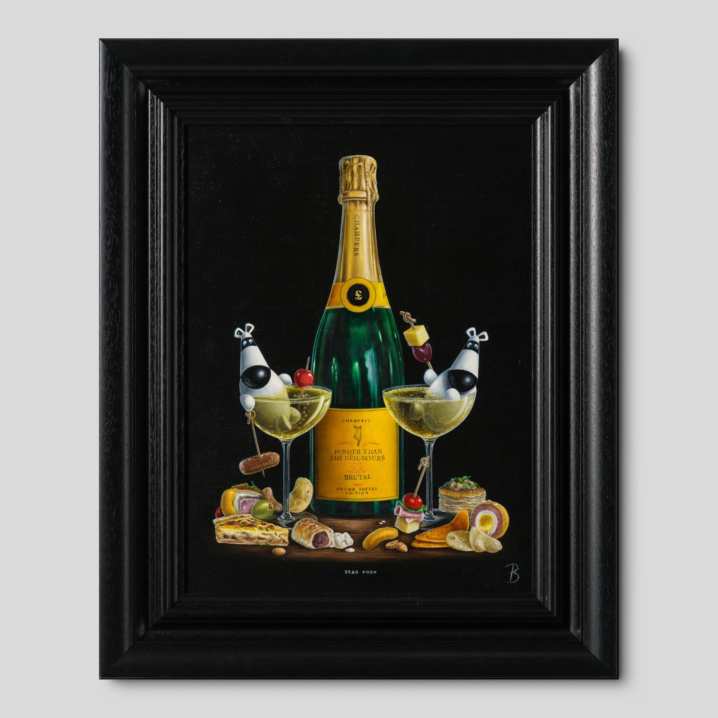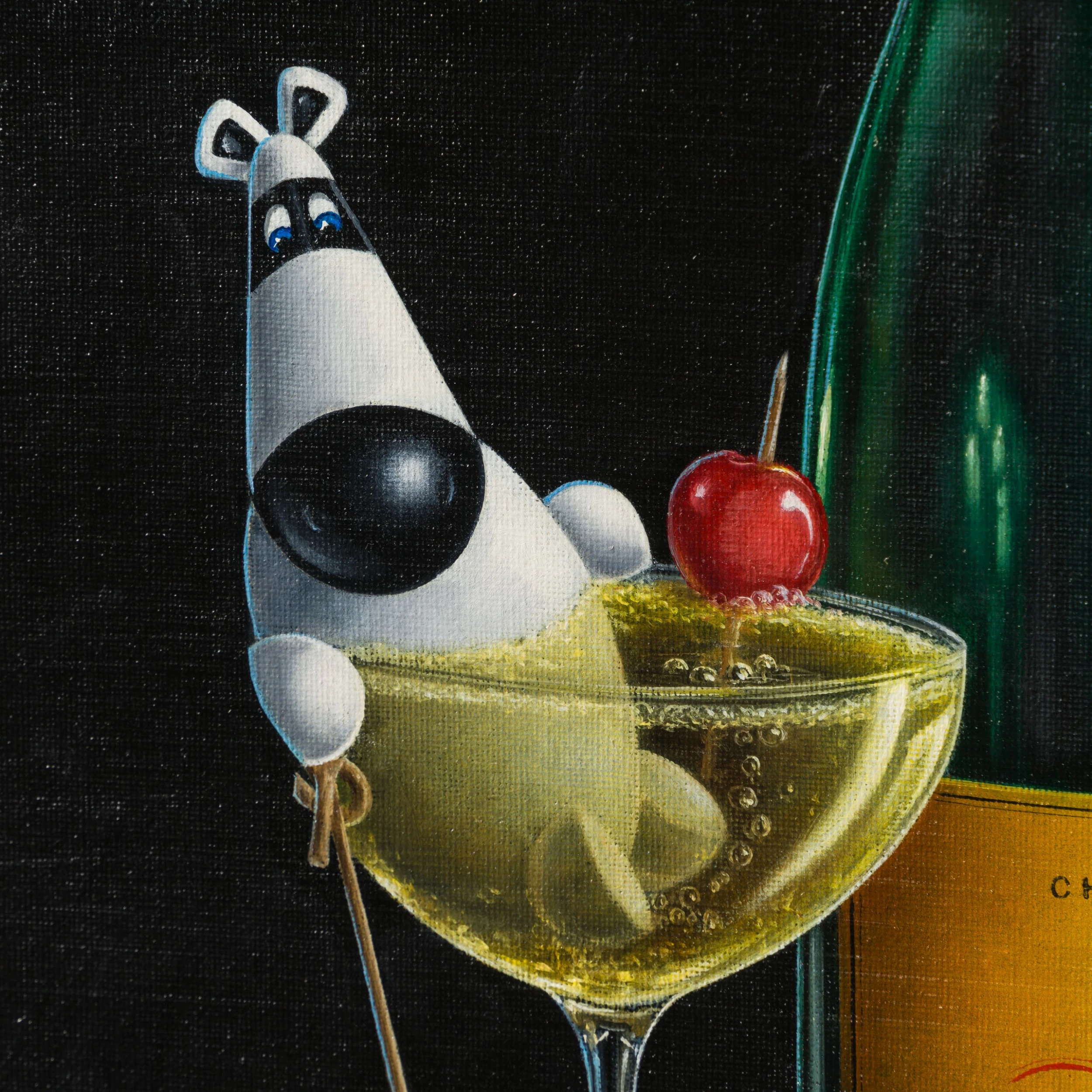 In a traditional still-life composition creating a visually appealing and balanced image, “Dead Posh” is vignetted by a classic and simple black background. The bold colour is incredibly punchy, completely focussing the attention on the tantalising tipple and scene at hand. Ever a fine artist, the piece has been painted in vivid oil paint with the incredible craftsmanship we have come to expect from skilled still-life painter,