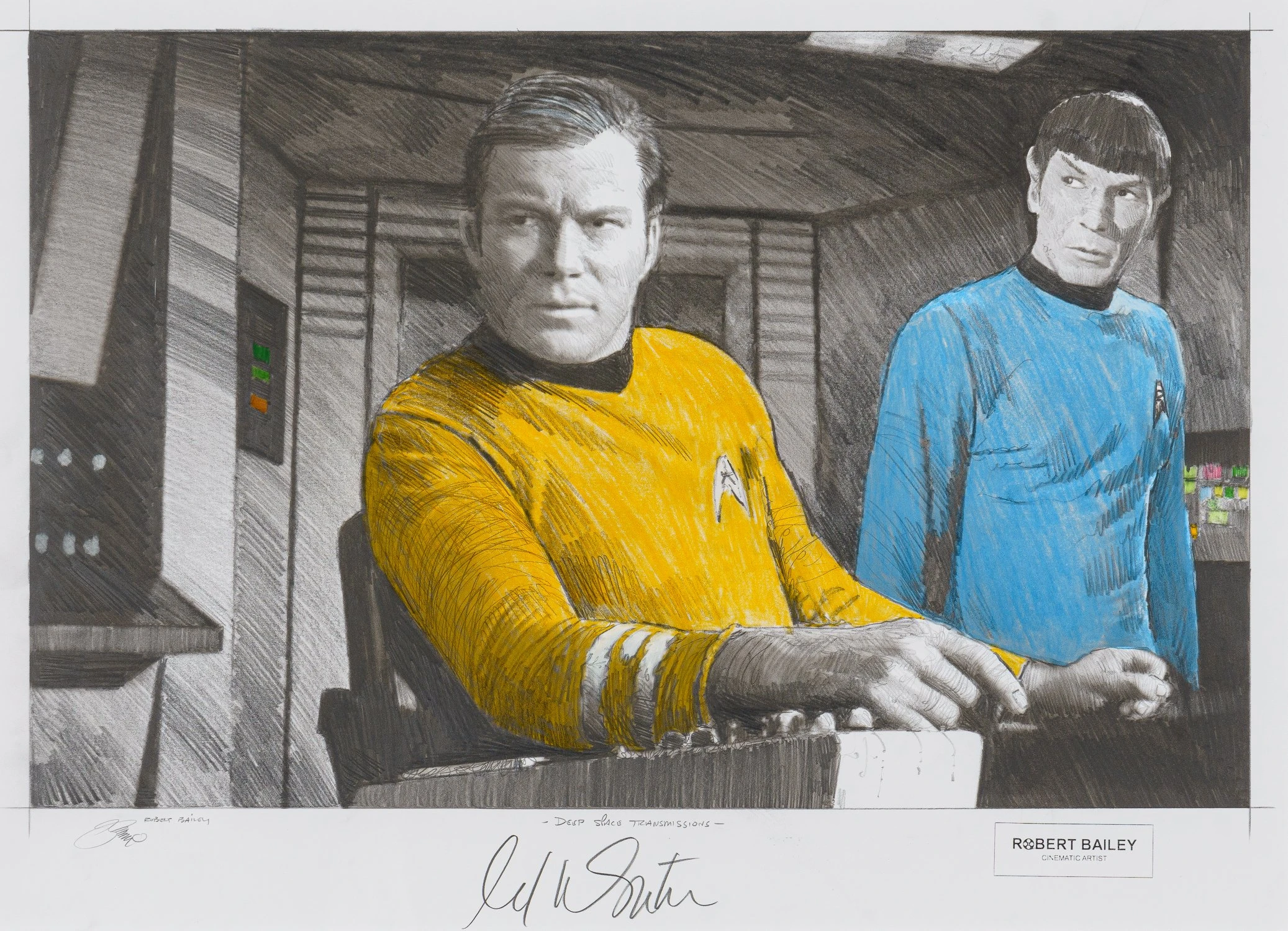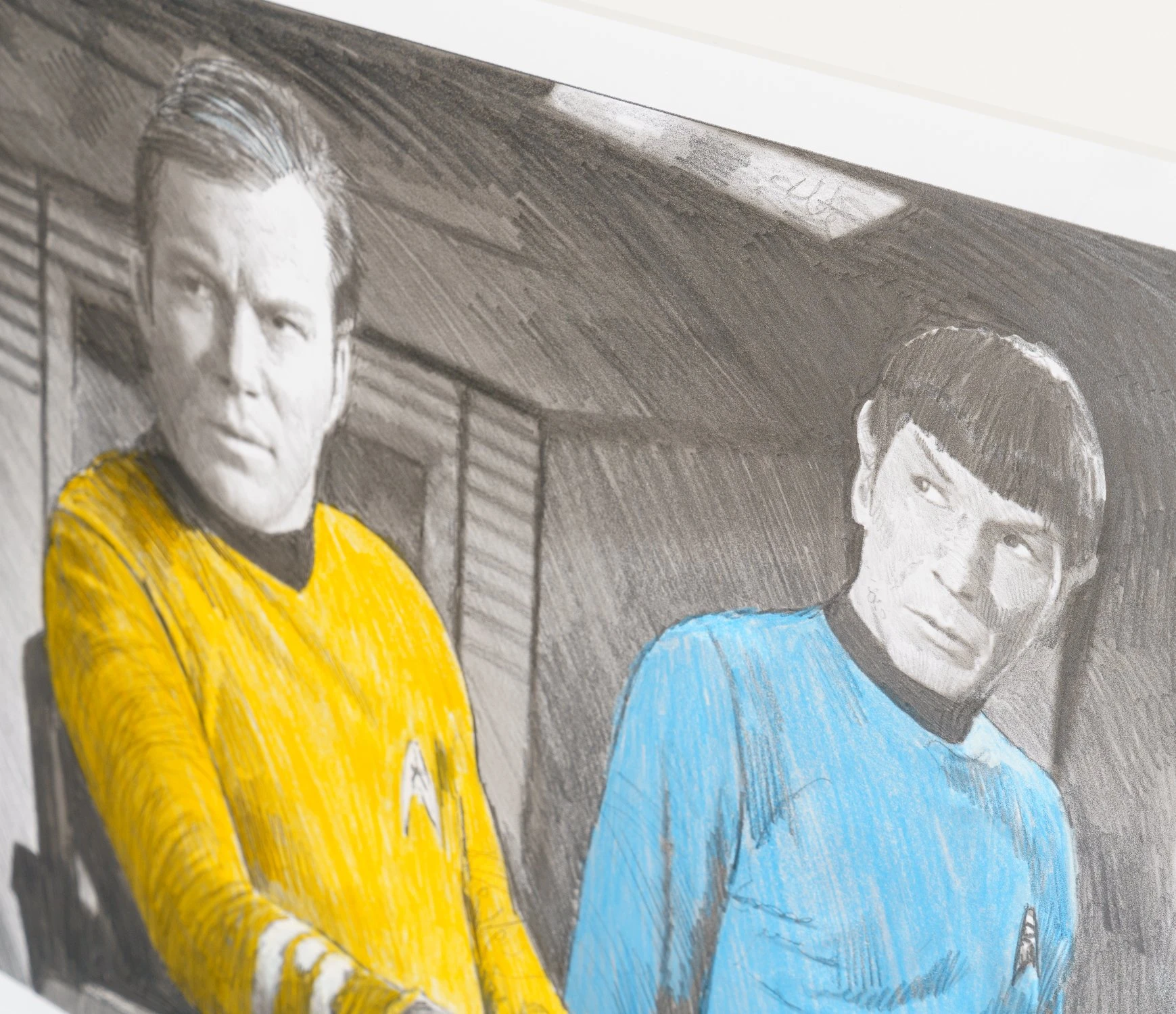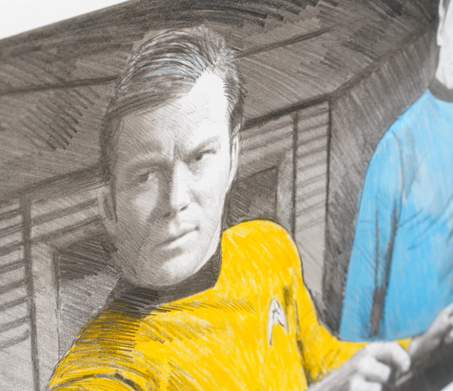 With bright pops of blue and yellow accentuating the different tones of delicate graphite, this otherworldly original drawing by Robert Bailey perfectly captures the iconic characters and retro quality of Star Trek: The Original Series.
