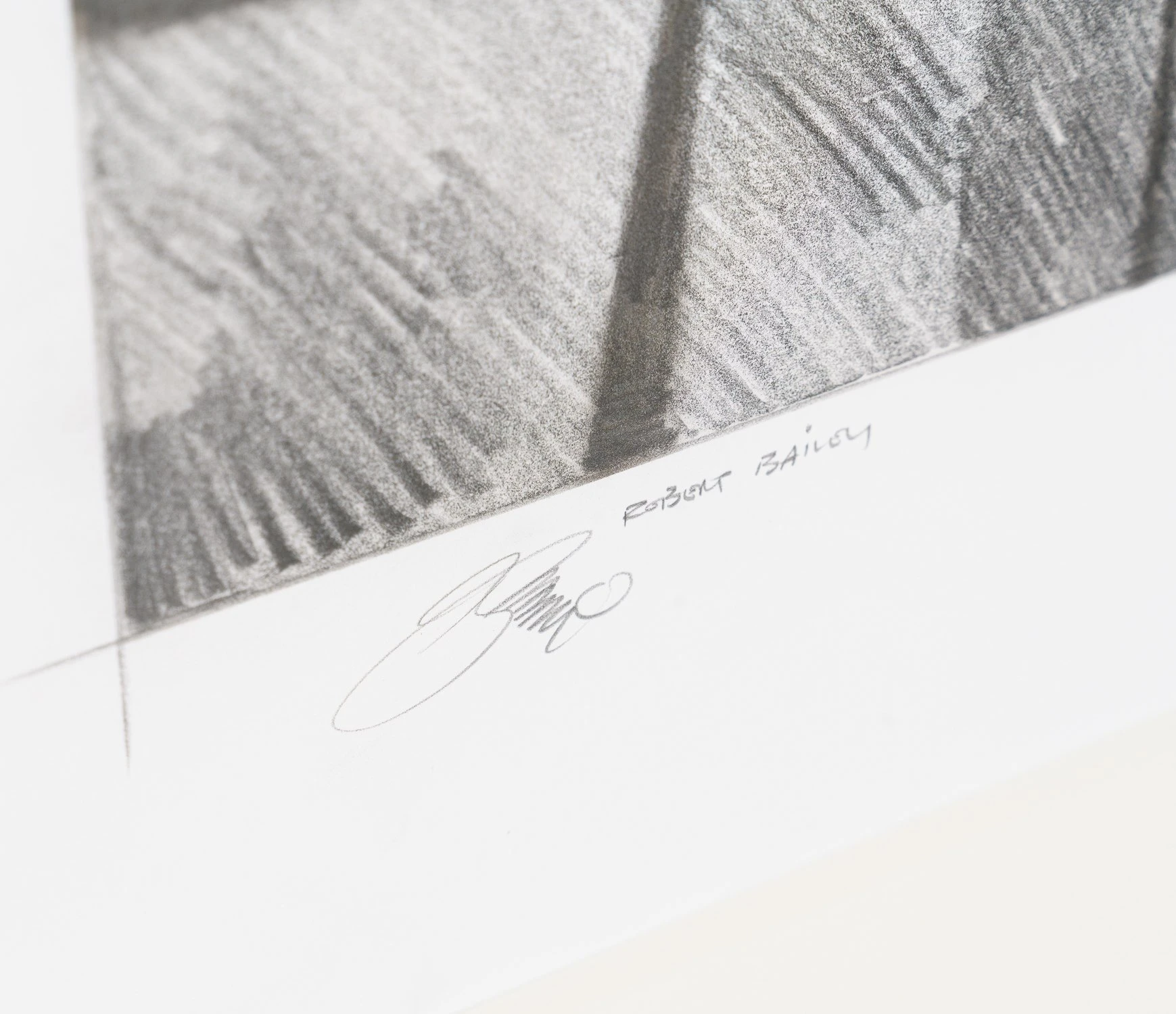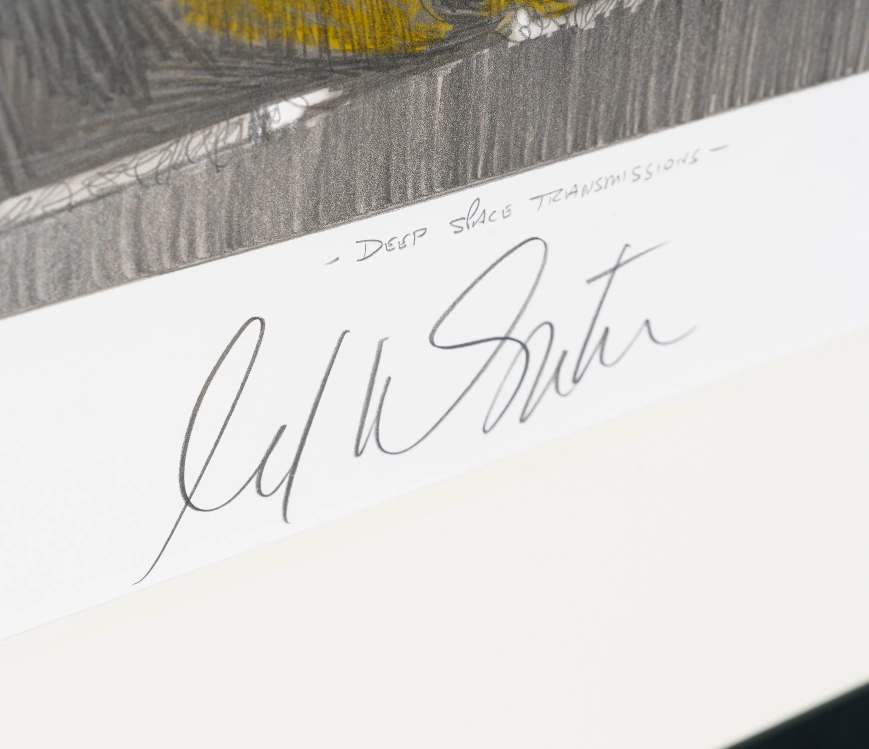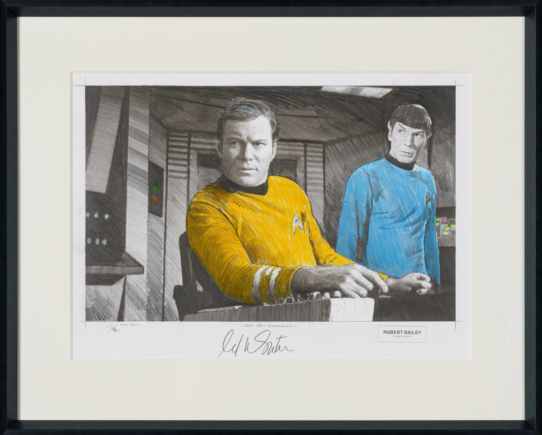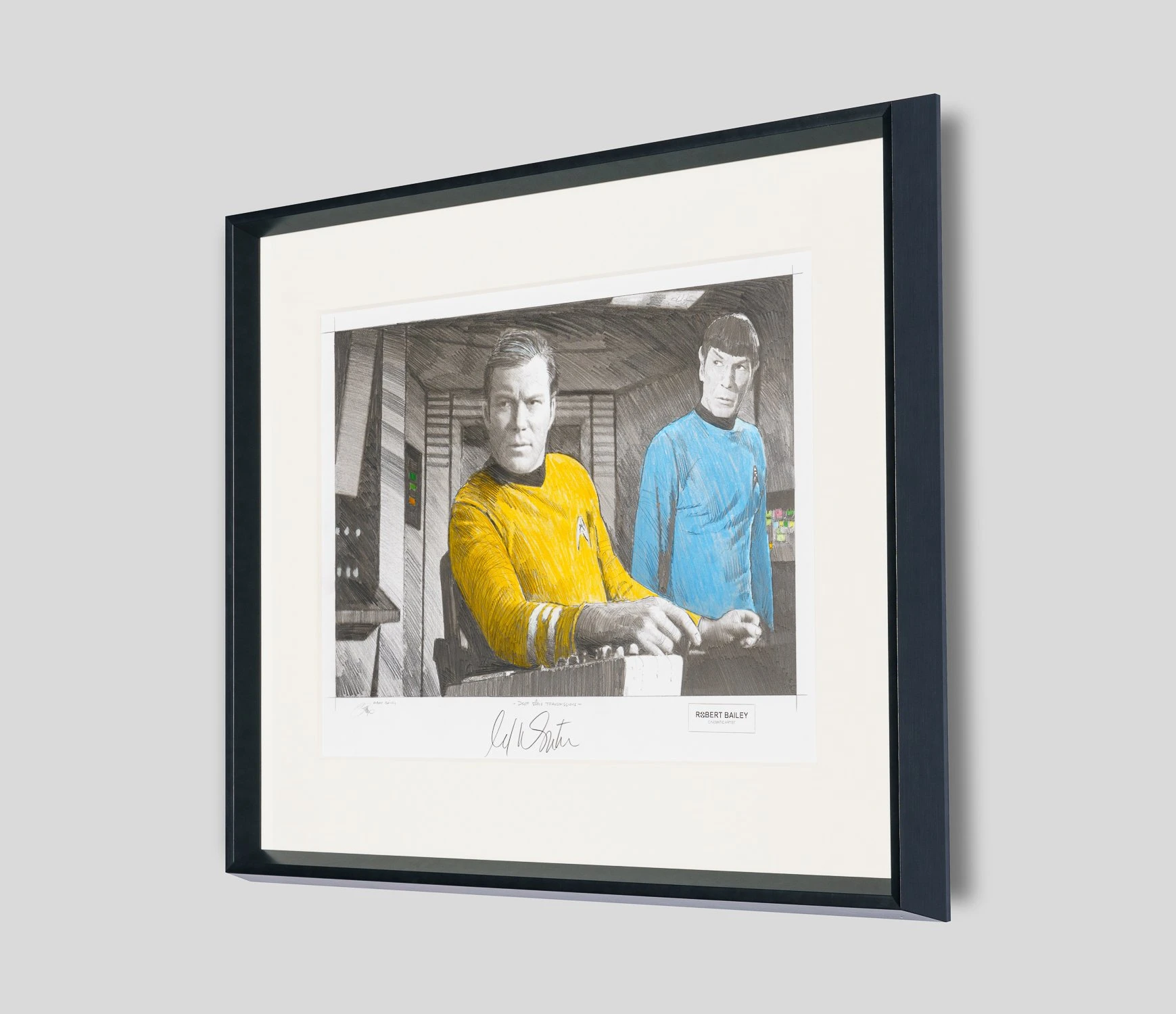 With bright pops of blue and yellow accentuating the different tones of delicate graphite, this otherworldly original drawing by Robert Bailey perfectly captures the iconic characters and retro quality of Star Trek: The Original Series.