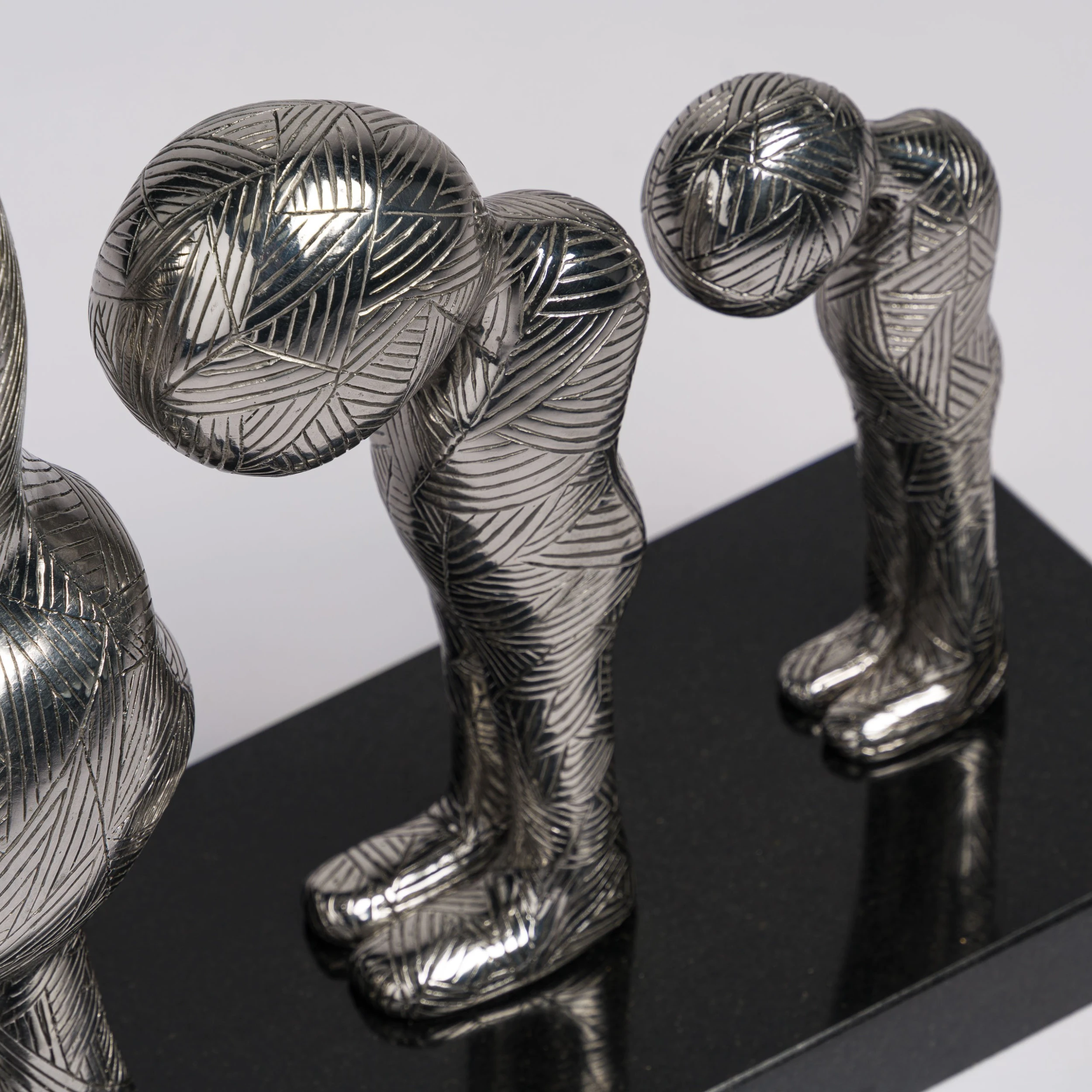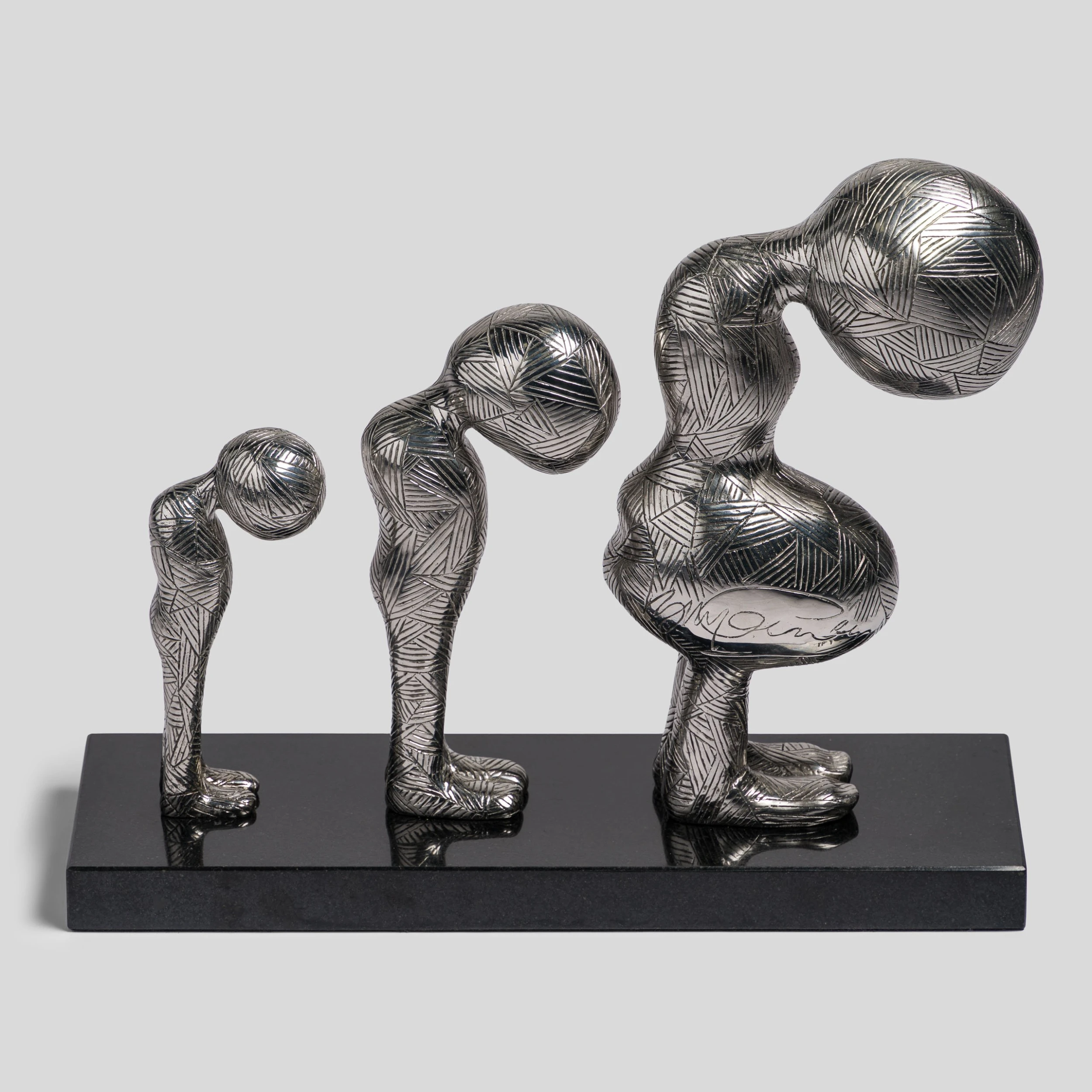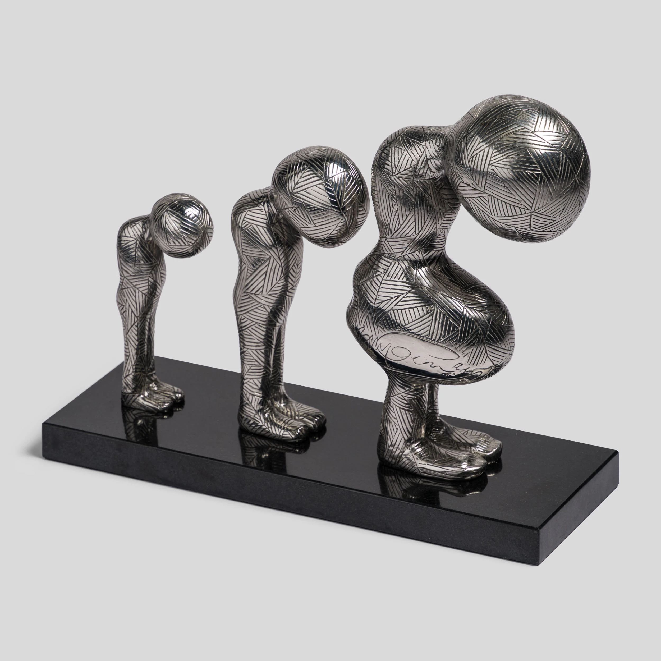 These thought provoking sculptural images are very dear to Billyโs heart. Formed first in clay to capture the detailed lines of his signature style, these sculptures are then cast in stainless steel, subtly referencing Billy’s time as a welder in the shipyards of Glasgow. Contrast is created between detailed and patterned areas through intricate texture and polishing to beautiful and dramatic effect. Timeless artworks from one of our timeโs most original thinkers.