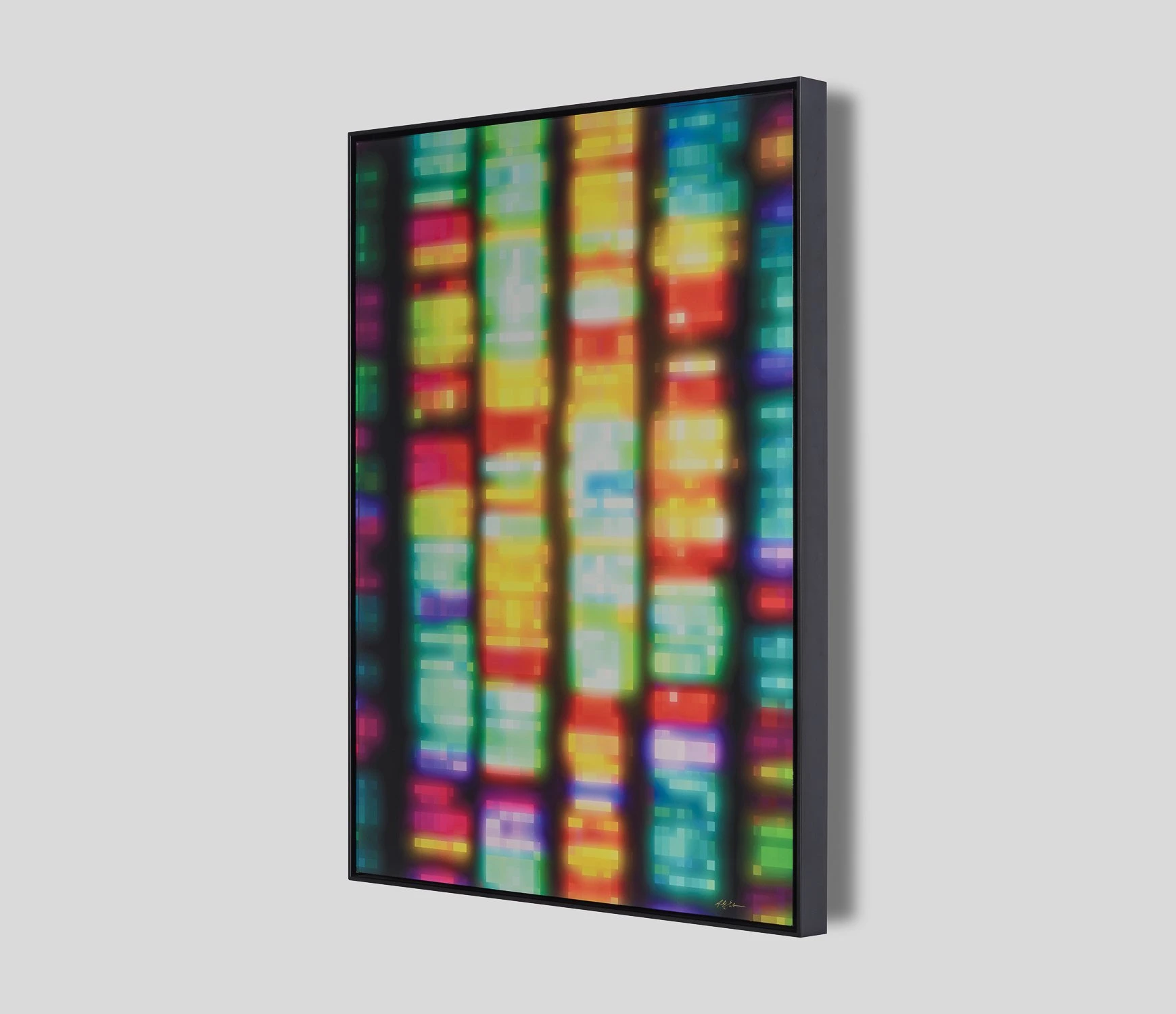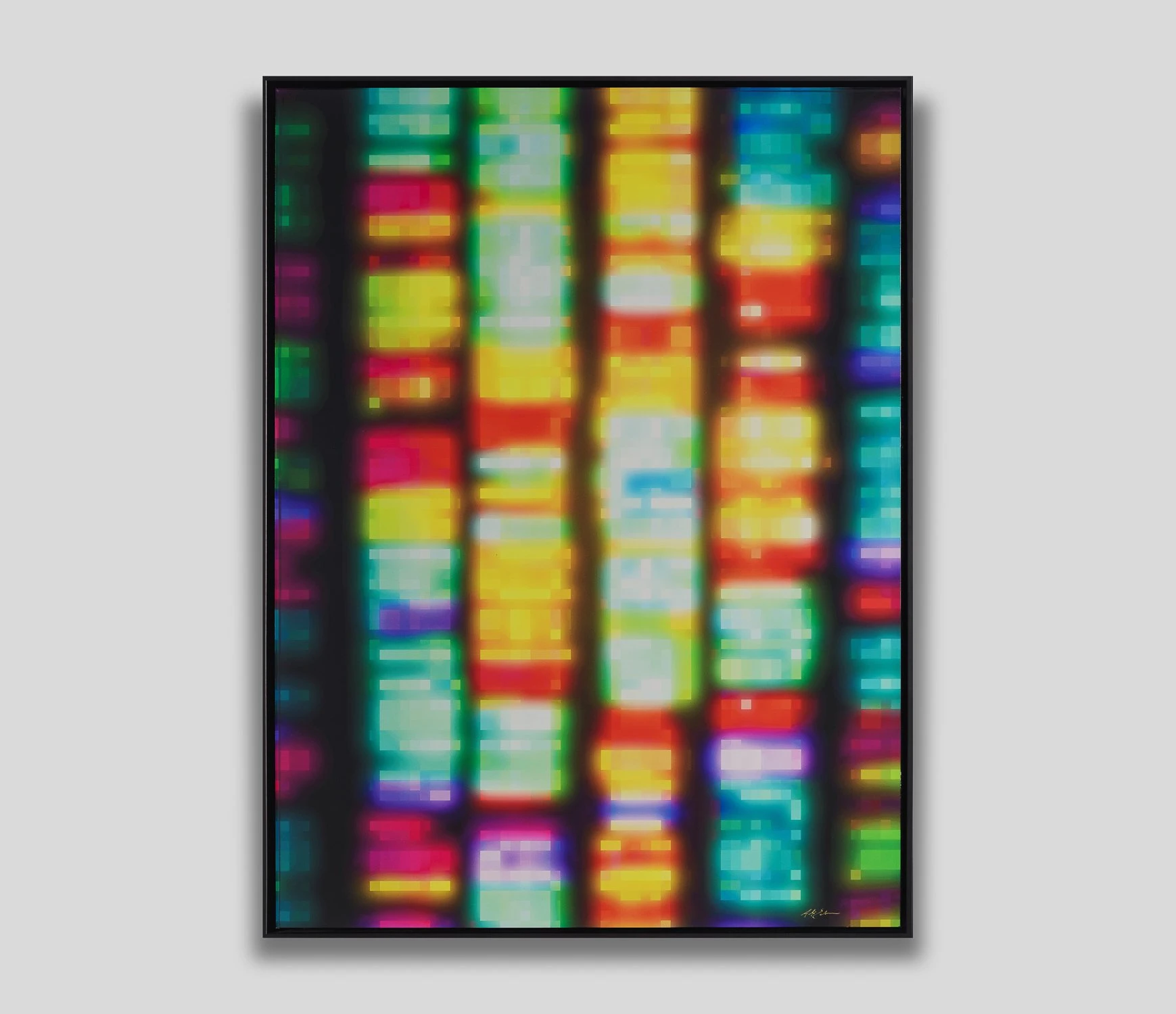 “As an artist I try to keep learning, challenging myself, reflecting on arts history and always looking forward. Seeking always to create something original and unique.”- Alex Echo. This digital artwork is a departure from the artist’s acrylic and resin abstract works and instead represents a pixelated rendition of the artist’s own DNA code. Get in touch with an Art Consultant to find out more!