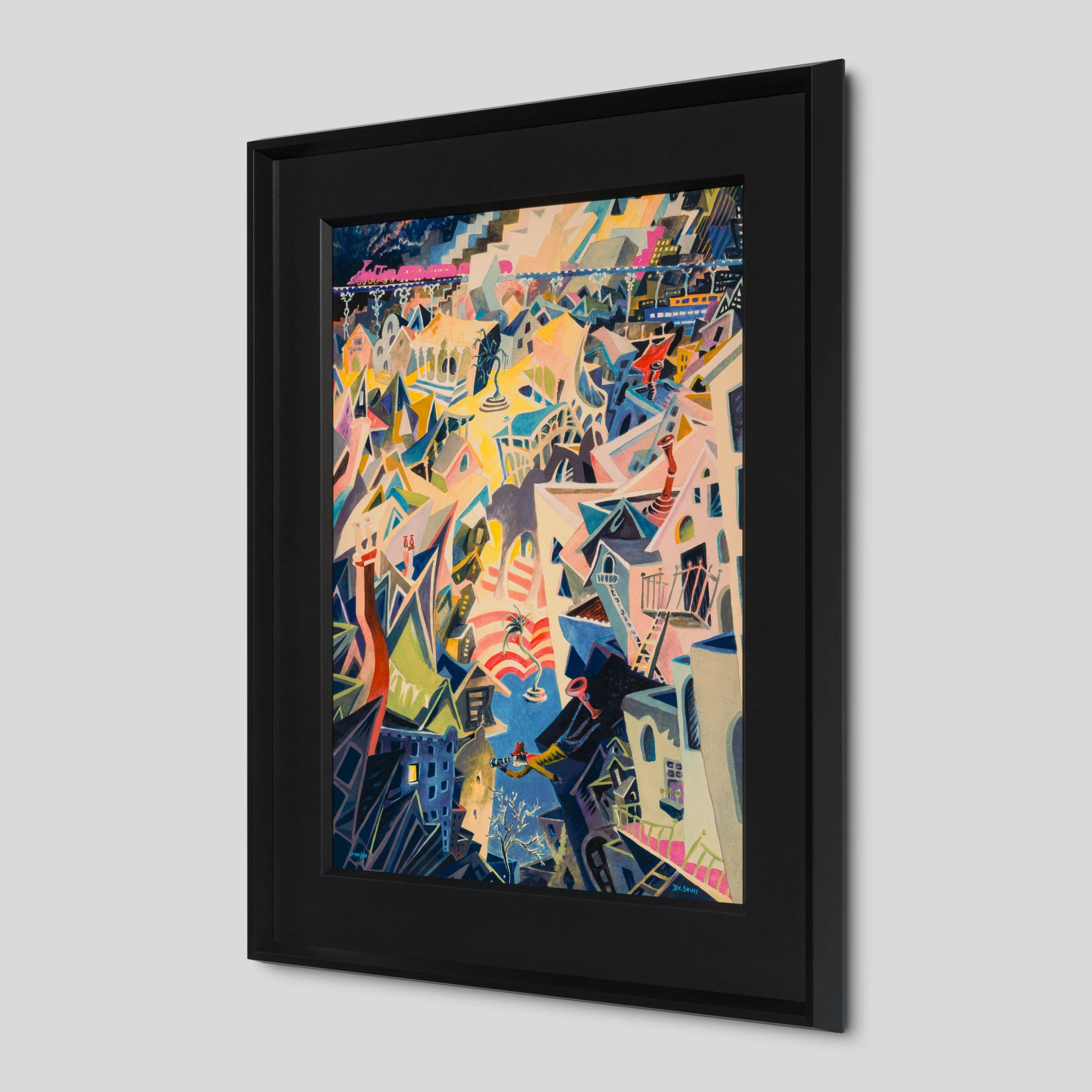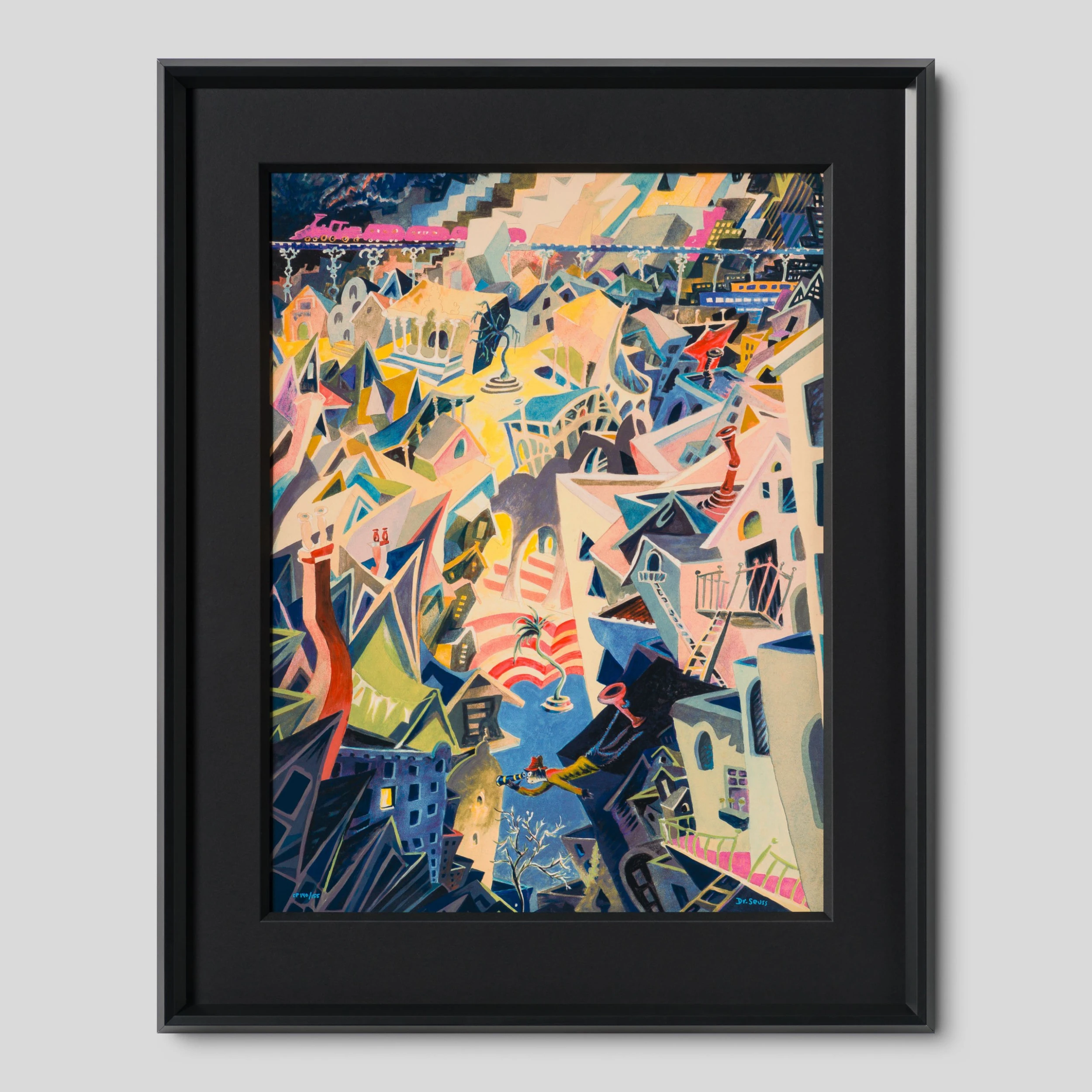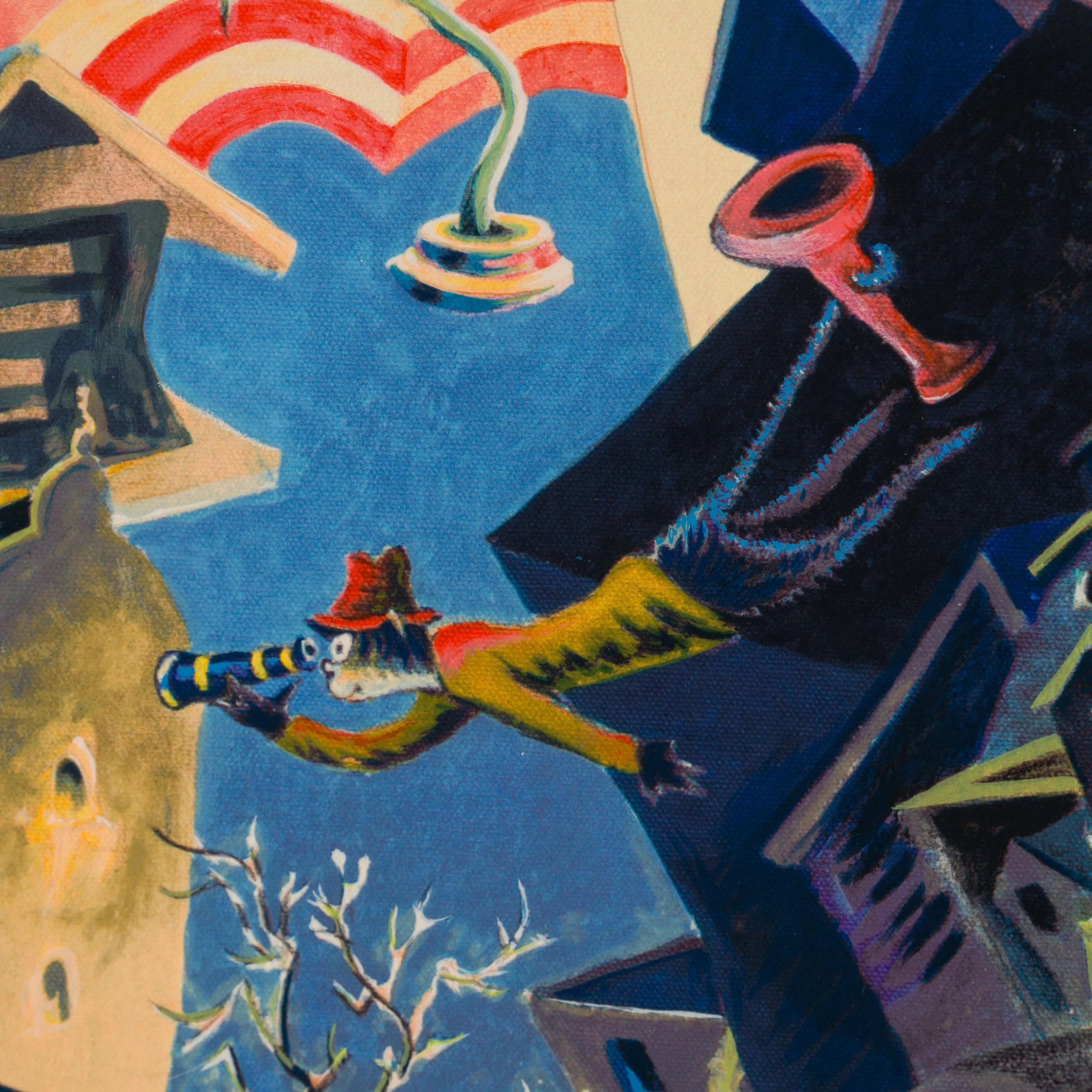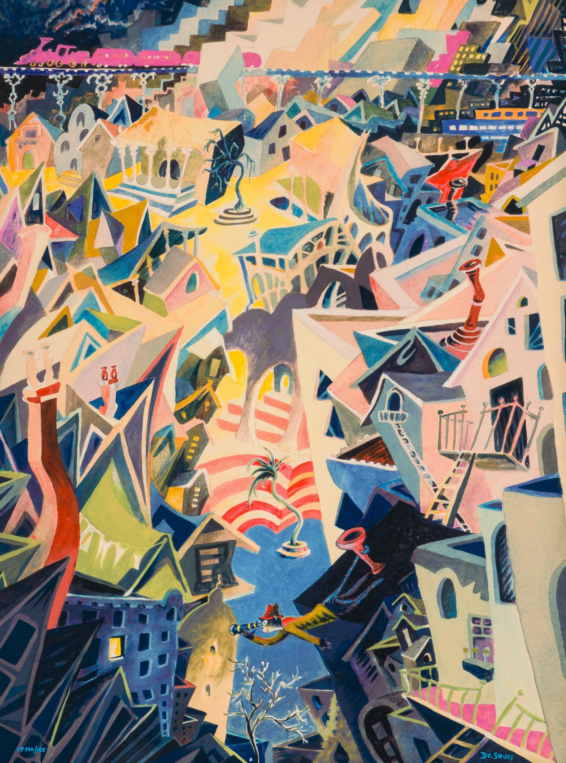 Adapted posthumously from the 1969 original pencil and watercolour on illustration board. Here abstract expressionist style surrounds us with architectural echoes that are uniquely and stylistically Seuss. With a wink, he transports us to this stunning town and then leaves us wondering exactly where we are. Could this artwork be a Seussian travelogue of the cities Ted adored and which enticed him to explore time and again?