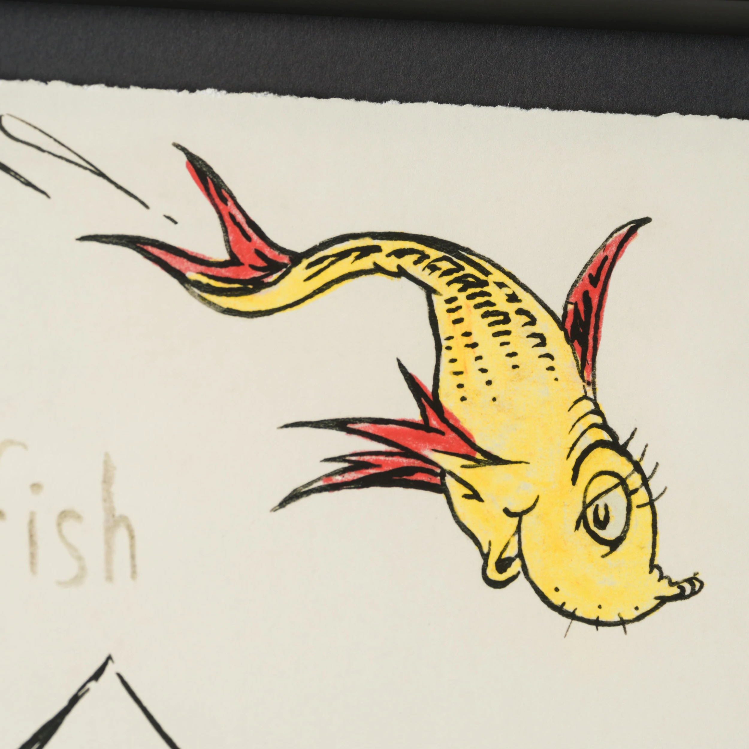 “One Fish Two Fish Red Fish Blue Fish” is an iconic story that breaks down the early reading process through imaginative images and pure fantasy. It celebrates ability to show us how elemental life can be if we just stop, focus, engage, and laugh. This iconic 60th Anniversary image seems to mark the culmination of Dr. Seuss’s determination, open-mindedness, and willingness to meet challenges head-on.