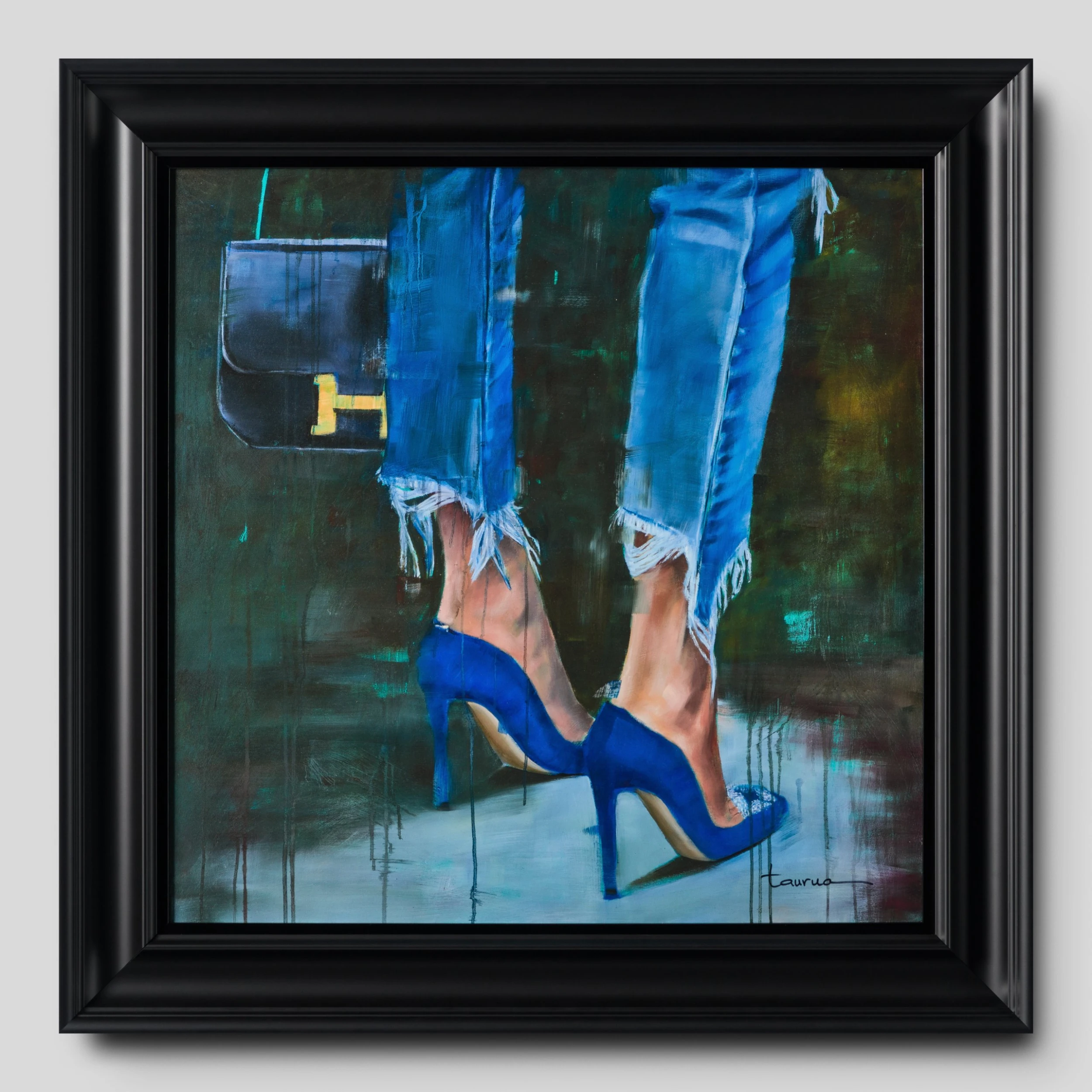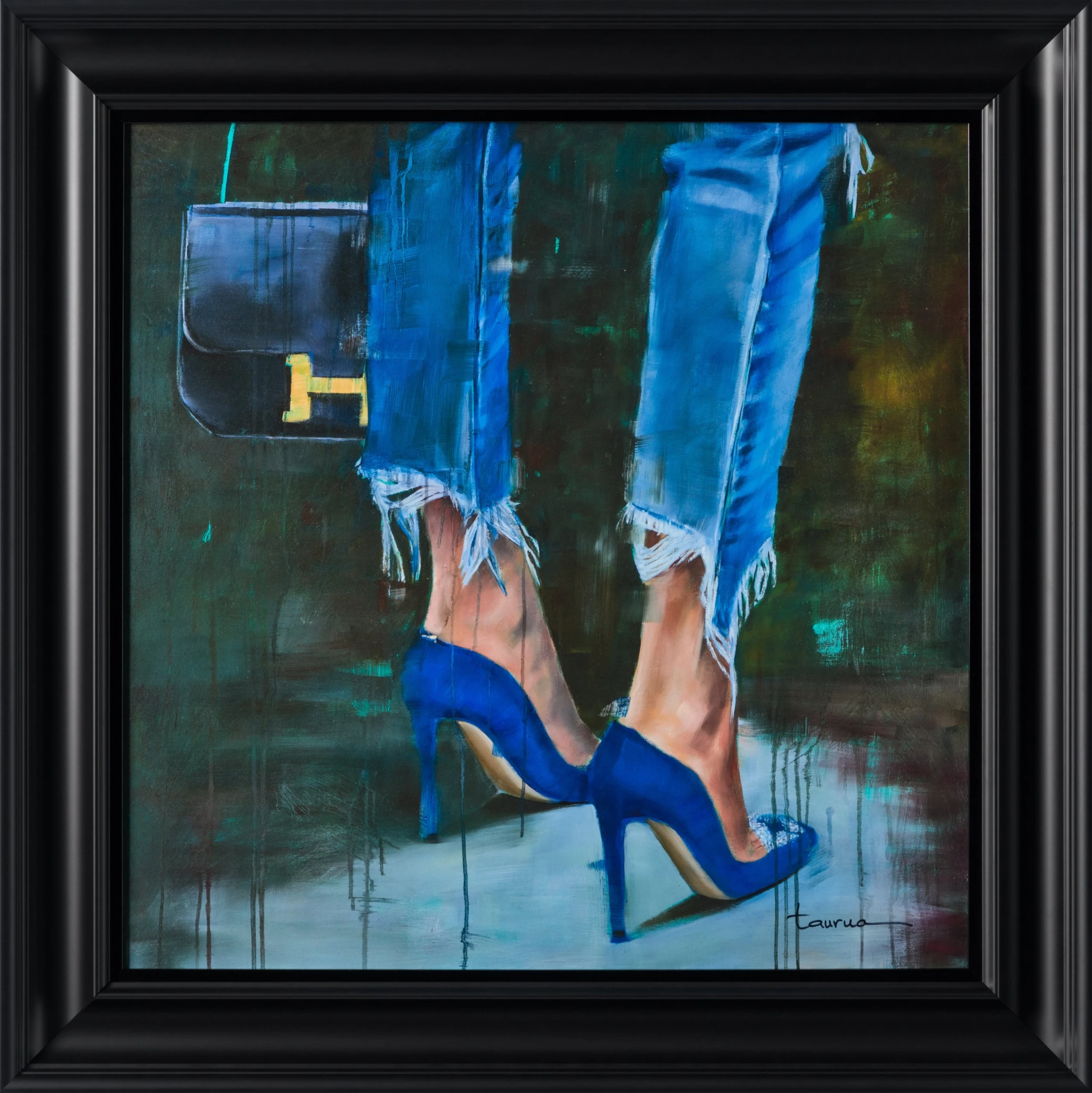 A playful mix of vivid and subdued tones drip down the canvas in this signed limited edition artwork by Pascale Taurua. We see delicate, frayed strands of denim hover above dainty ankles adorned with the classic blue Manolo Blanik ‘Hangisi’ shoes made famous by TV show and film ‘Sex and the City’. Next to them, swings a beautifully portrayed Hermès ‘Constance’ bag, designed in the 1967 and characterised by a simple yet effective ‘H’ clasp. A bold mix of contemporary fashion with classic glamour, this artwork will add an exciting pop of colour and style to any space.