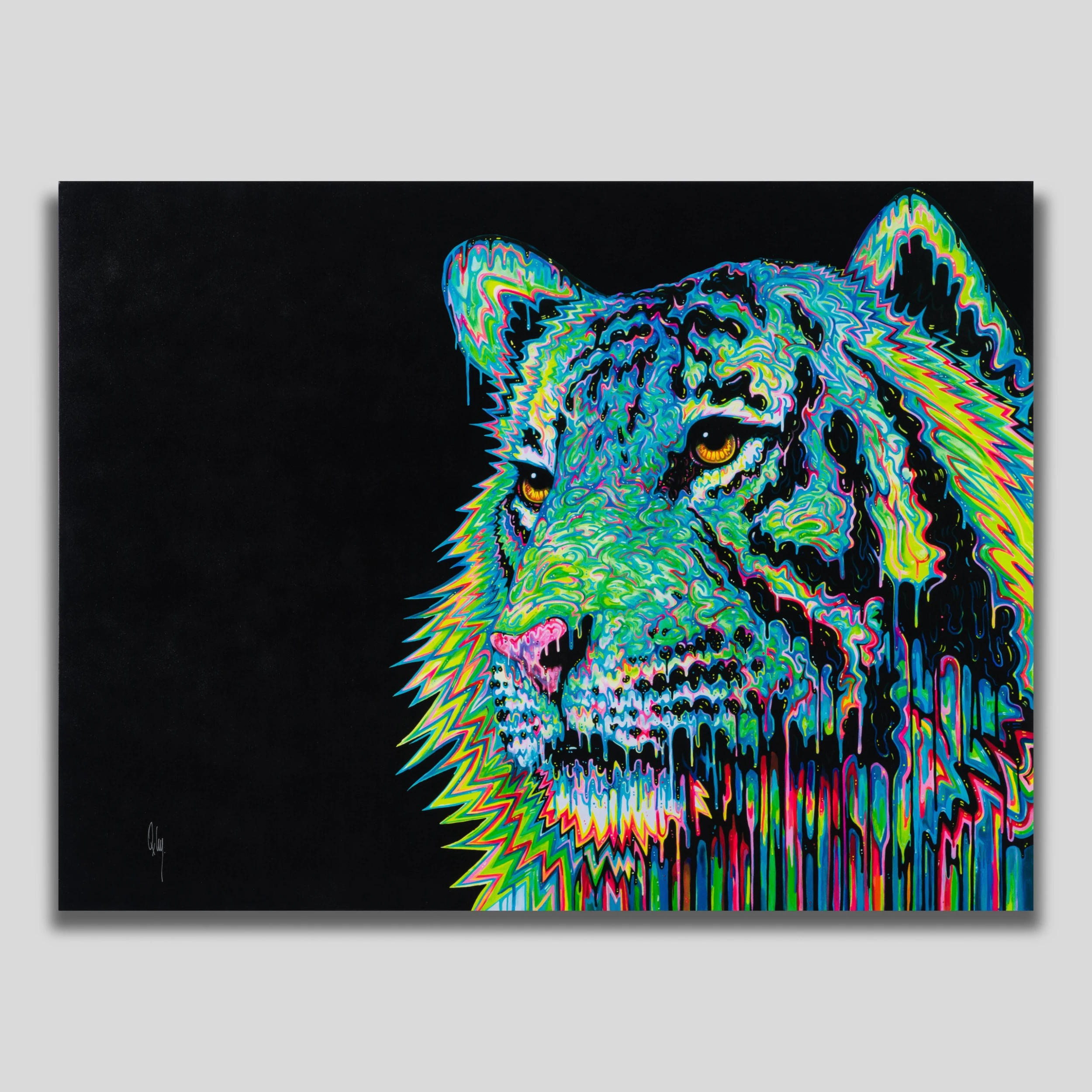 Vibrant colours appear to explode out and drip down the canvas of this powerful limited edition artwork by Robert Oxley. The traditional colours of a tiger are overthrown by exciting shades of green, pink, yellow- to name a few- that breathe life into the dark black background and create a majestic and powerful impression of nature.