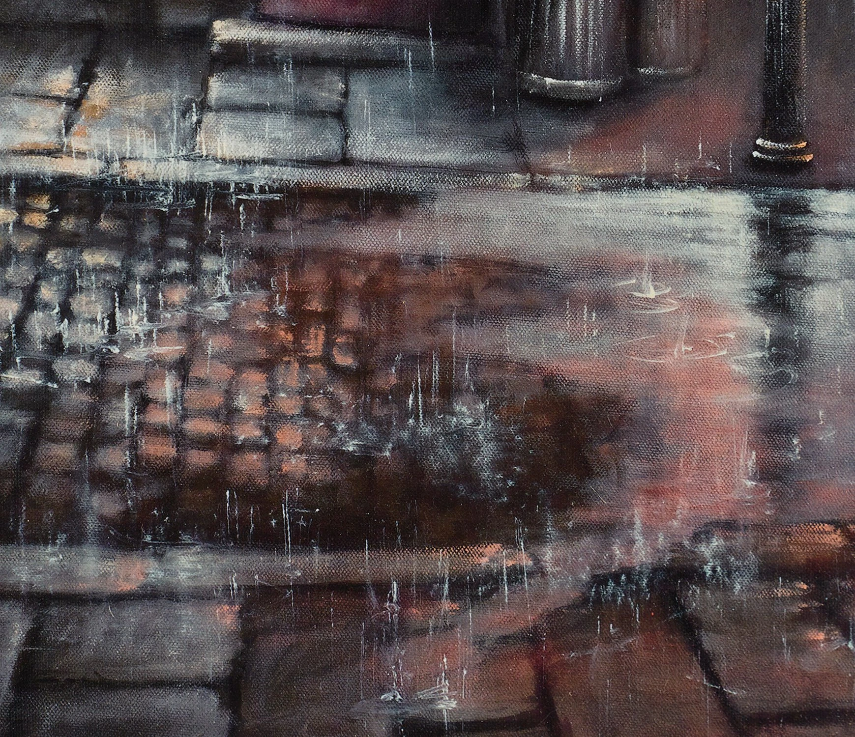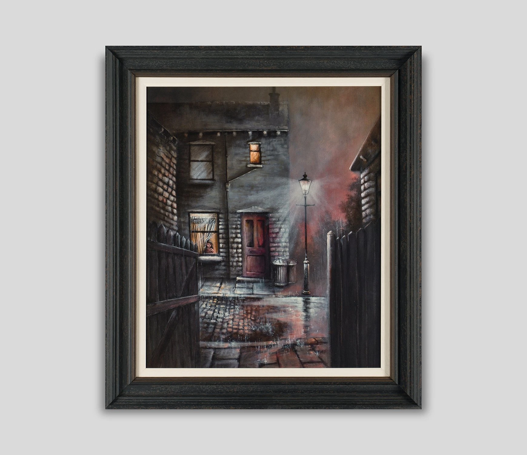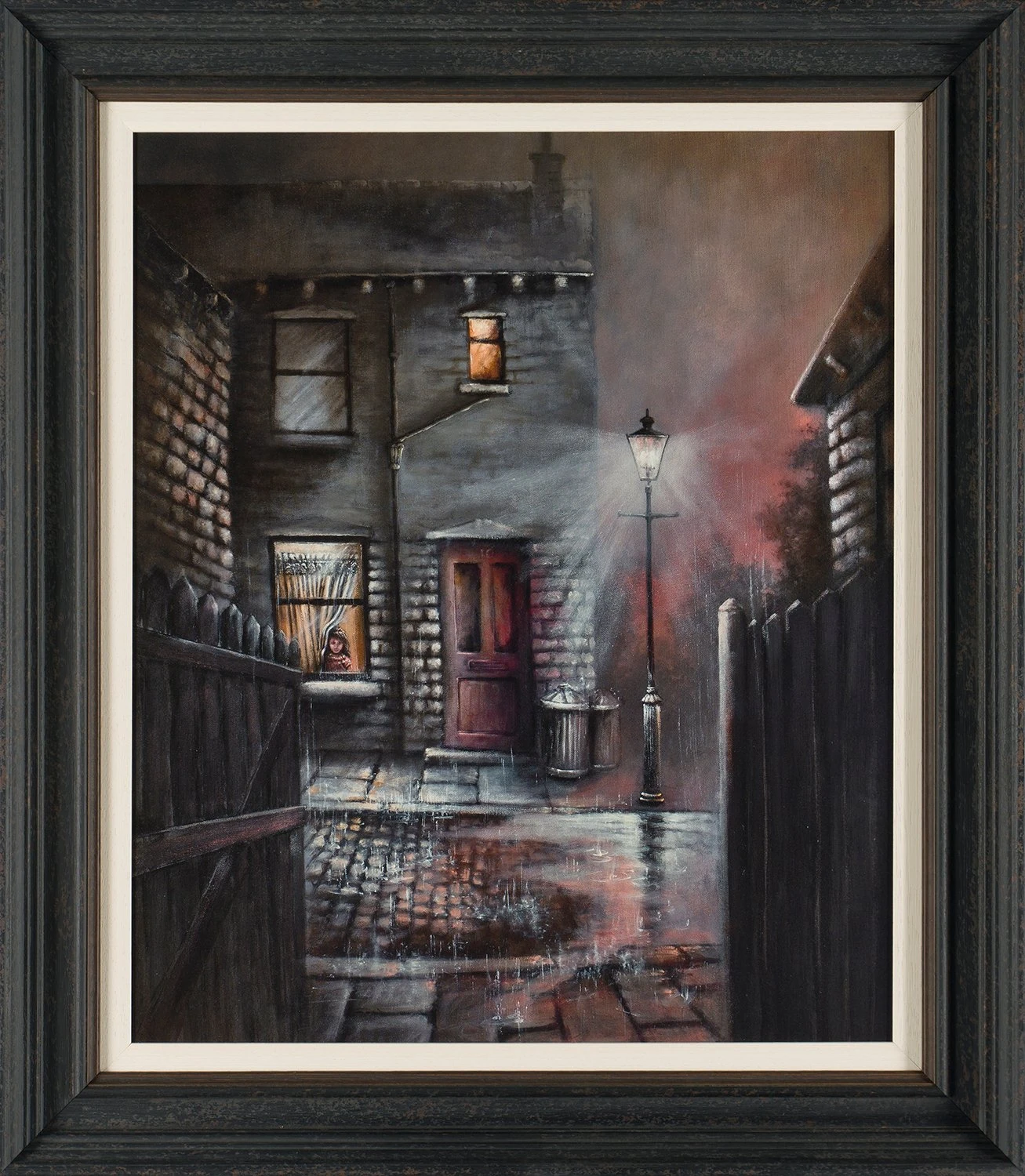 The heart-warming title of this piece stems from a conversation between the artist and his great-granddaughter who remarked that her mother plaited her hair “Every Sometimes Day”. Inspired by the amusing innocence of this statement, Bob created the above artwork that also referenced an older photograph of his daughter looking out the window. The highly effective and beautiful colour palette that mixes black and white with red accents perfectly captures the iconic red brick Victorian and Edwardian terraced houses that line the towns and cities of the UK (particularly in the North). Light rain is captured through delicate strokes, perfectly shown in this hand-varnished giclée canvas on board. Although this artwork is from an intimate family tale, we the viewer get to put our own story to the little girl thinking ‘Every Sometimes Day’.