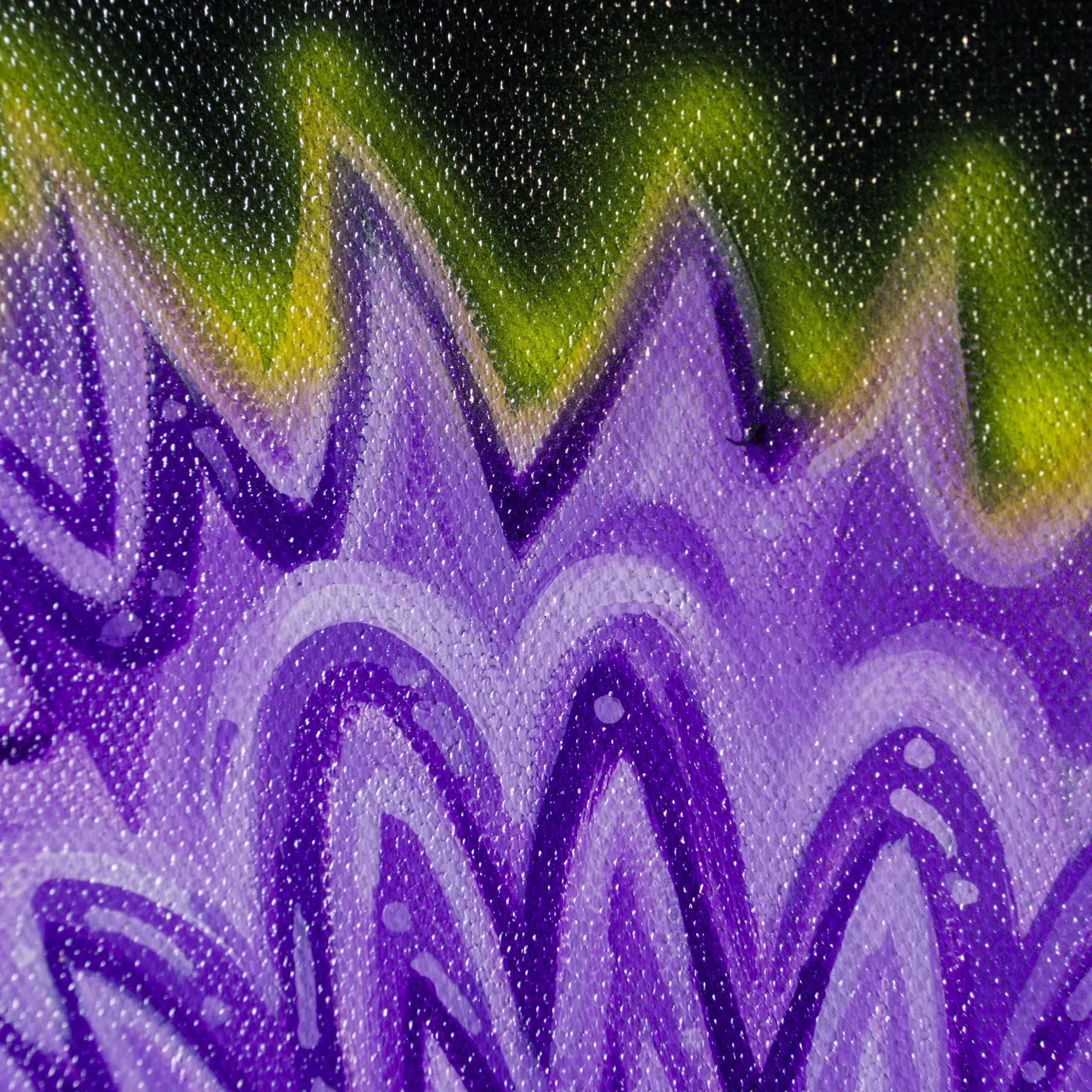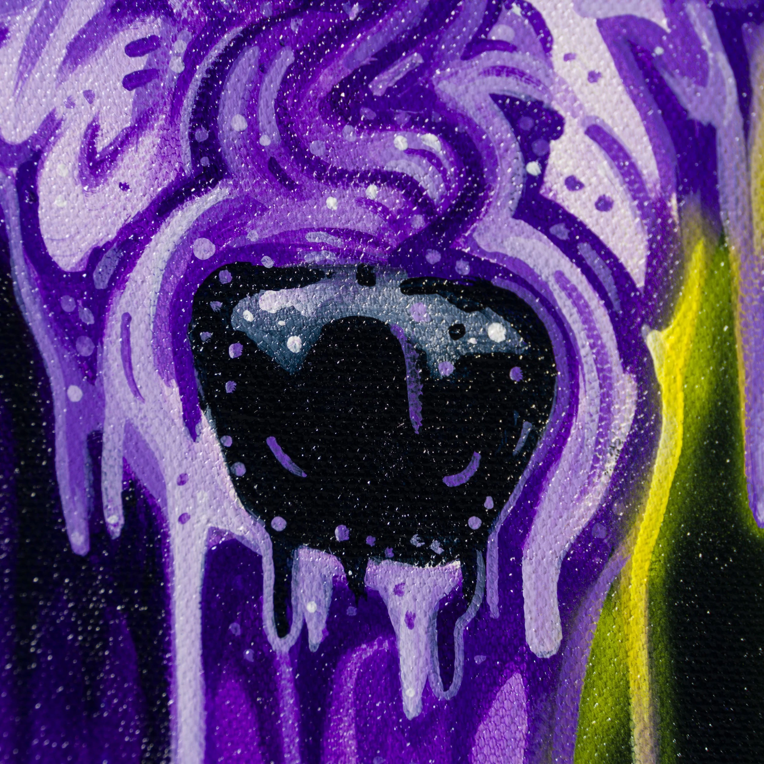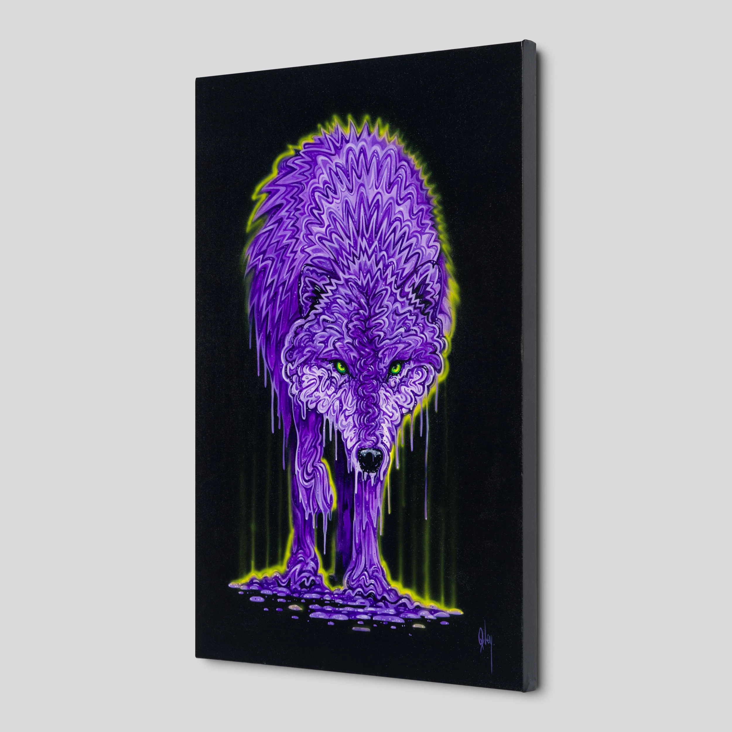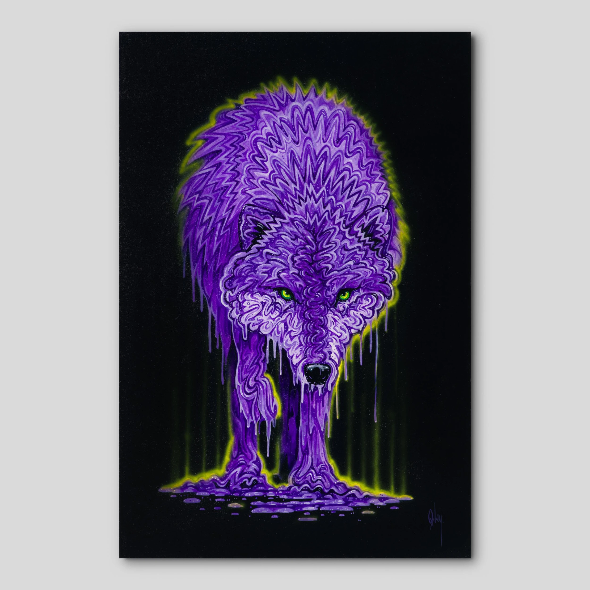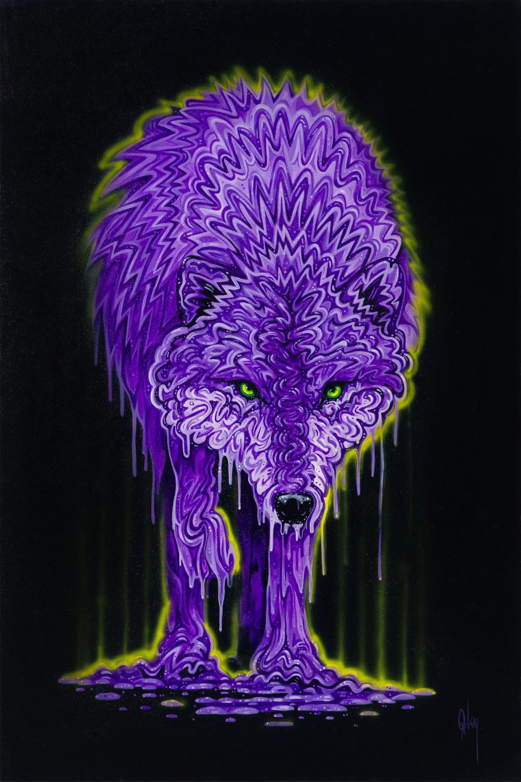 The traditional colours of a wolf are overthrown by exciting shades of purple, transforming the animal into an “ethereal, astral” being through his kaleidoscopic use of colour and form. The strong shades of purple contrast beautifully with the green highlighted by the black background.