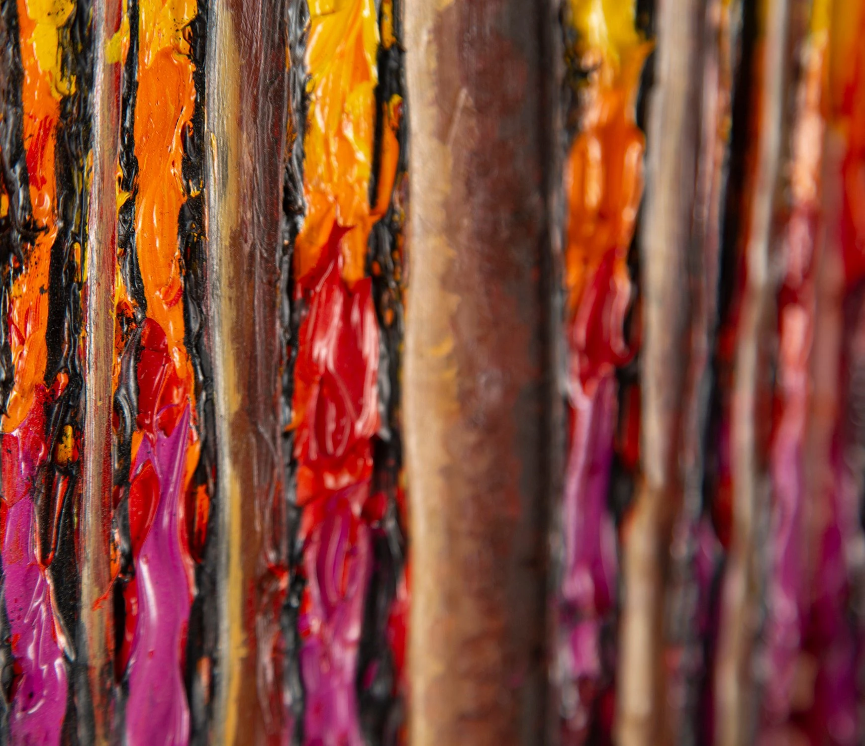 Scarlett’s incredible process also lends itself to impasto painting, invented in the 17th century by Baroque painters and later mastered by artists like Vincent Van Gogh. More recently, Scarlett has coined her own unique style where she combines the impressionistic landscapes of history with the bold black outlines of pop artists like Andy Warhol and Roy Lichenstein. The result is an expressive landscape filled dramatic emotion and movement as can be seen in this beautiful original artwork.