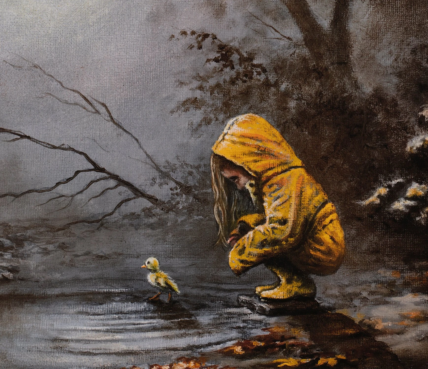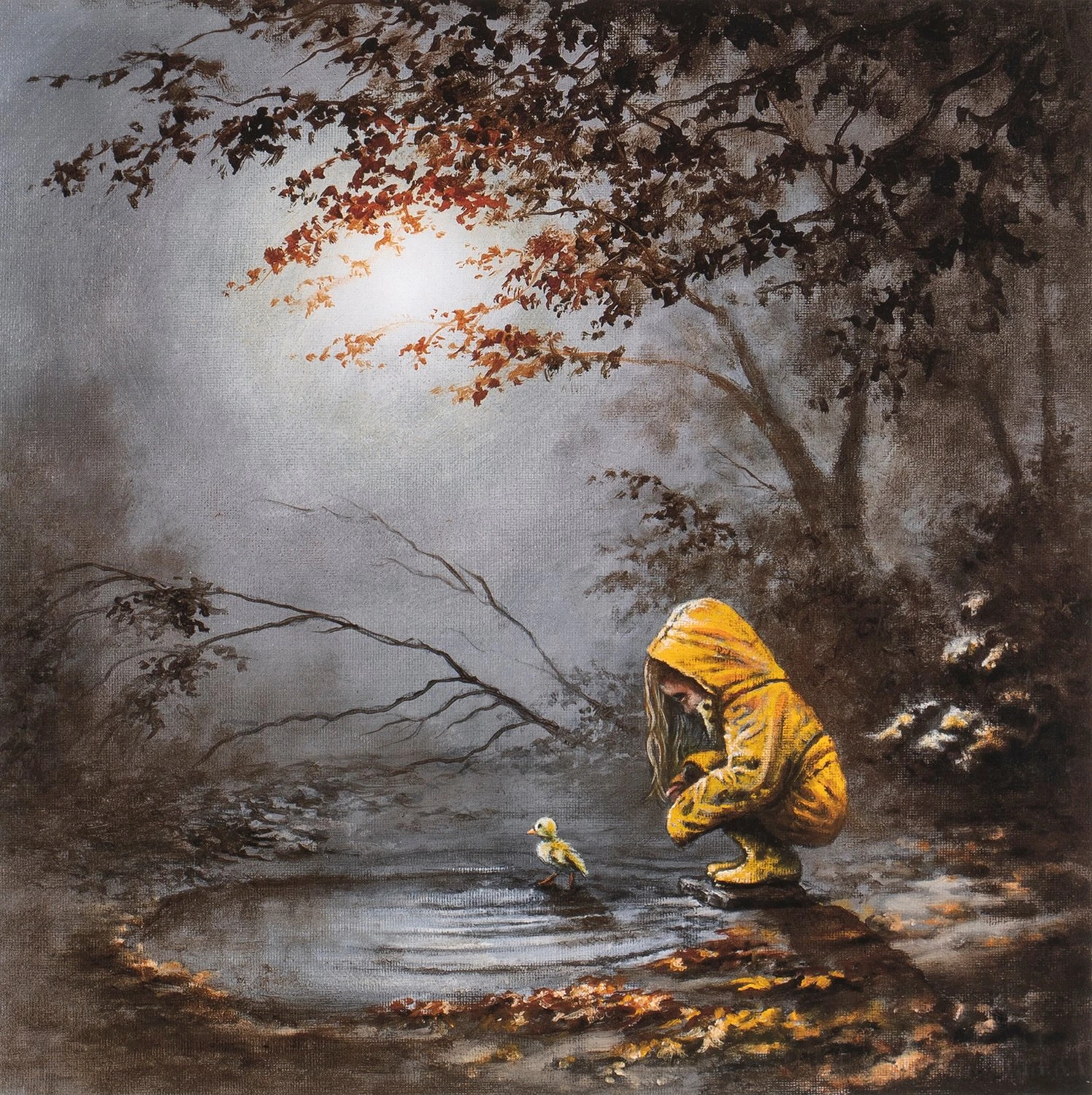 The heartening artwork is a homage to two of the artist’s most loved and recognisable paintings; and . Here, the little girl has grown a little older as has the duck. The title of the piece comes from a family saying ‘welly bob day’, used on a day when it is raining but the children still want to play outside. The bright yellow of the coat and duck continue to perfectly contrast the monochromatic setting which, this time, is an elegant yet industrial cobbled street.