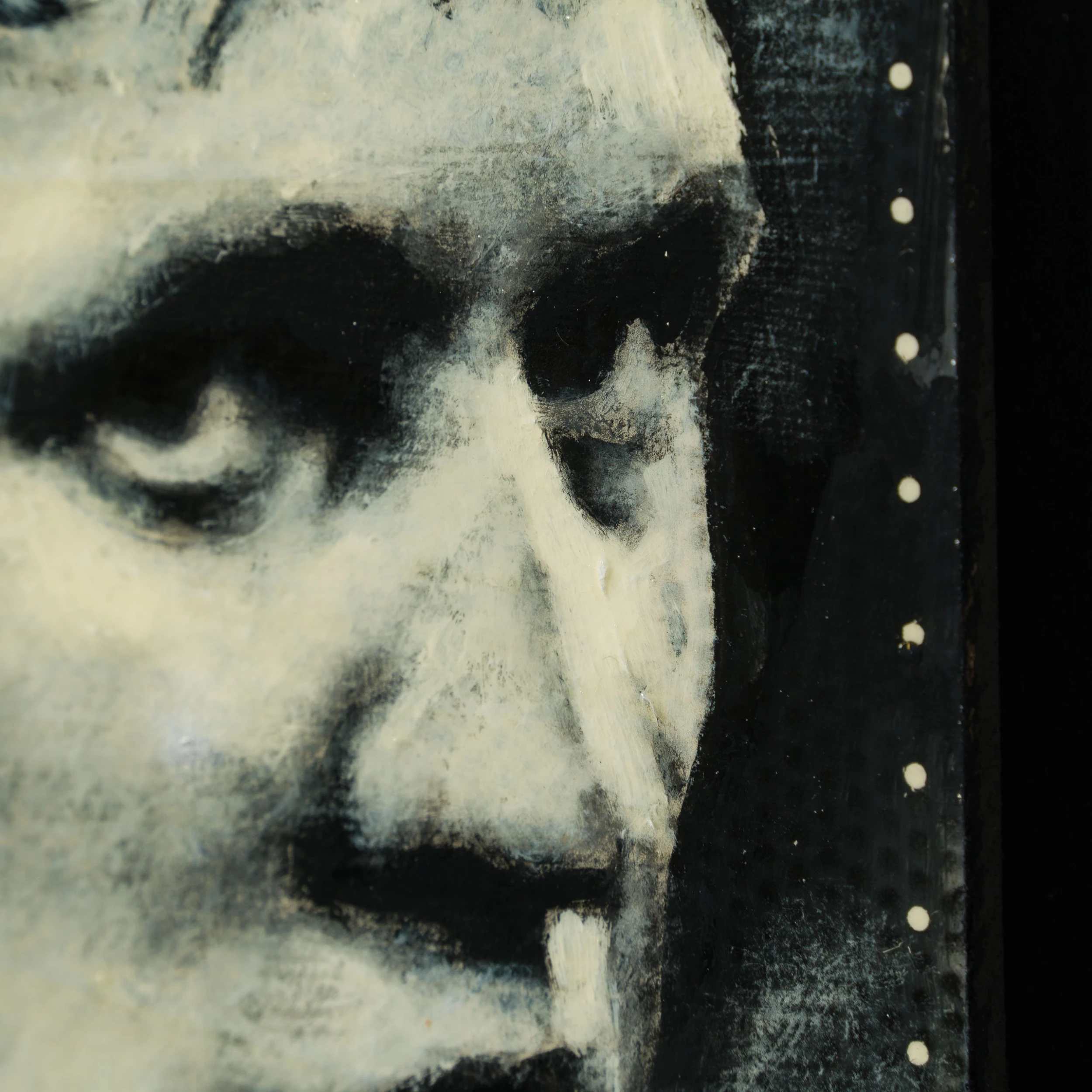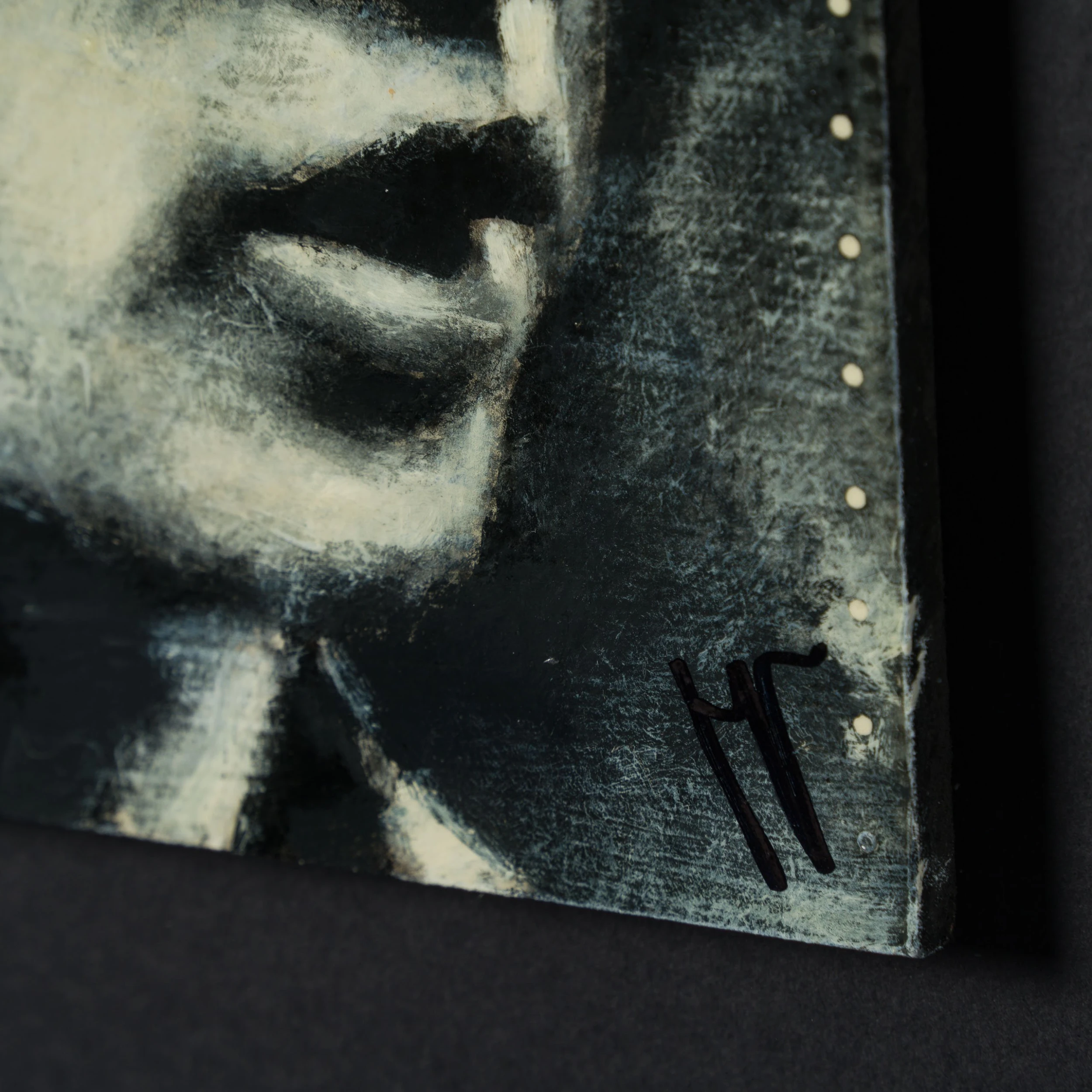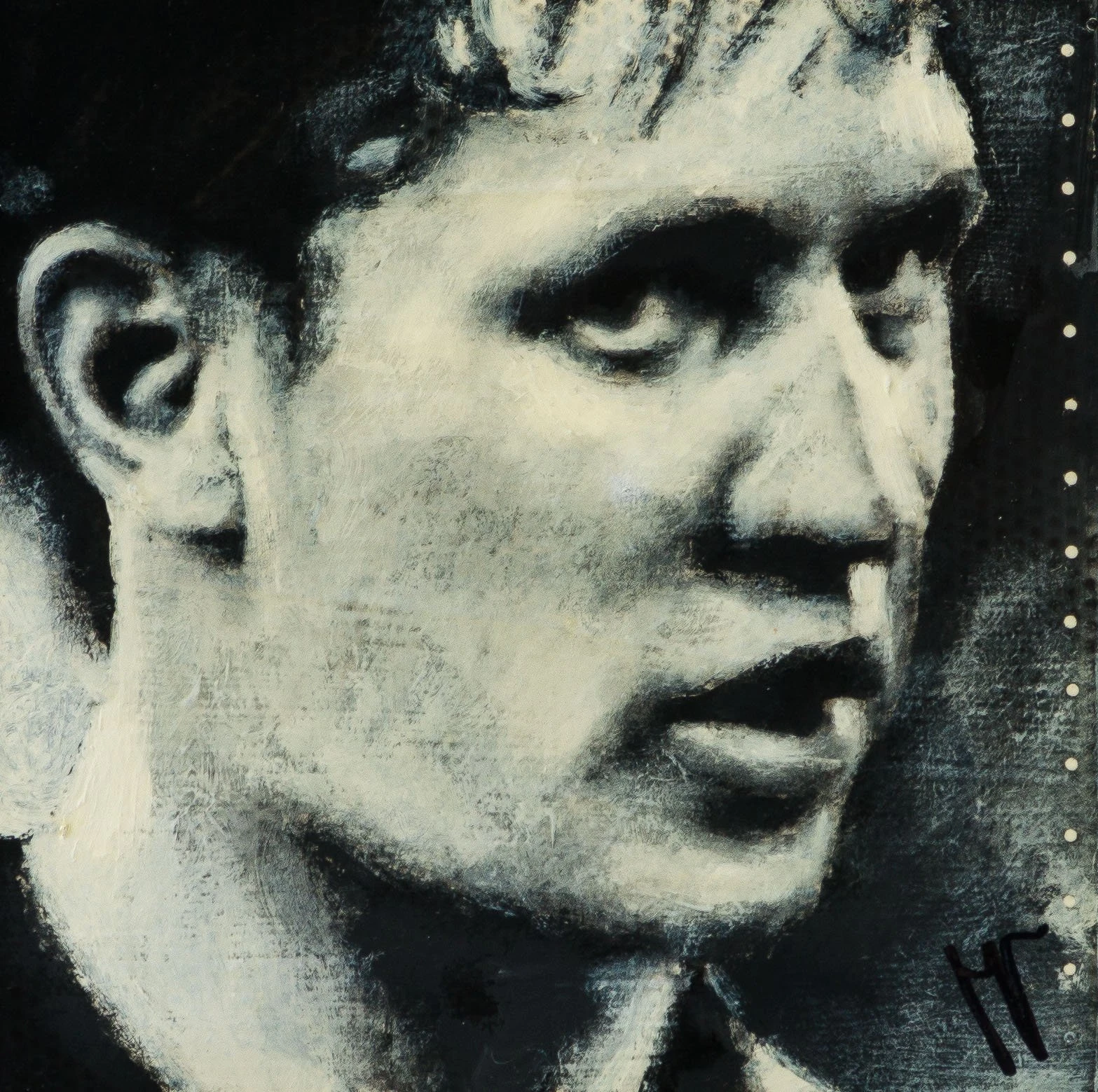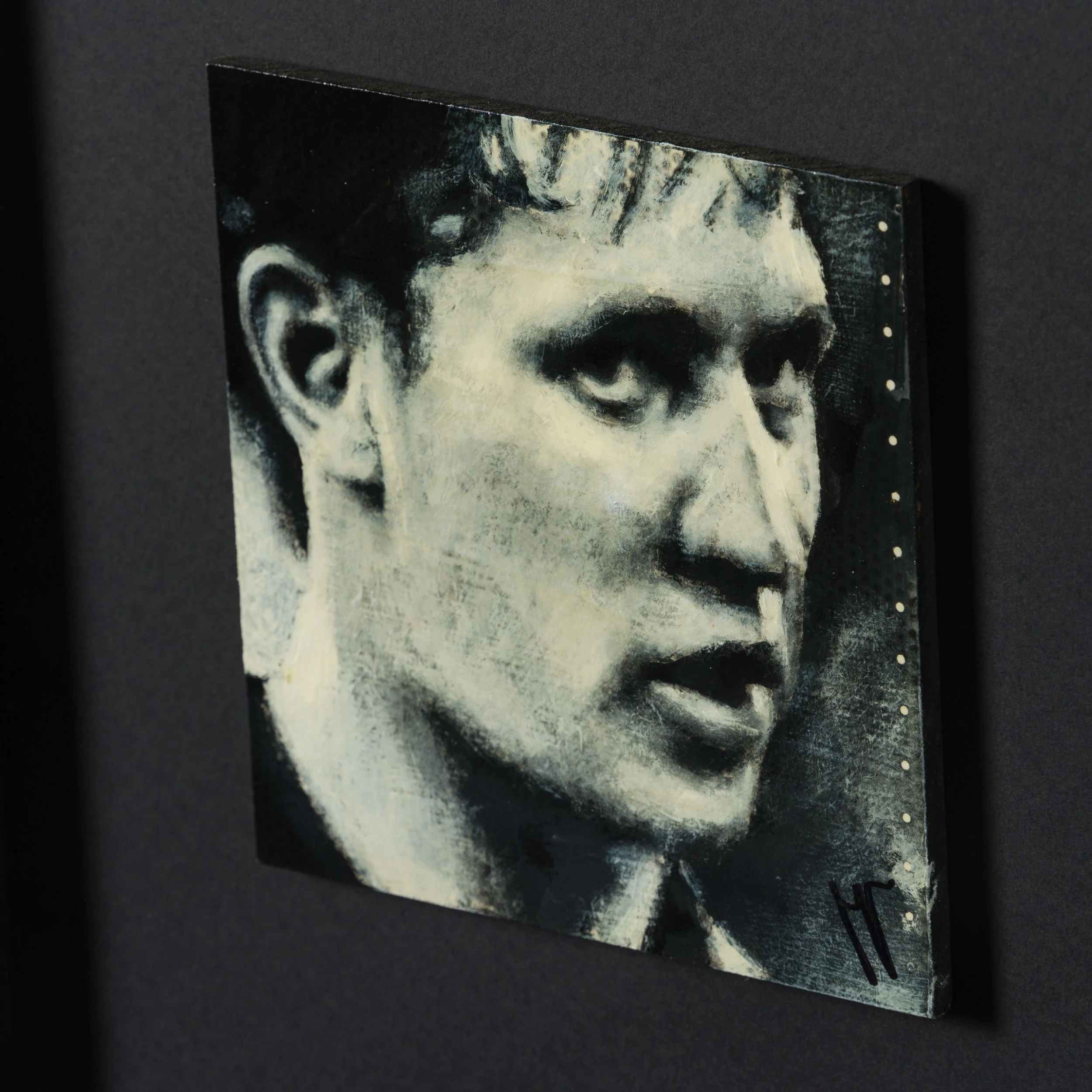 Using conflicting tones of cream white, black and grey to create a highly atmospheric figurative artwork with an essence of realism capturing a monochrome scene. The deep swathes of black paint are skilfully blended and contrasted with white accents to create detailed and moving masterpieces. Working in an expressionist style, Jon creates representational artworks using mark making, a technique the artist has mastered throughout his career “The instant grab of attention and the ability to convey emotions so simplistically is not lost on me. Nevertheless, I want my work to be more than just a quick line drawing. These are personal paintings which if anything, I paint to make me smile, all the people portrayed have inspired, provoked, and interested me throughout my life.”