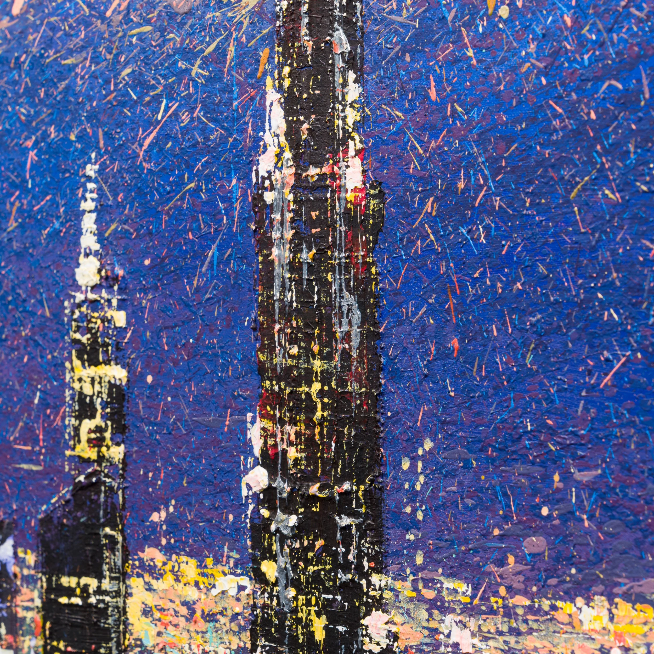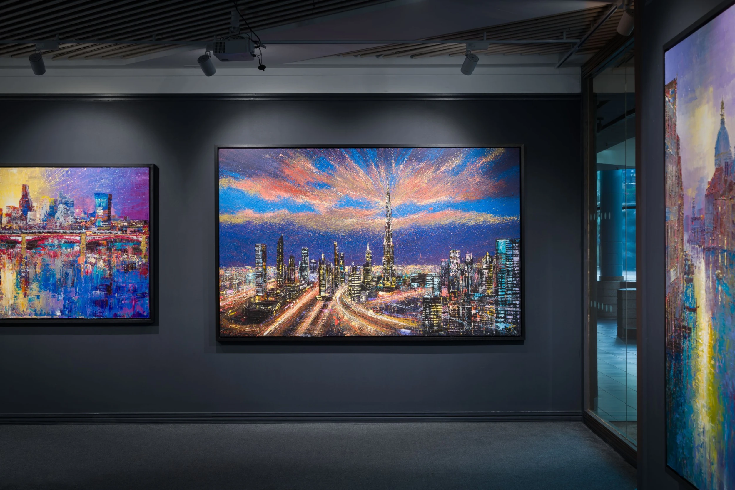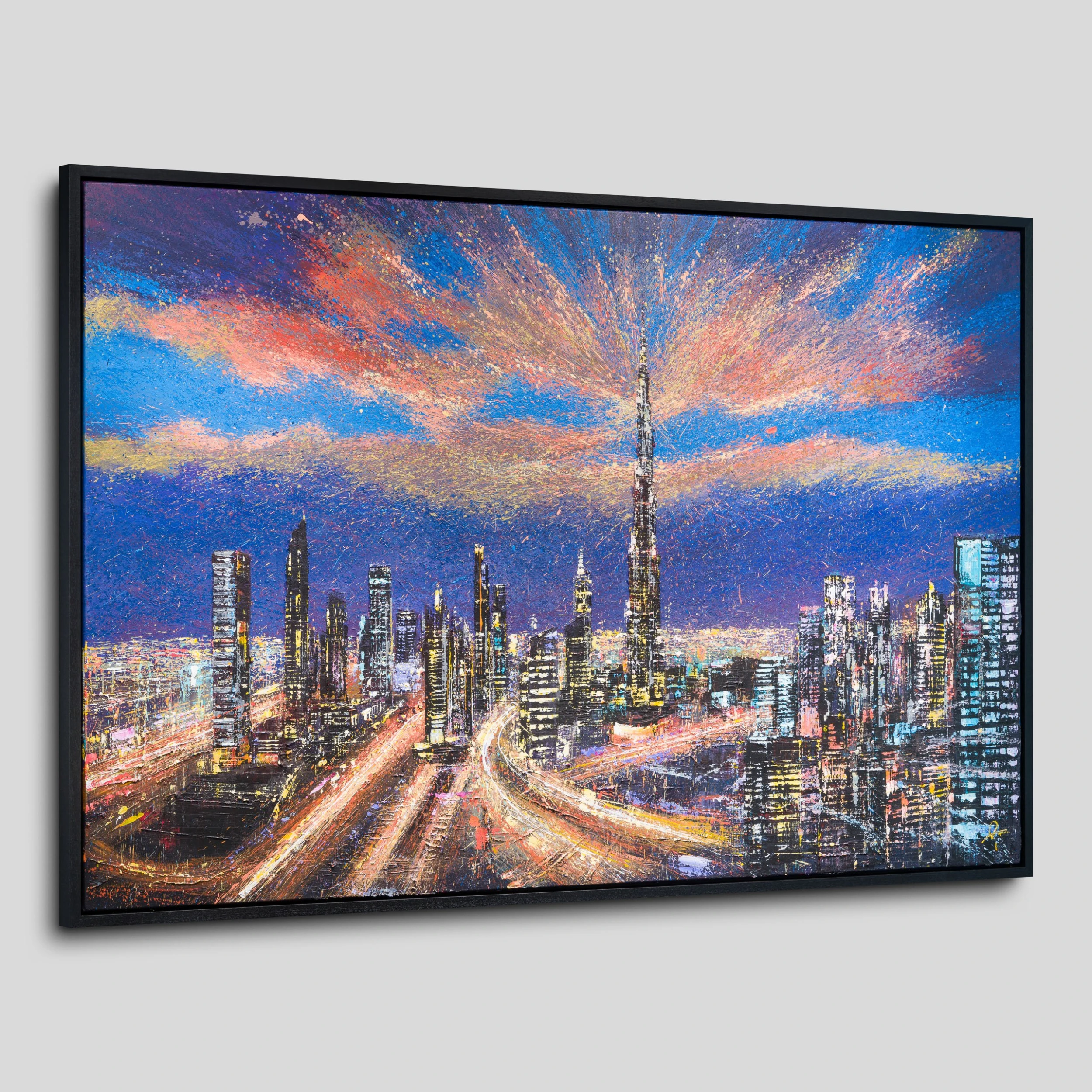 Much like the unpredictability of big cities, creates his monumental artworks with a spontaneous energy and fluidity that allows him to mimic their primal beauty. Rather than a still moment in time, Kenton tries to capture a sequence of movements in his cityscapes. Inspired to capture the awe of Dubai at sunset, Kenton created this mesmerising bright piece.