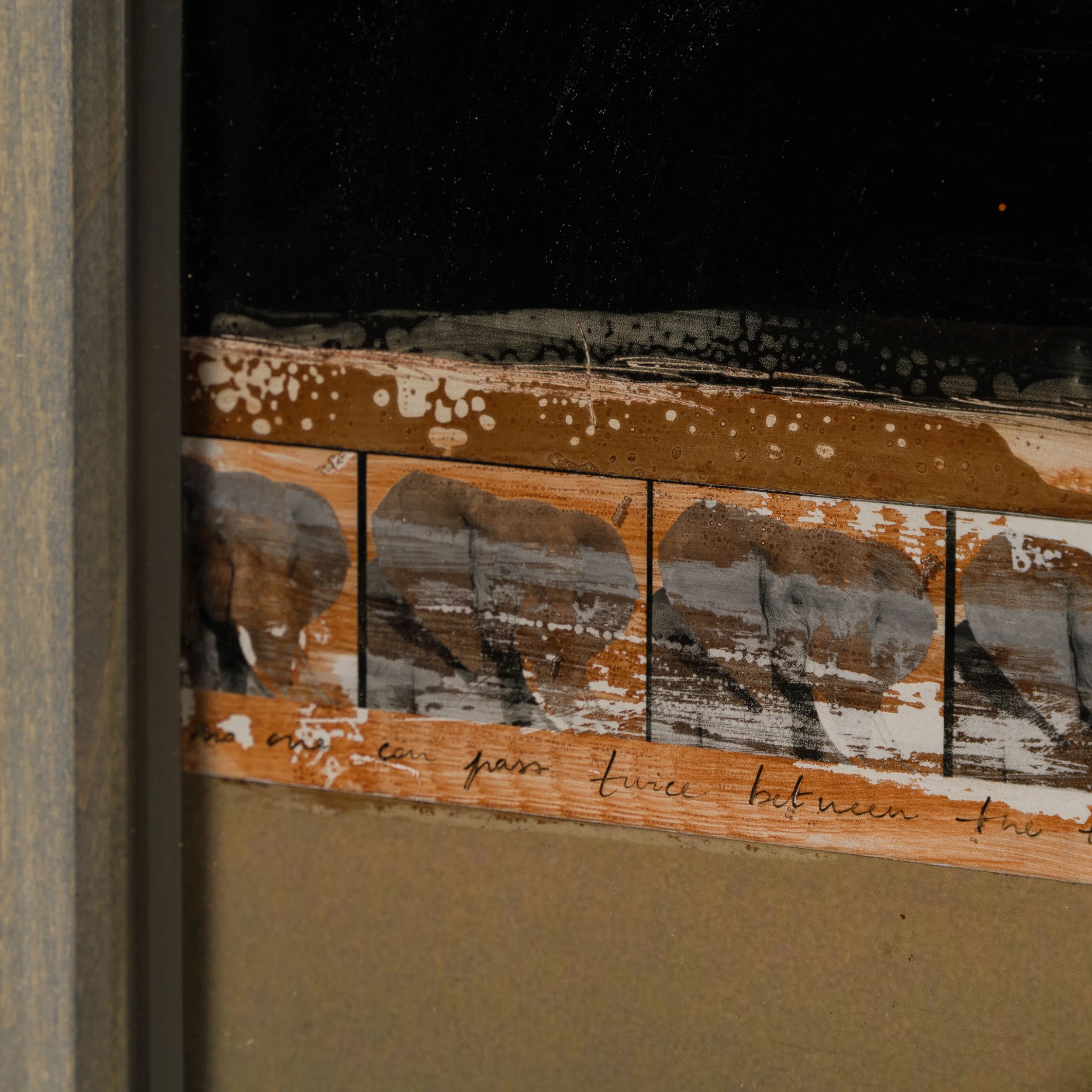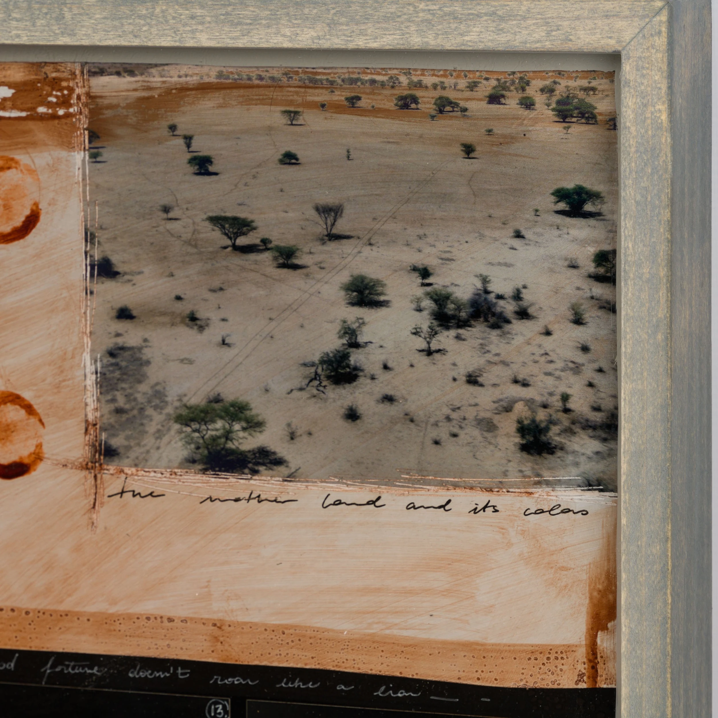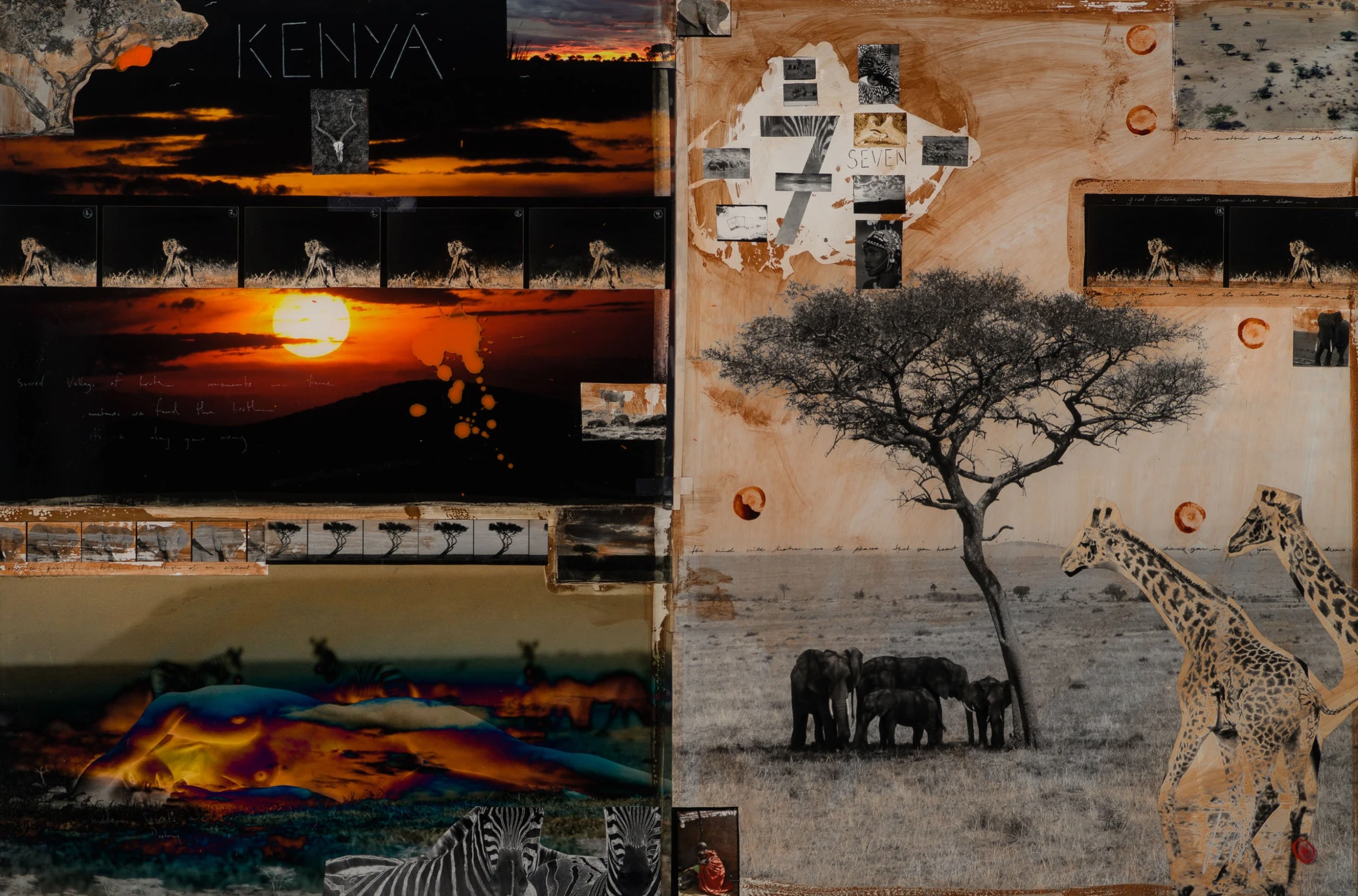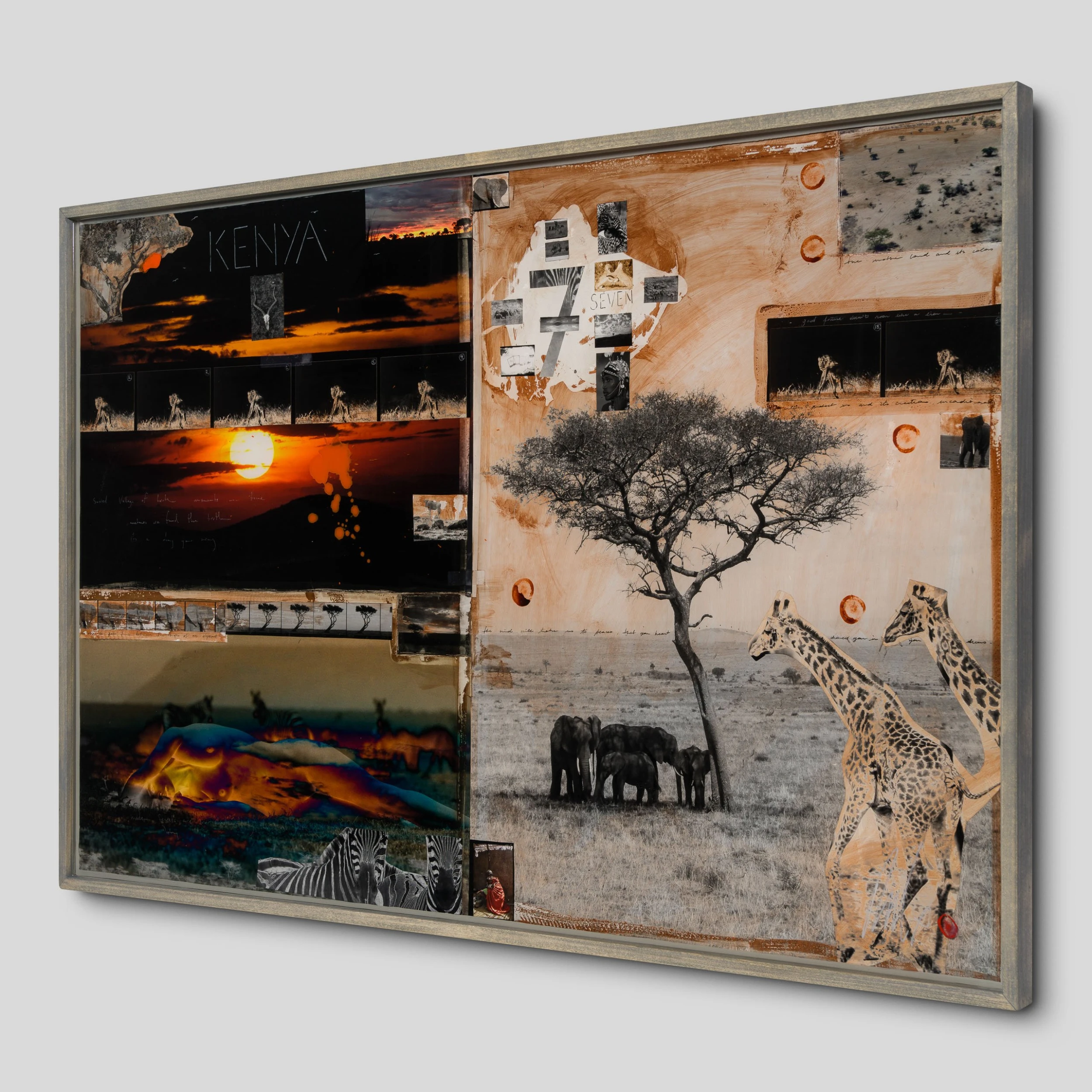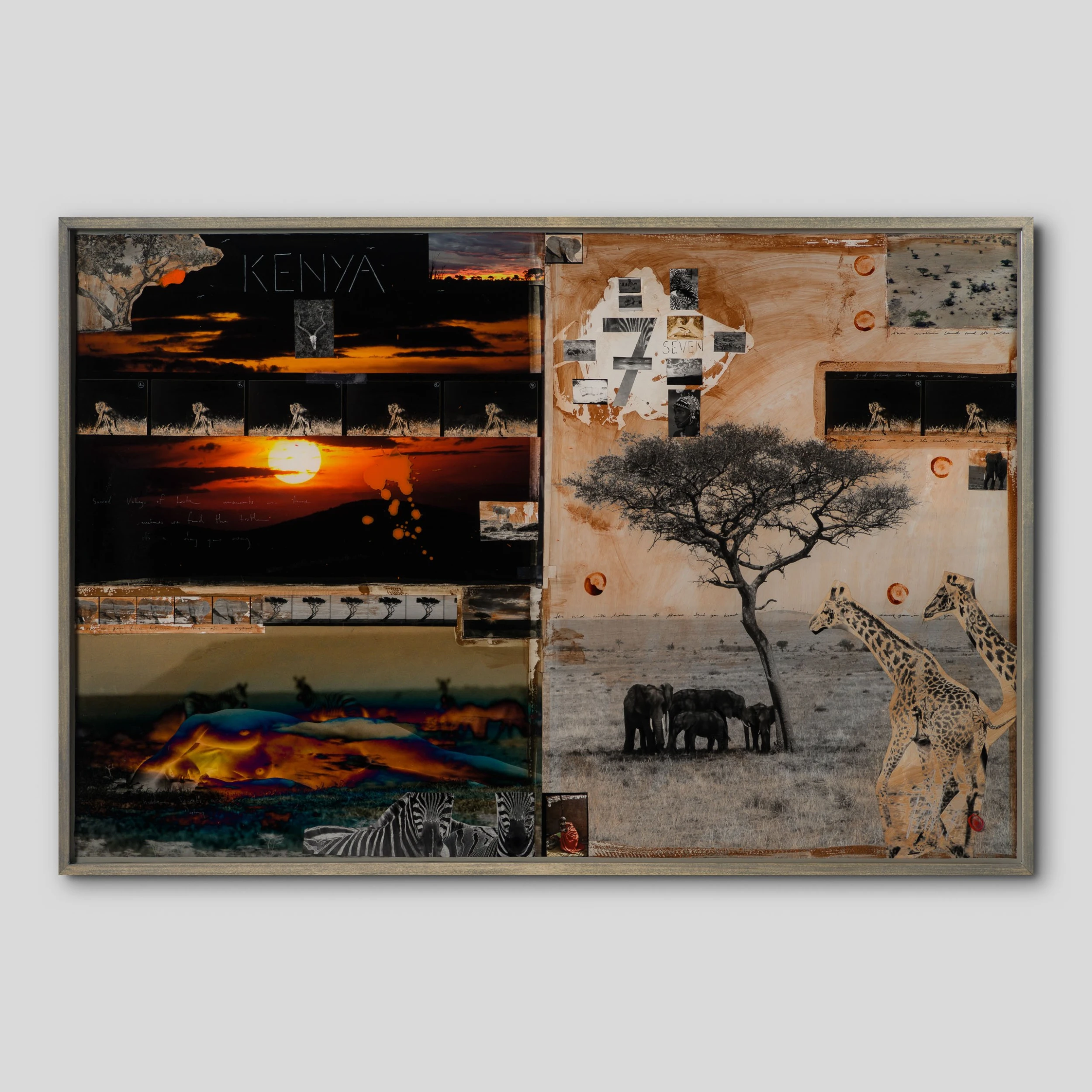 With Moroccan pigments and Vietnamese paints, Mazzucco’s pieces are characterised by the juxtaposition between wildlife and cultural photography, this incredible piece forms part of his introspective collection Grass Roots 2023. The piece tells a story in layers. The overlaying of photography, paint, and resin adds life into the composition, creating a statement original. The beautiful earth tones of the composition create the spontaneous dynamic that this wildlife piece represents. The use of different images sizes create the intrinsic depth, characteristic of Mazzucco’s originals.