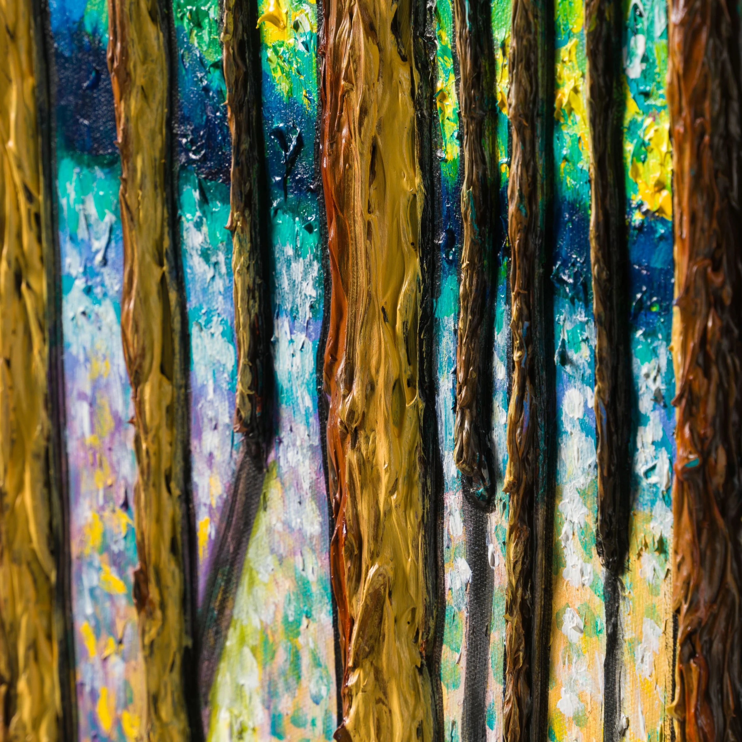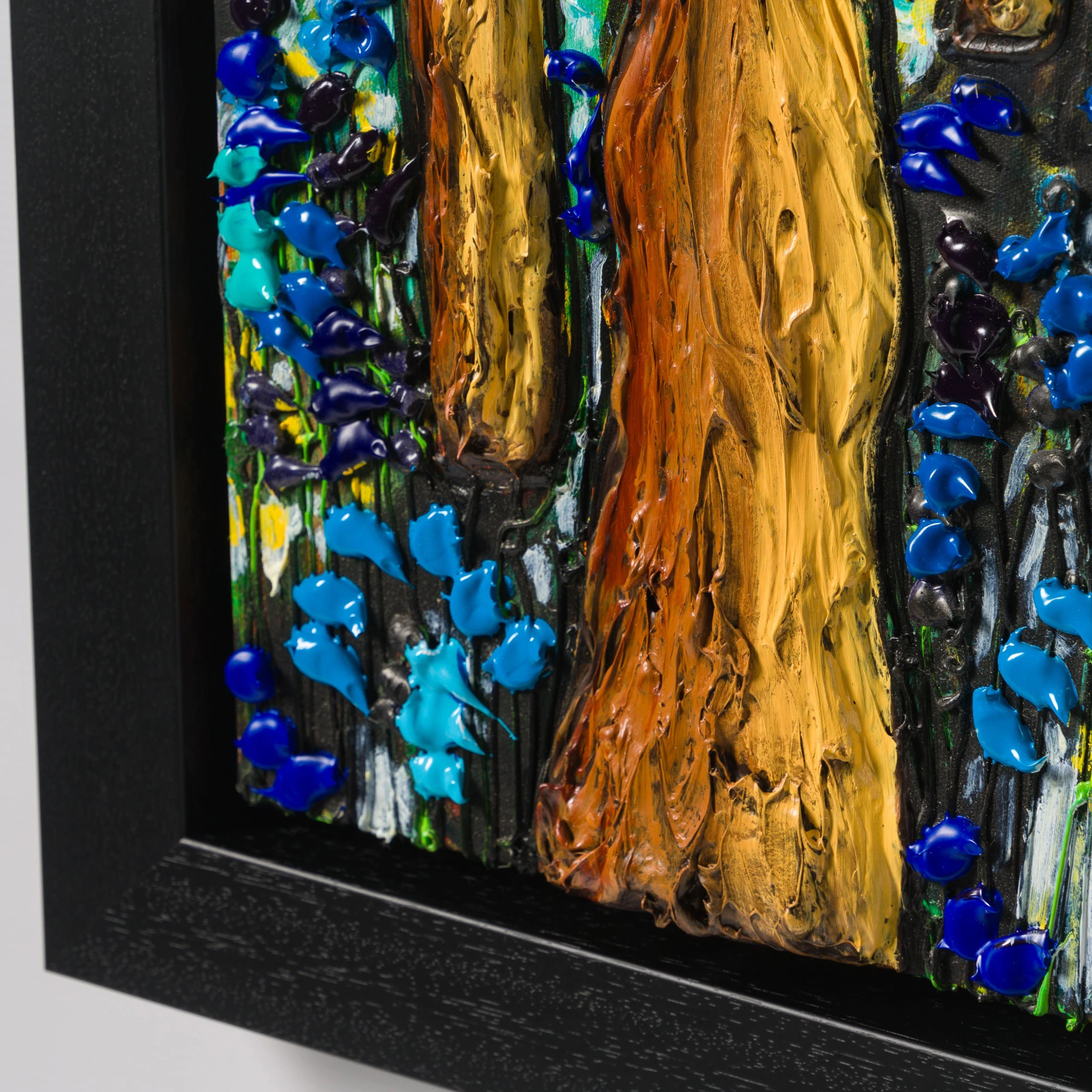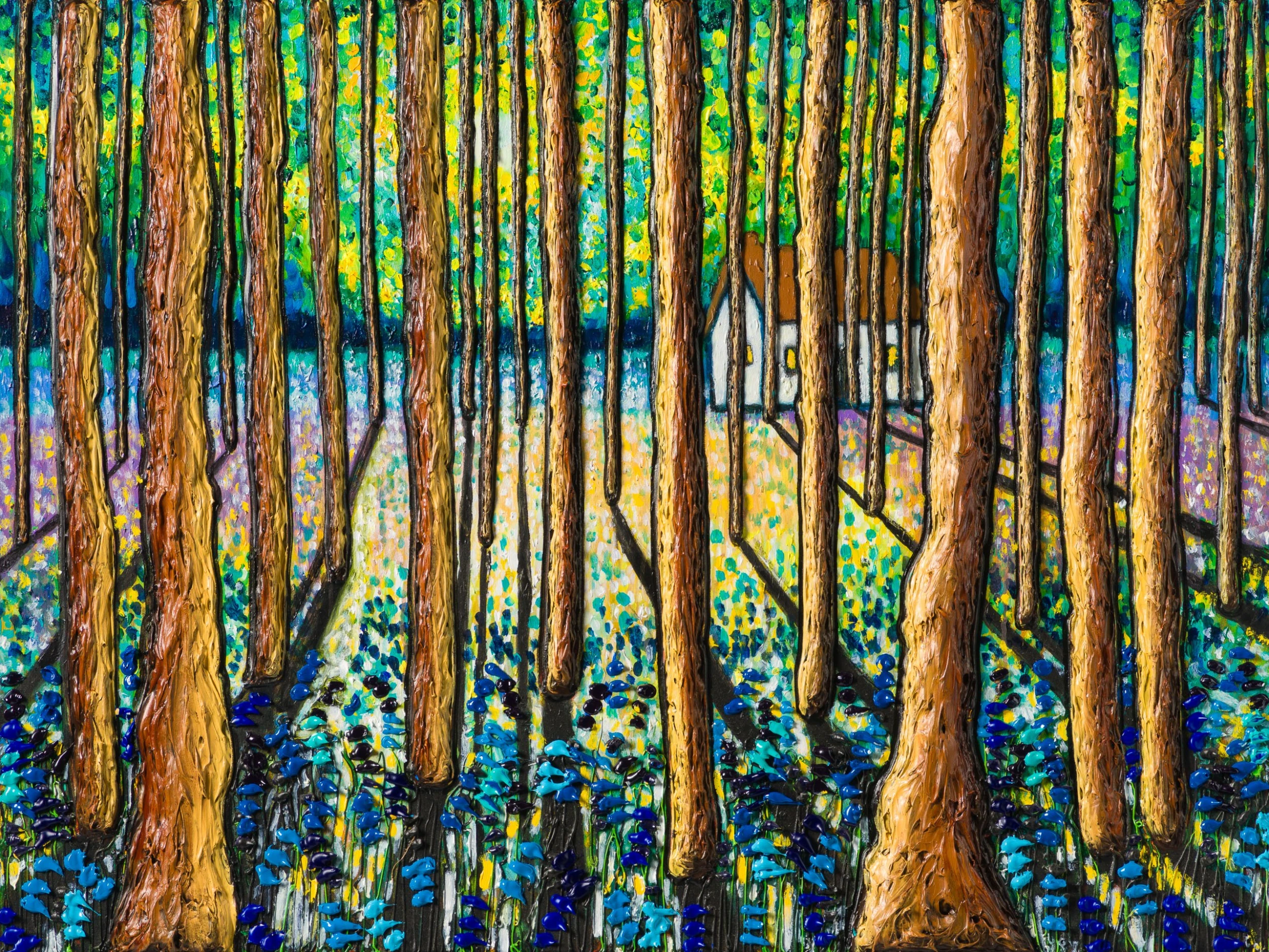 In “House Behind The Forest”, the artist depicts the countryside with beautiful depth. In-between tree branches, Raven adds a white cottage, an element featured in multiple paintings. The artist’s unique portrayal of the sky in circular textured brush strokes adds a beautiful depth to the piece. Similar to Van Gogh’s skies, Raven’s skies are fluid expressing the emotion behind the swirls.