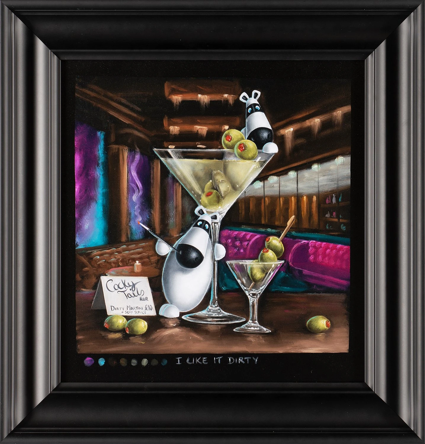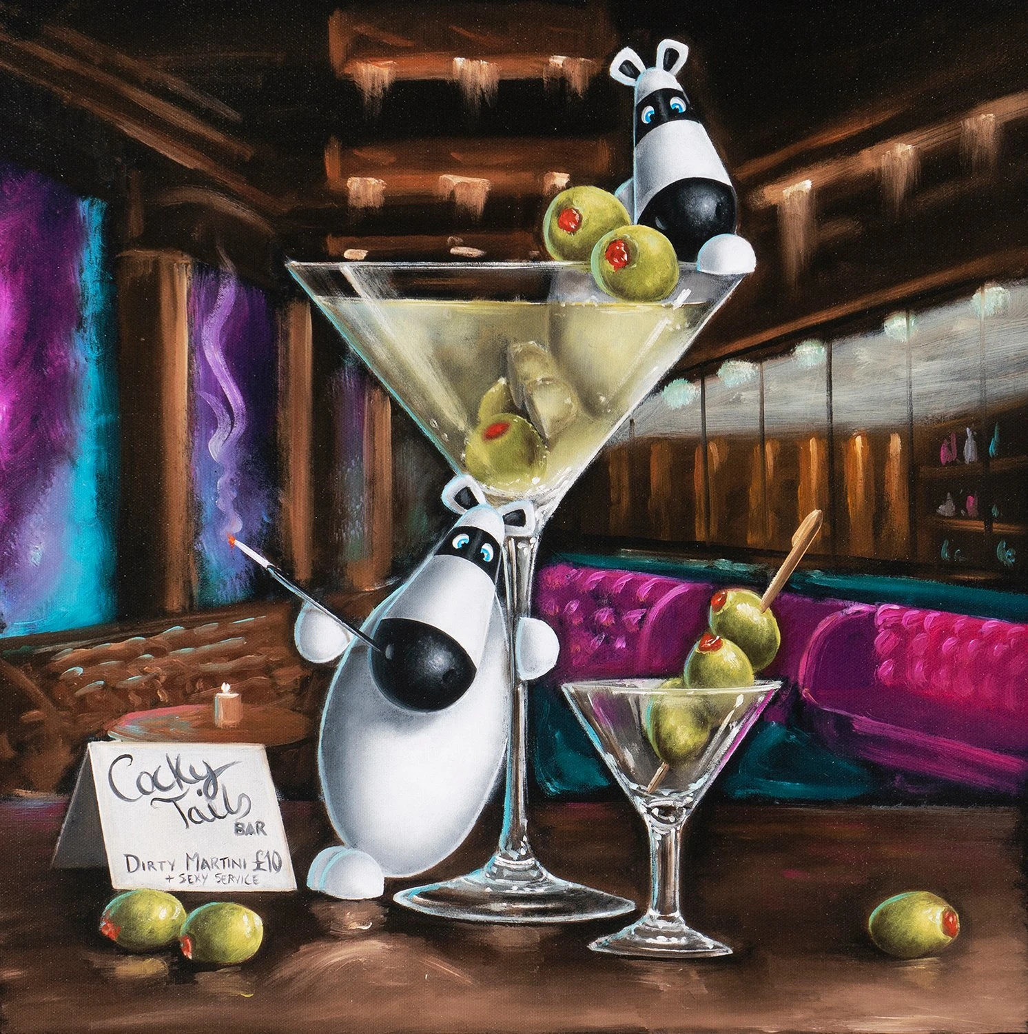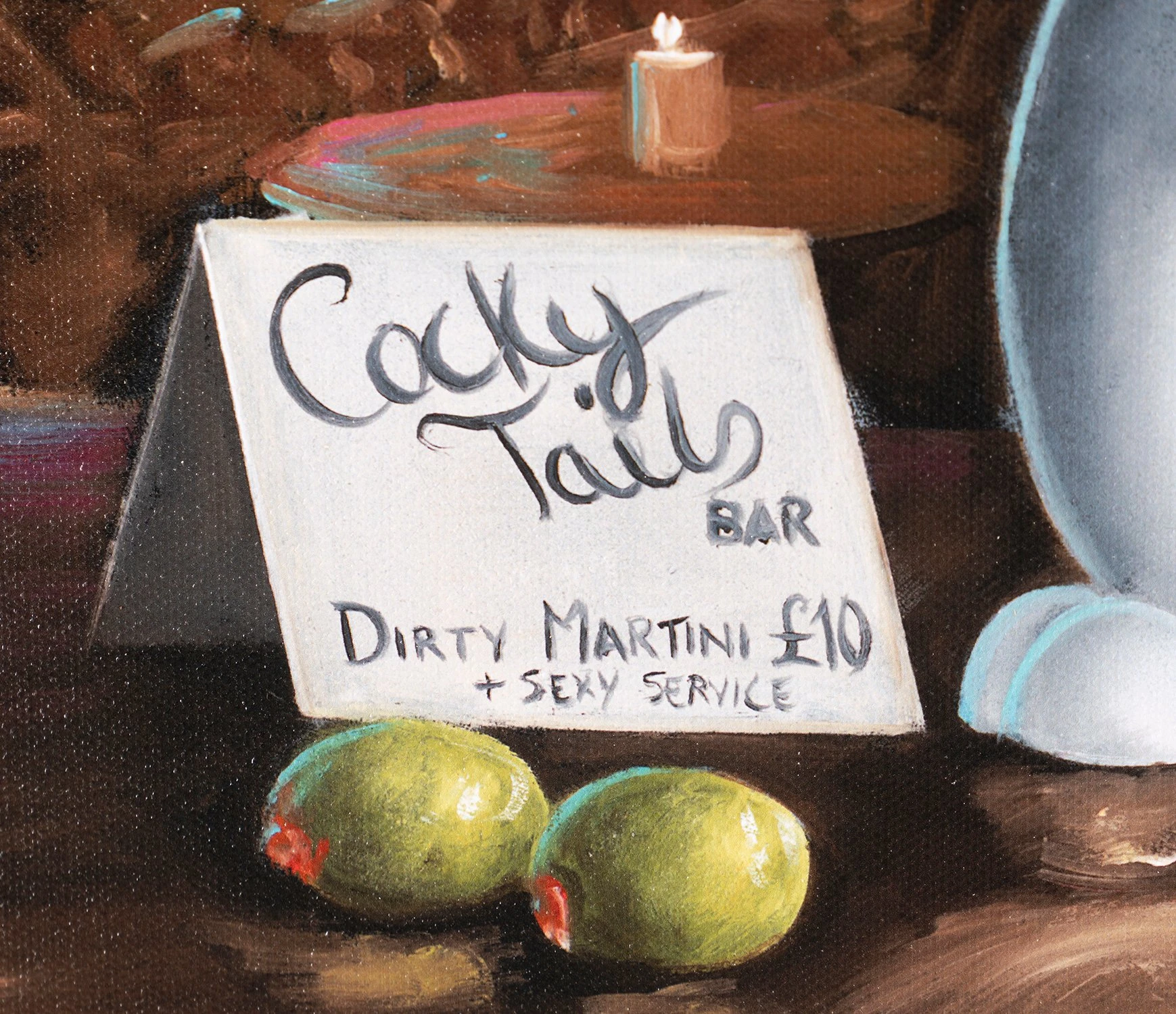Bright and vivid colours pop out of a dark yet detailed background in this hilarious limited edition artwork by Peter and Jayne Smith. Part of their 2022 collection Ticklish Allsorts, here the artists playfully mix provocative themes with imagery of delectable delights and crafty cocktails to create a beautifully bonkers masterpiece.