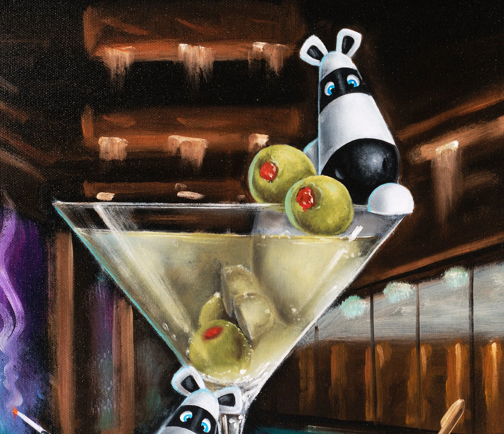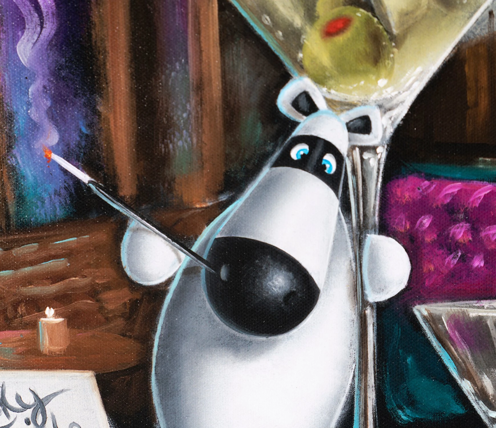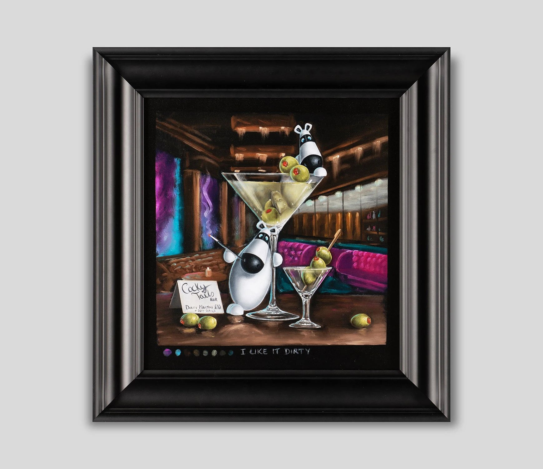 Bright and vivid colours pop out of a dark yet detailed background in this hilarious limited edition artwork by Peter and Jayne Smith. Part of their 2022 collection Ticklish Allsorts, here the artists playfully mix provocative themes with imagery of delectable delights and crafty cocktails to create a beautifully bonkers masterpiece.