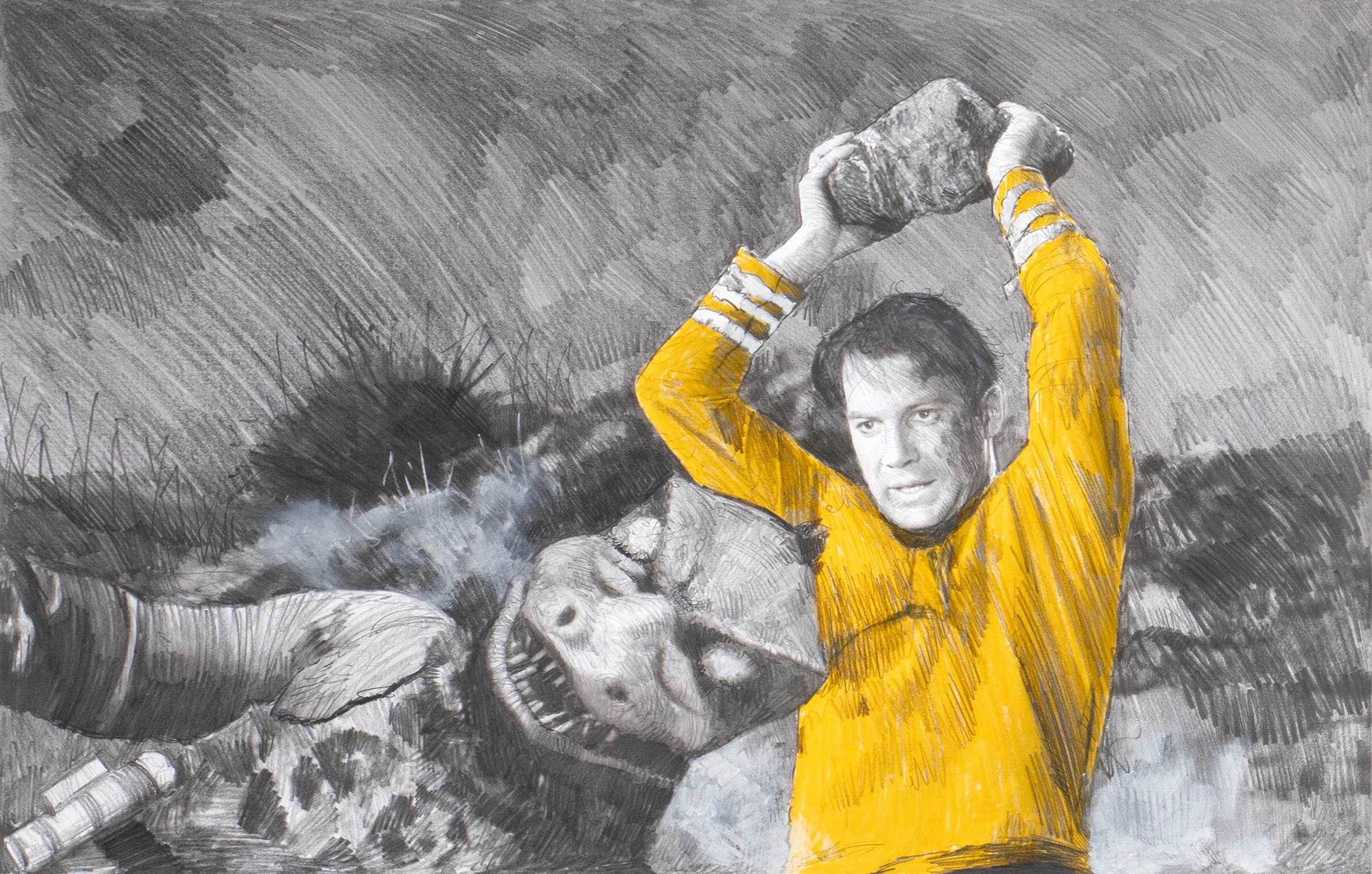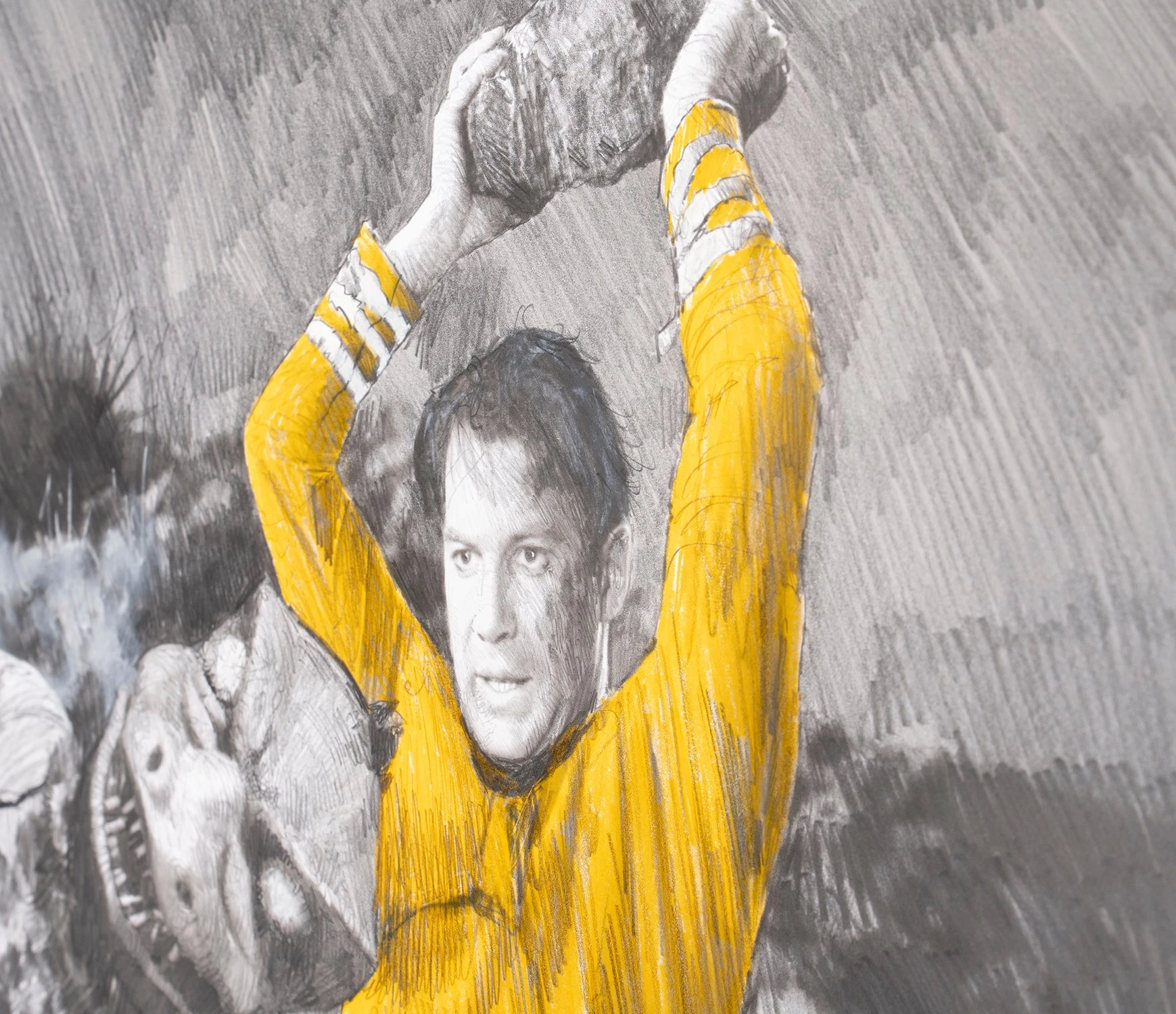 With bright pops of yellow accentuating the different tones of delicate graphite, this otherworldly original drawing by Robert Bailey perfectly captures the iconic characters and retro quality ofย Star Trek: The Original Series.