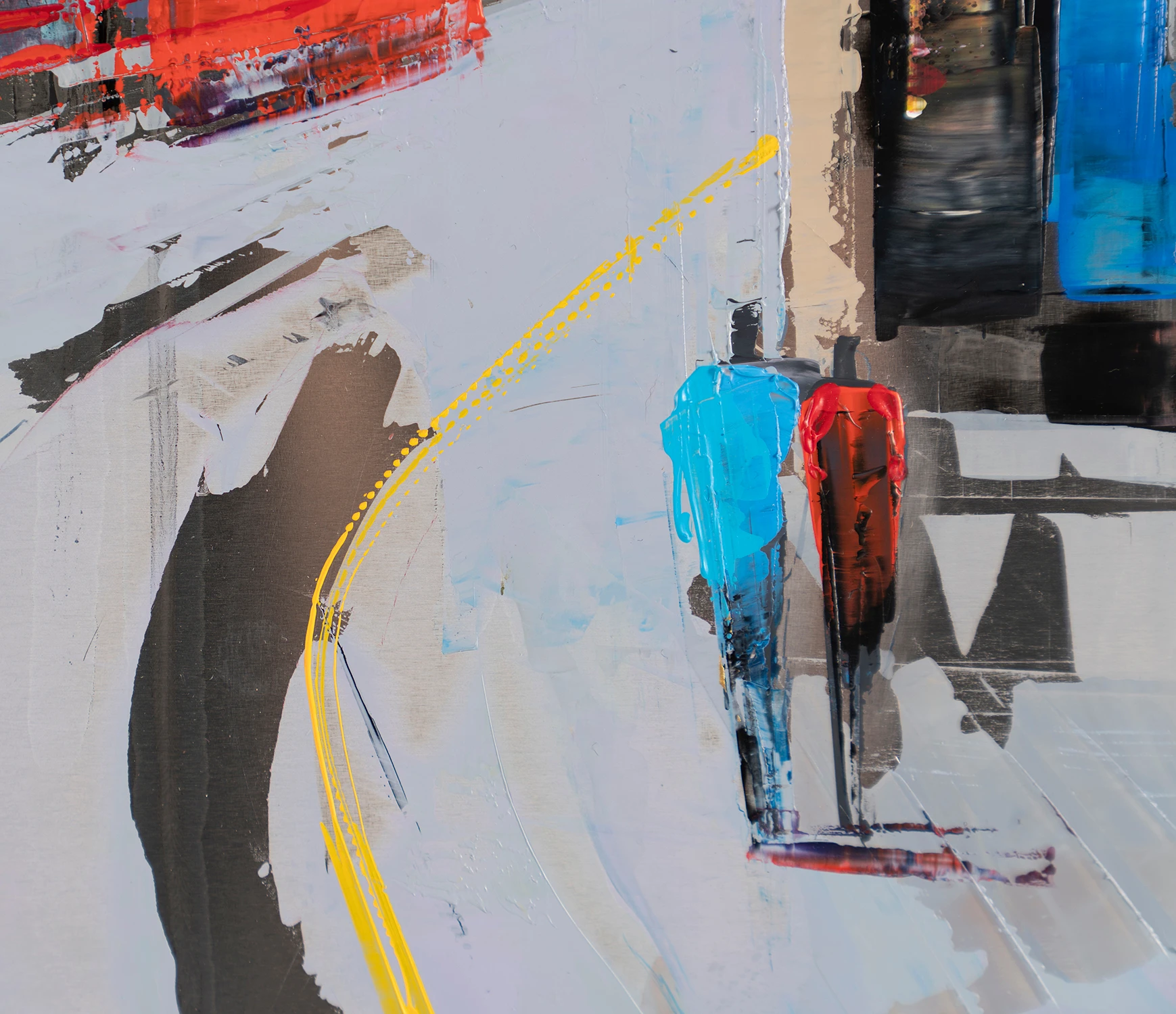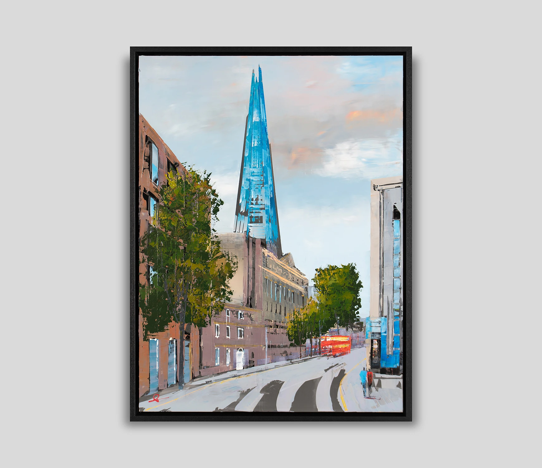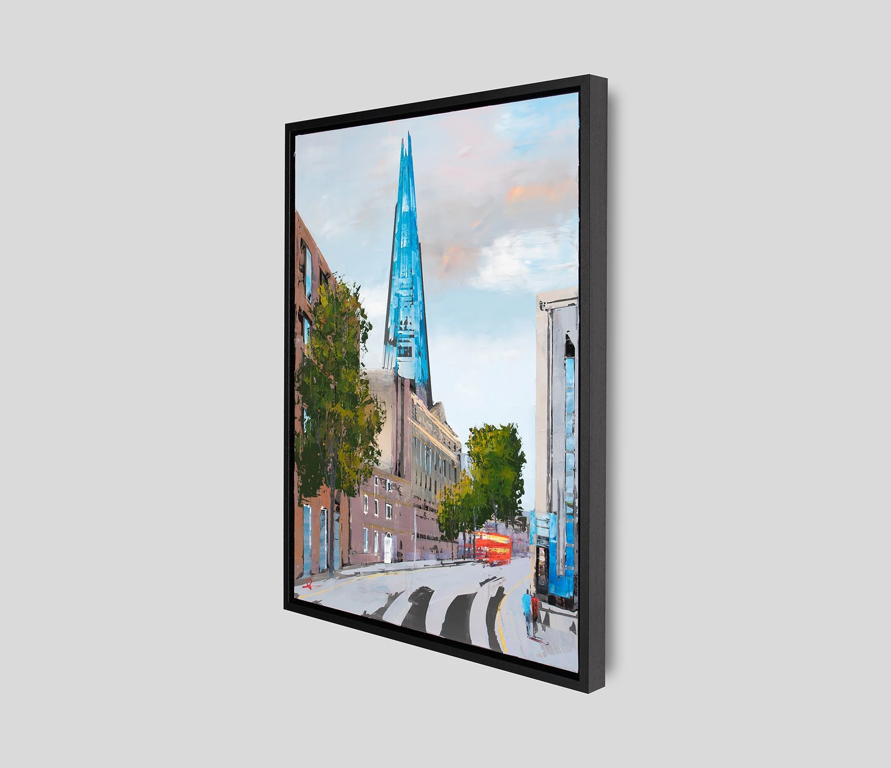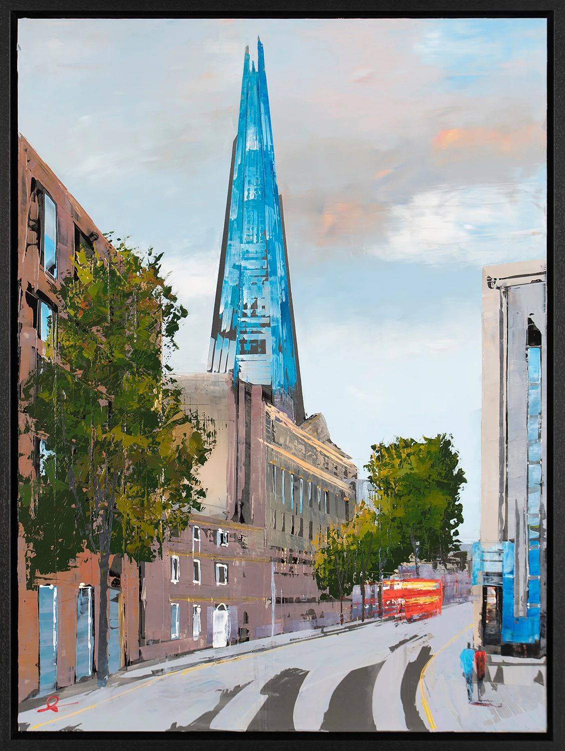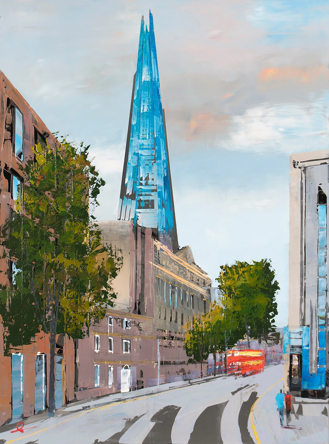 The genre of cityscapes in fine art was made famous by impressionist artists like Claude Monet and Camille Pissarro, although the genre can be traced back as early as the Middle Ages. Paul Kenton brings this genre into contemporary art through unconventional canvases, brushstrokes, tools and perspectives. The reflective metal in this artwork, for example, brings the industrial materials in London’s iconic buildings to life and creates a truly unique textured original artwork.