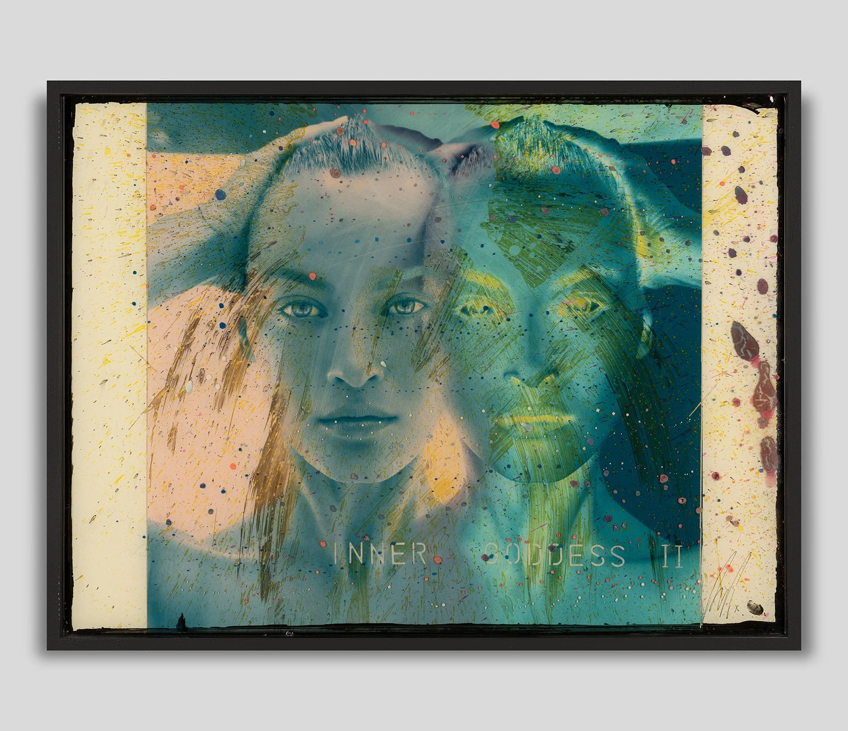 Here, an otherworldly portrait of a woman has been split and interlaced with powdered pigment and paint sealed behind a veil of glossy resin. Framed in rustic wood, this stunning original artwork from the valleys of Canada would beautifully accentuate a range of natural surfaces in any home or create a stunning contrast in a highly modern space.