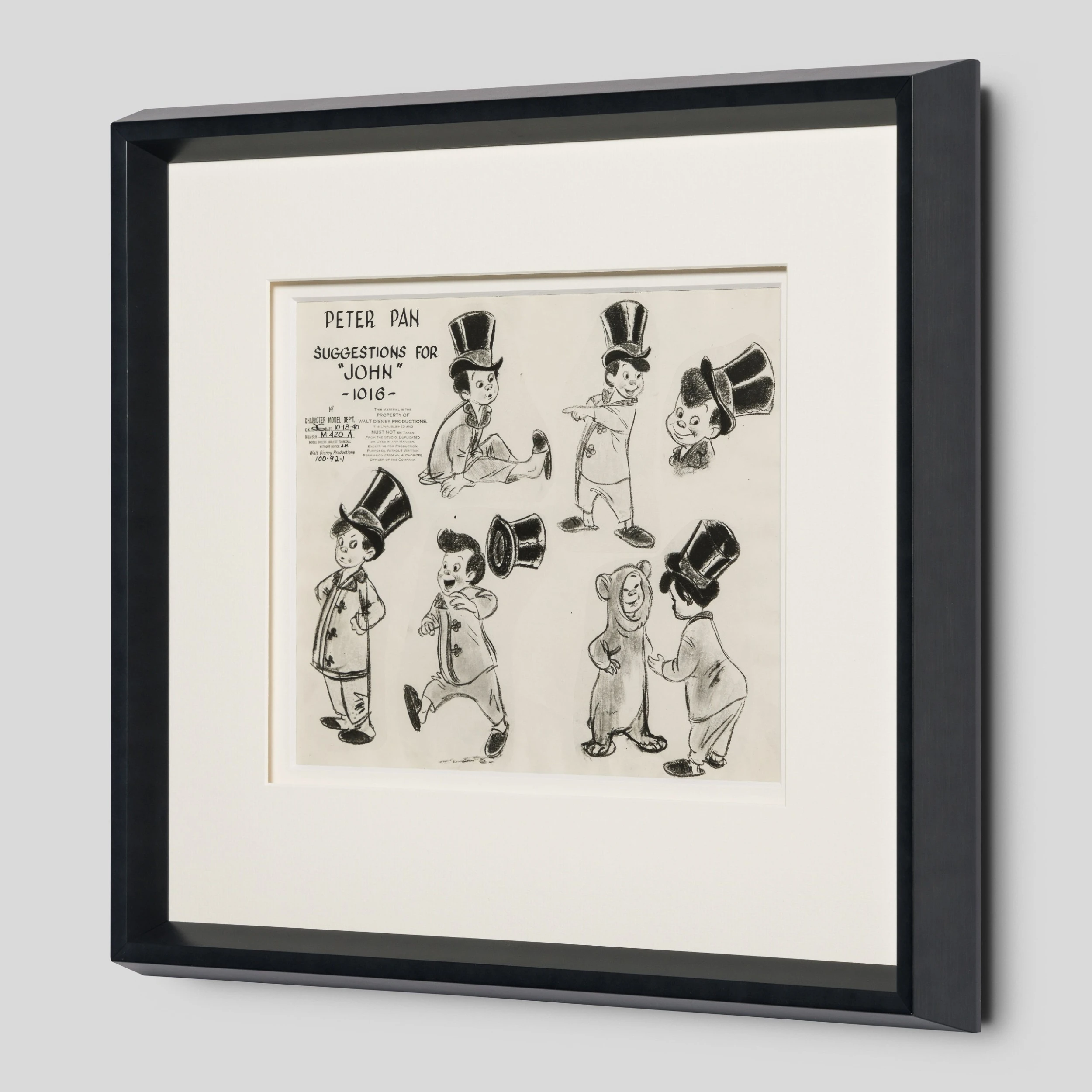 This authentic model sheet from the film’s production would have been used by animators at Walt Disney Studios for the character of John in Peter Pan. Displayed on its original, beautifully aged paper, this drawing showcases the artistic nature of the early animations and their warmly expressive forms. Now mounted and framed, this piece is the perfect way to add a sophisticated and muted touch of Disney magic to your home. Match with another drawing from our to create a perfect pair.