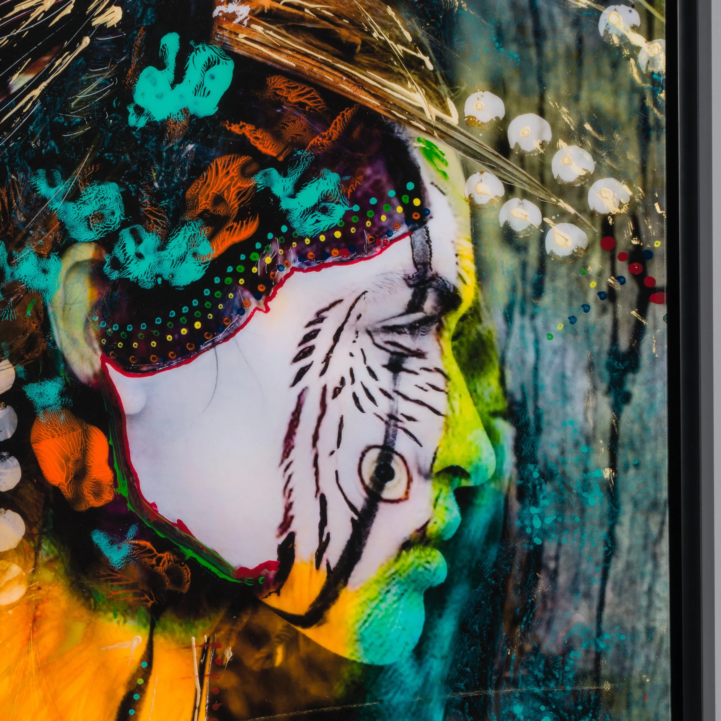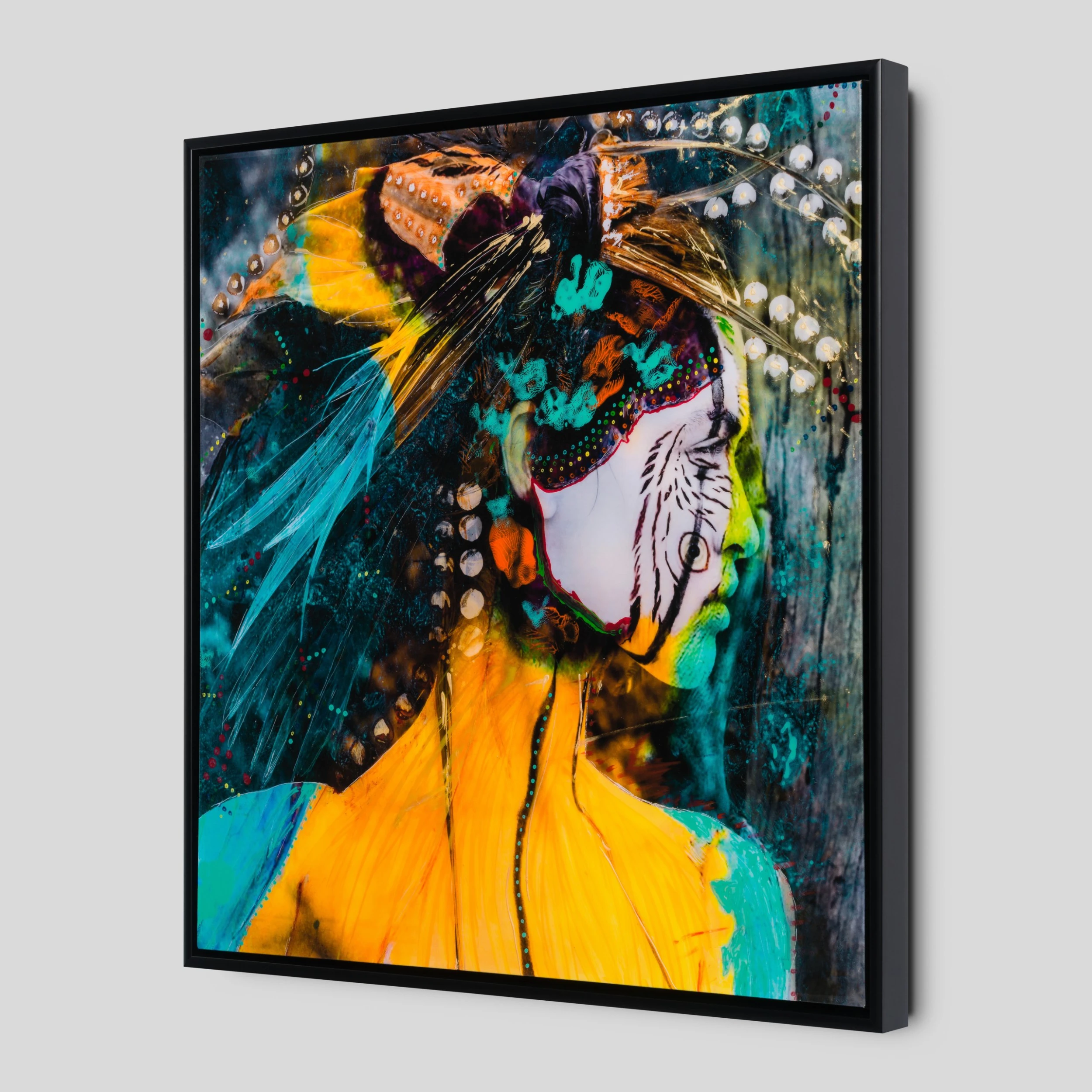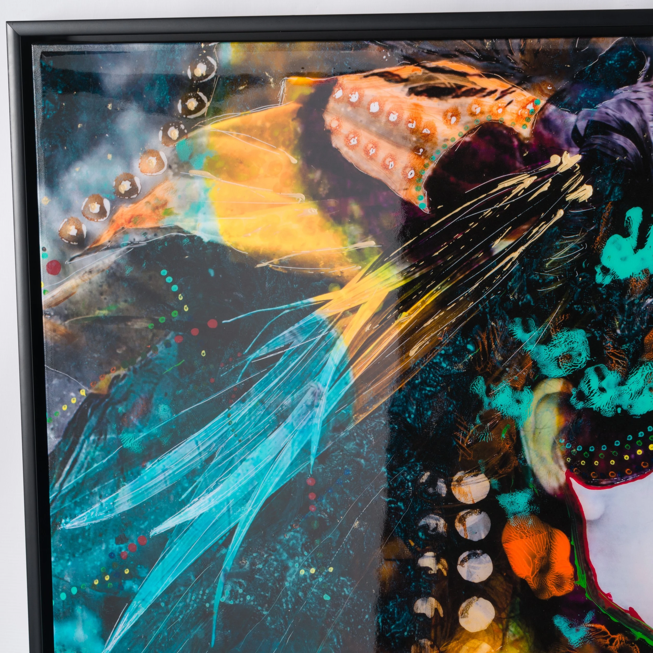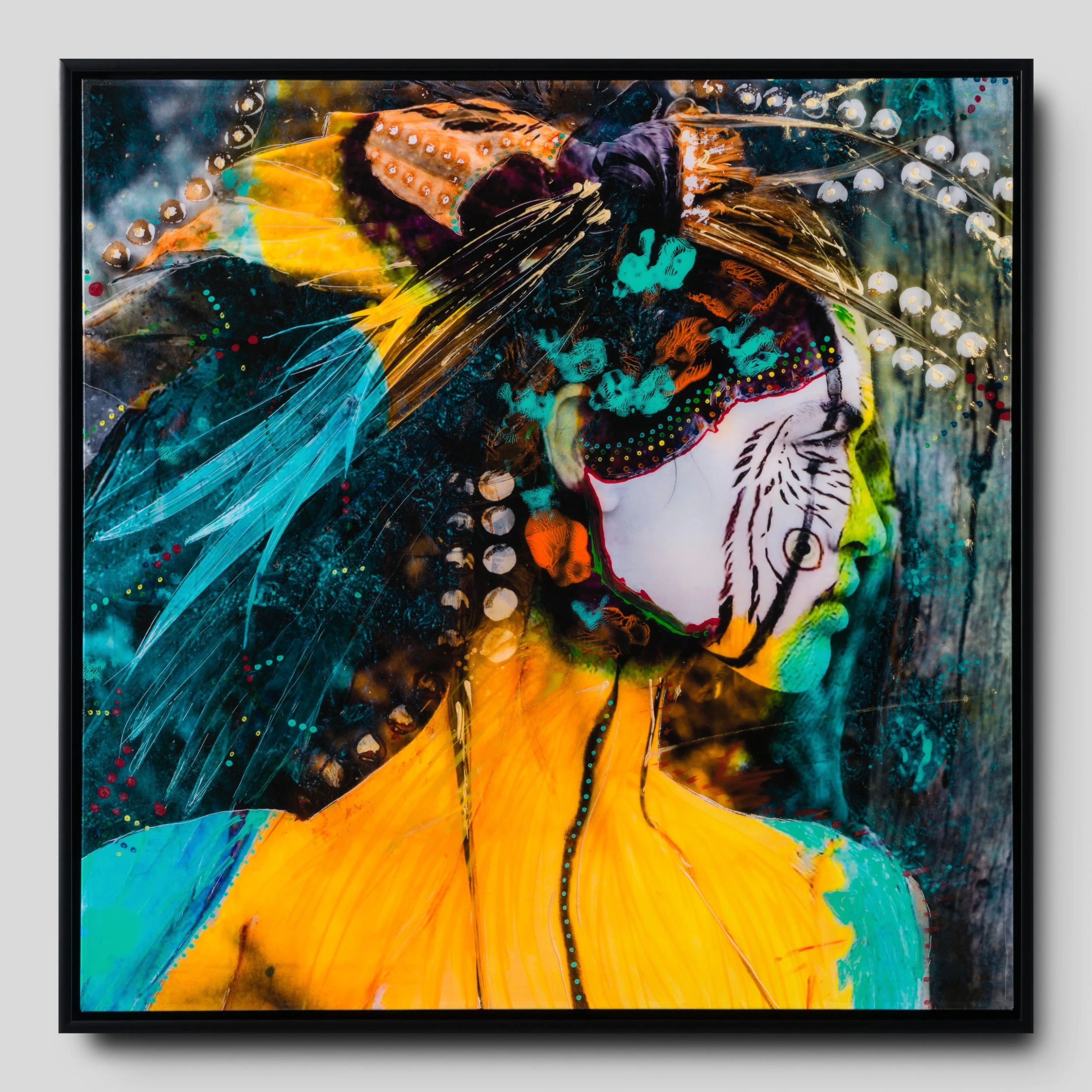 With Moroccan pigments and Vietnamese paints, Mazzucco’s pieces are characterised by the juxtaposition between wildlife and cultural photography, this incredible piece forms part of his introspective collection Grass Roots 2023. “Kigeni” started this new collection. The original bright colours occurred very naturally with the turquoise blues and yellows, which was different from monochromatic feel from previous collections. The Brazilian woman featured in the piece, named Paula, represents the celebration of humanity and life, and how one lives in their environment. The rich bright colours of blue, orange and yellow bring life into the art, representing the vibrant Brazilian culture through layers of photography, paint, and resin. Inspired in the Amazonian culture, this fine art print is full of brightness, life, light and colour with an exotic tribal feel.